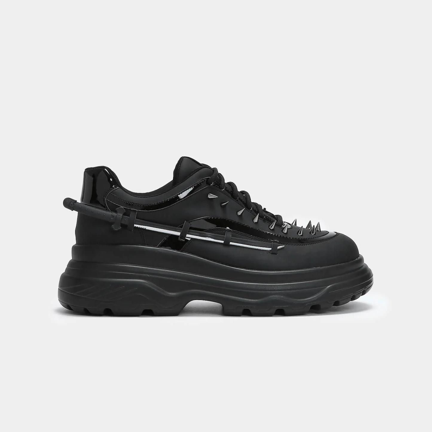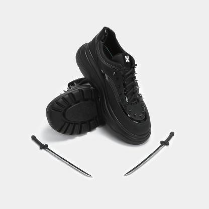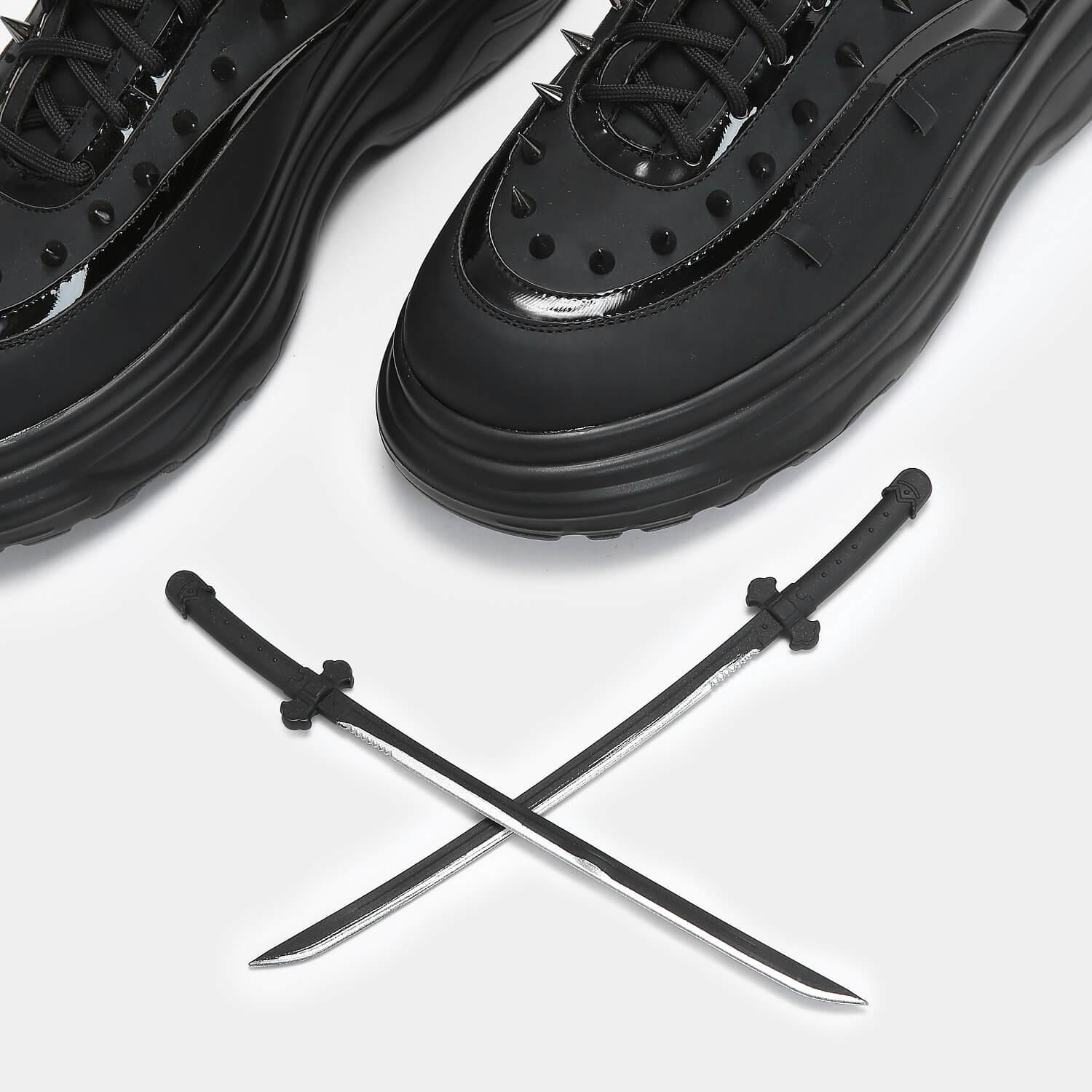 If innovation had a dance with malevolence, it would create a spectacle so formidable, it would create Takeda. A fusion of footwear and weaponry, on the surface, a chunky trainer adorned with spikes, however concealed within its very essence, a sword, which can be unsheathed in a soft, or harsh manner depending on your vivaciousness. The sword is imbued with a rubbery essence, rendering it both safe and sinister in equal measure.