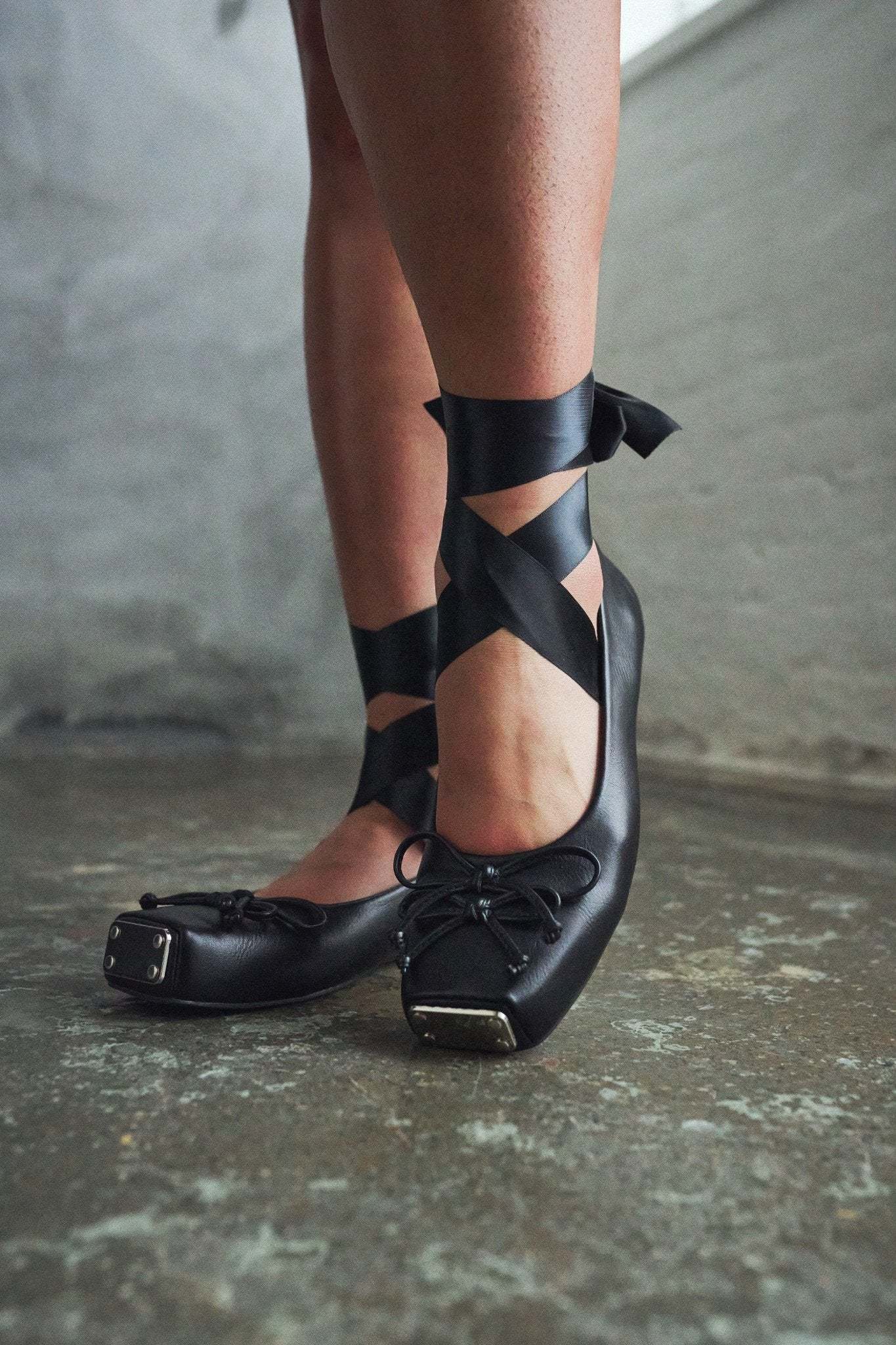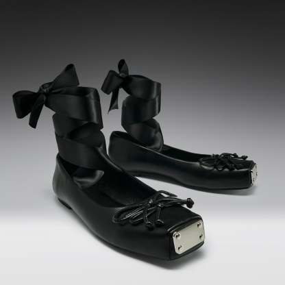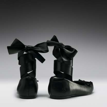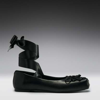 The upper is crafted from smooth black faux leather, paired with long silky ribbons that can be wrapped up the ankle or tied down depending on how you want to wear them.