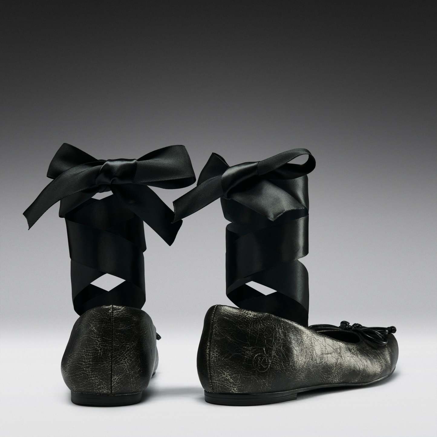 The upper is crafted from a unique 'cracked effect' smooth black and grey faux leather, paired with long silky ribbons that can be wrapped up the ankle or tied down depending on how you want to wear them.