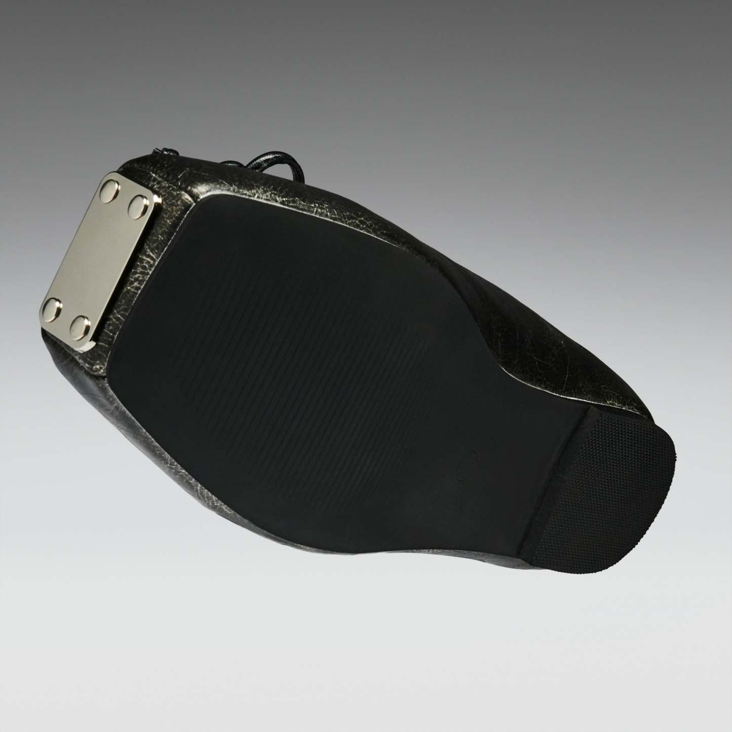 A polished metal plate sits across the front, this is a small, but sturdy piece of armour that contrasts the otherwise understated design. Subtle, but impossible to ignore.