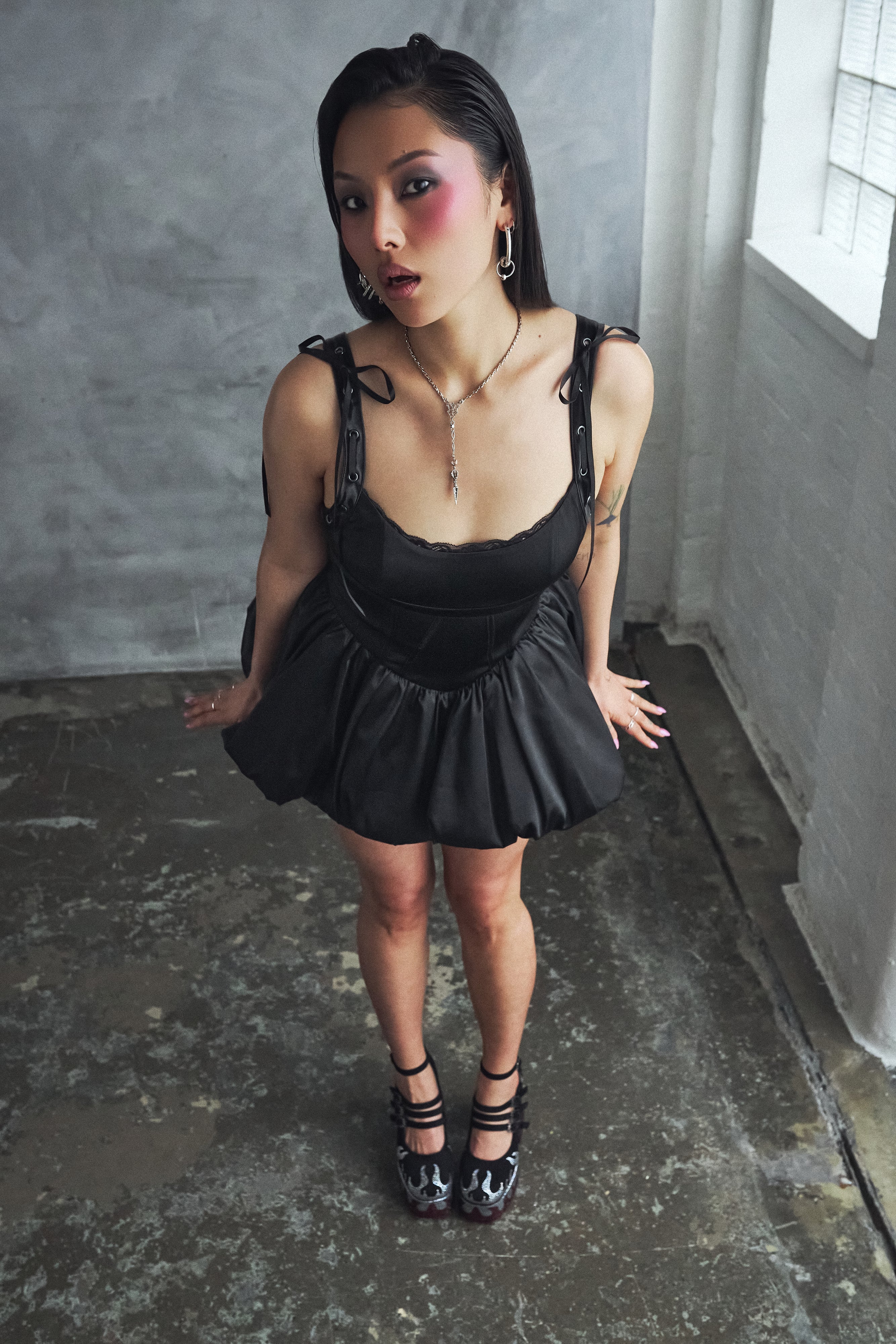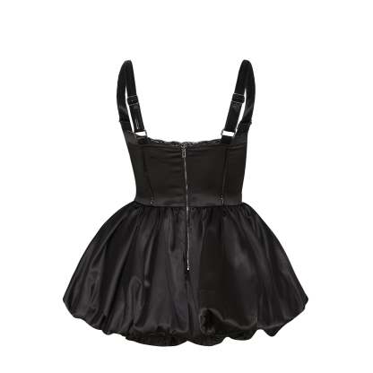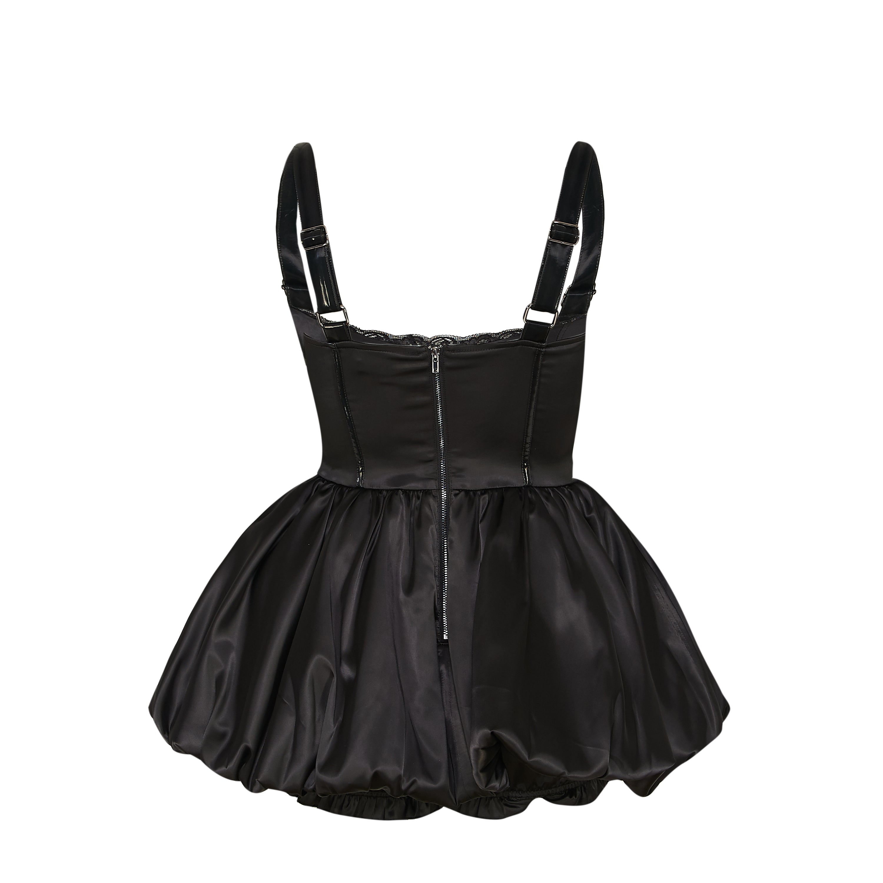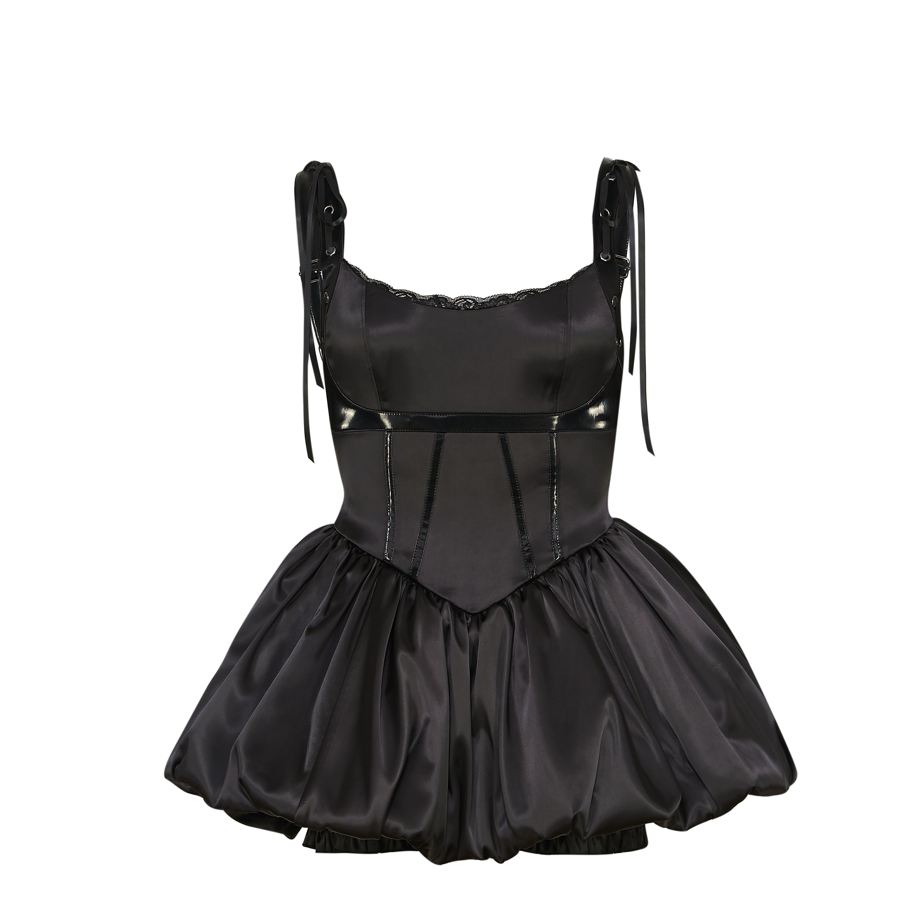 A satin corset playsuit with a bubble hem, because we wanted to build something that looked like a dress but moved like a romper.