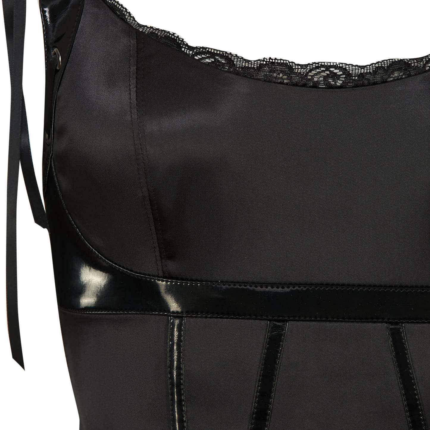 Adjustable lace-up straps sit at each shoulder, letting you control the fit and the look. Pull them tight for structure, loosen them for something more relaxed. The straps tie at the top with a small bow, adding a finishing detail that balances the sharpness of the bodice.