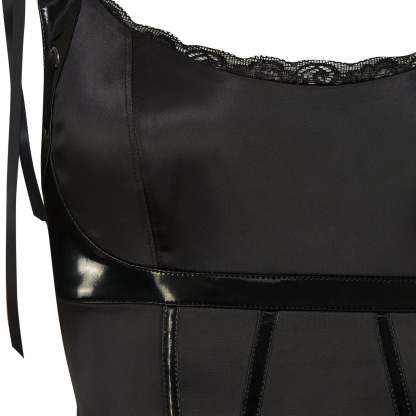 The Candy Cloud is built in two halves. The top is structured, with a fitted corset bodice in black satin that nips at the waist and holds its shape. Visible boning lines run down the front, giving it an architectural quality that reads as deliberate. A lace trim edges the neckline, softening the severity just enough.