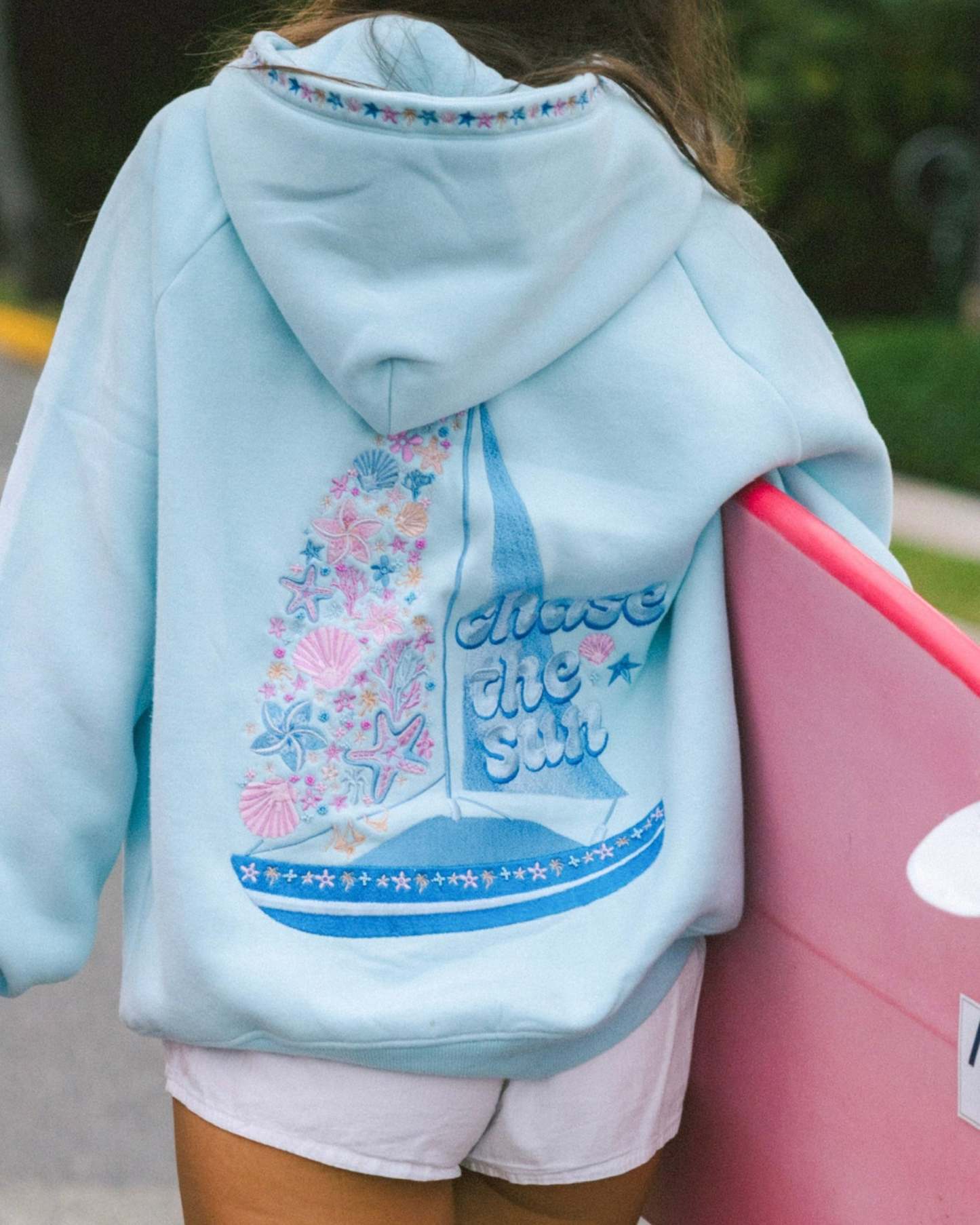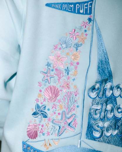 Set sail in comfort! With relaxed sleeves, this hoodie wraps you in warmth for every journey ahead. Finished with intricate beading details that catch the light; Chase the Sun is inspired by the glow just before dusk, the quiet moments between waves and light finding its way back.