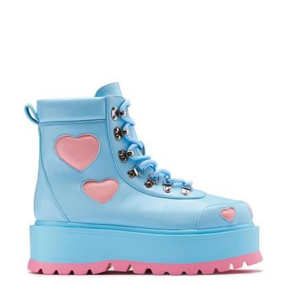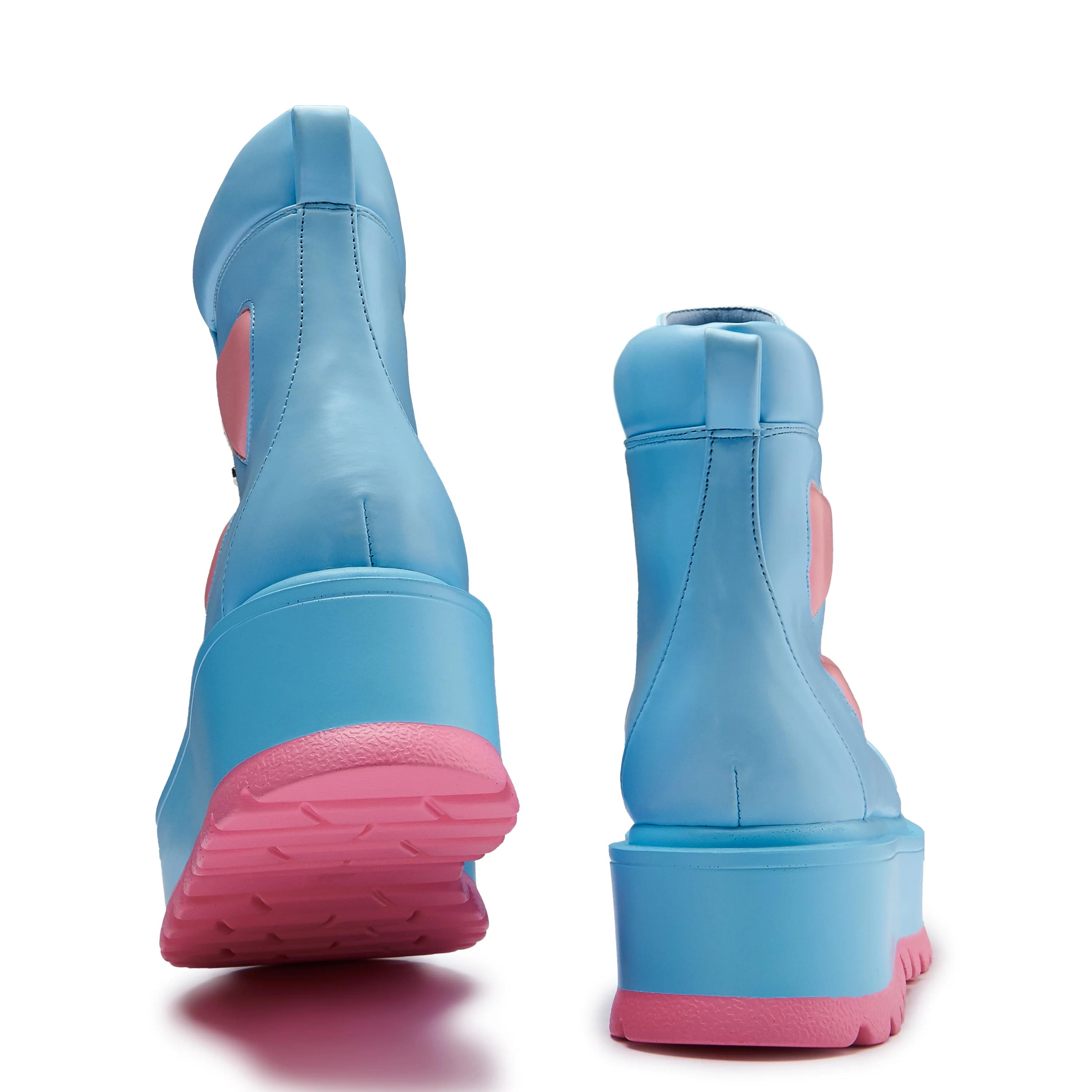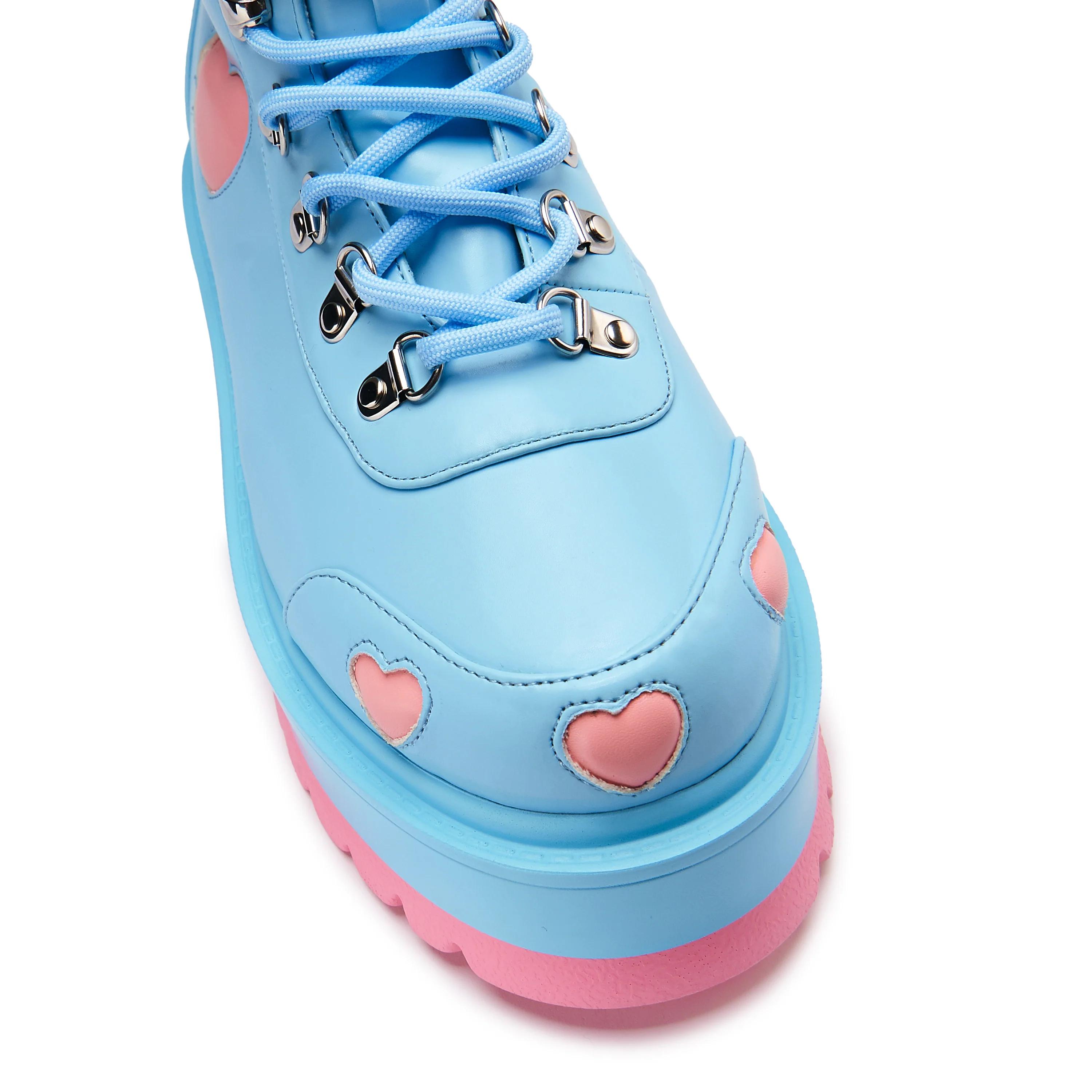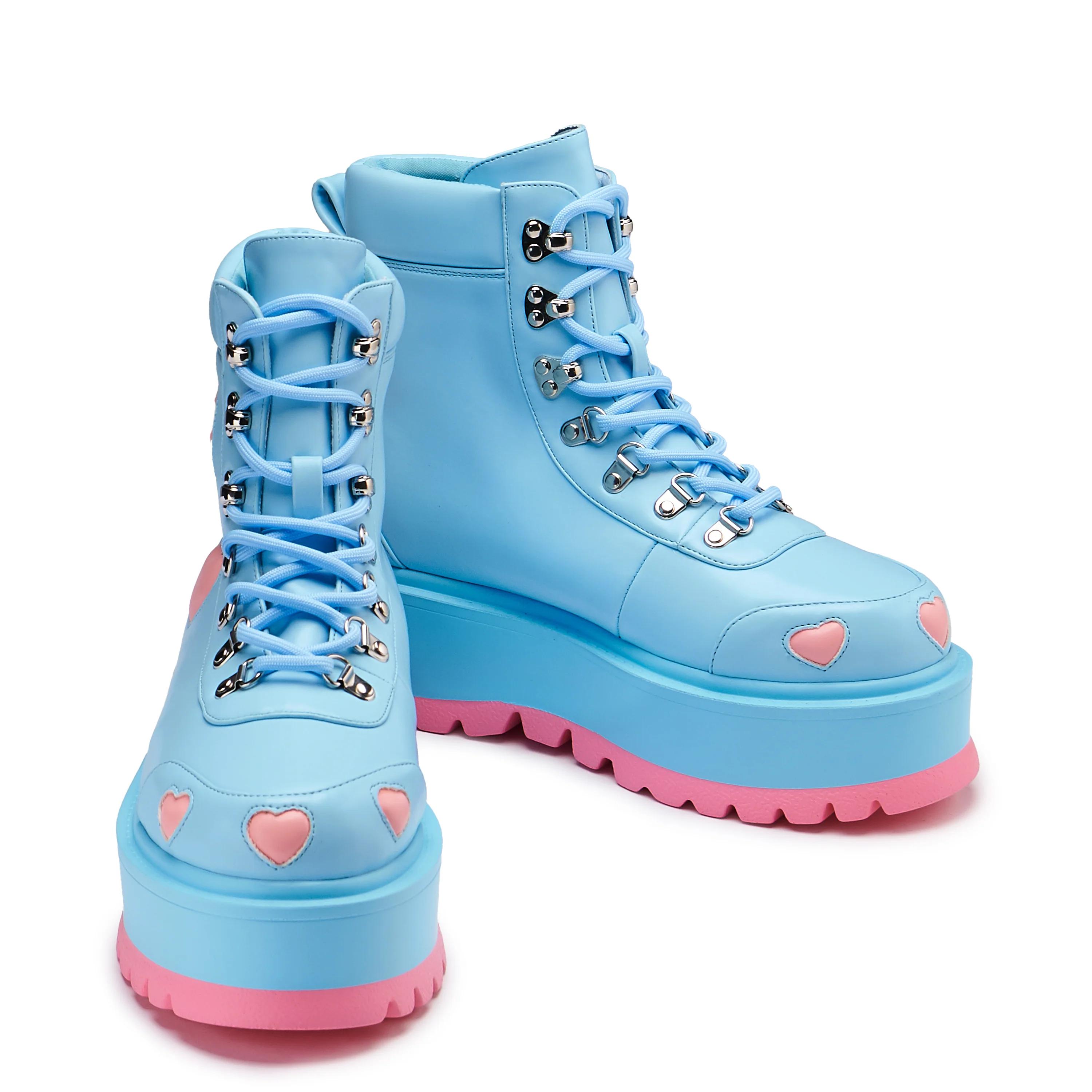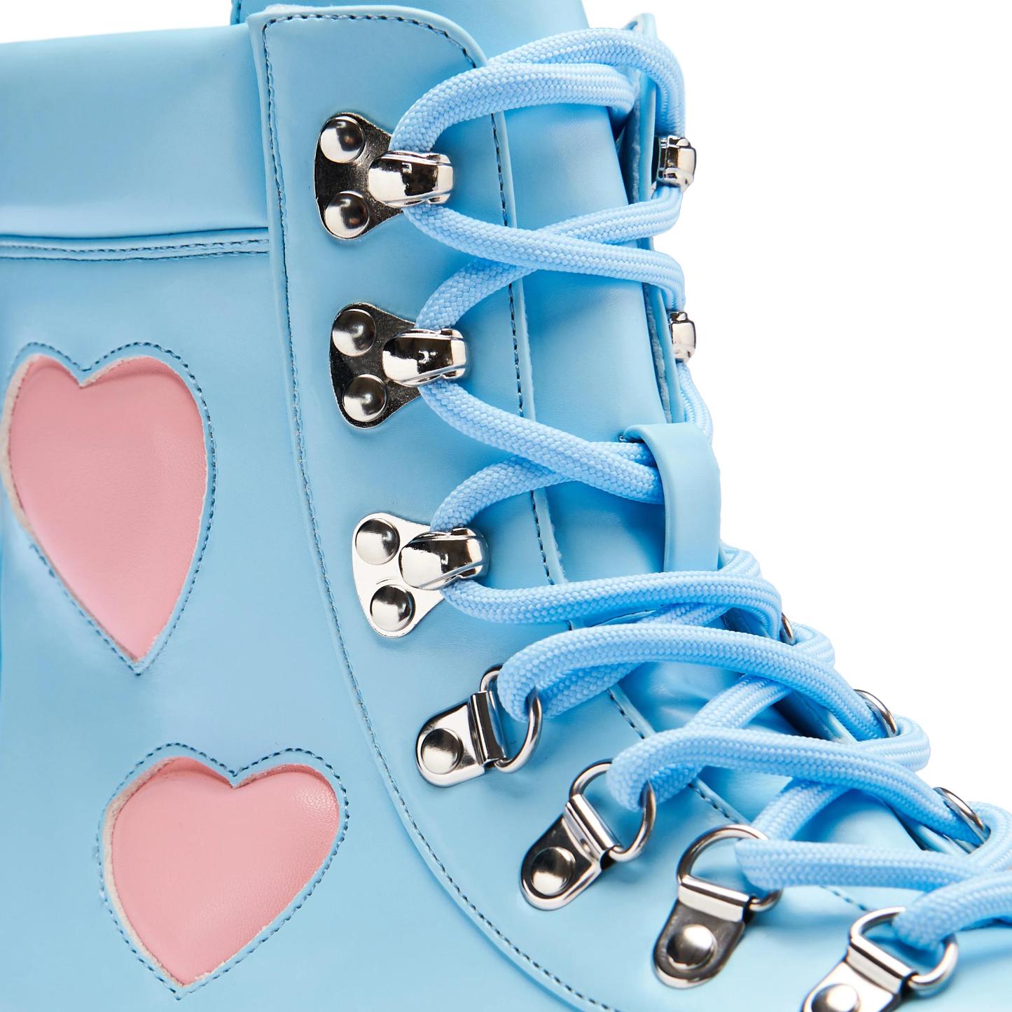 Our Hydra boots have taken a journey to the skies with the cherubs and returned with a sweet, playful twist. A sky-blue upper and outsole meet soft baby pink accents, creating a dreamy color palette. Side cutouts reveal 3D padded hearts in pink, with these heart-shaped details continuing along the toe. The adorable design elements contrast beautifully with the rugged hiking boot silhouette, blending toughness with charm. Made from our soft vegan leather, these boots will have you falling in love as if Cupid��s arrow struck your heart.