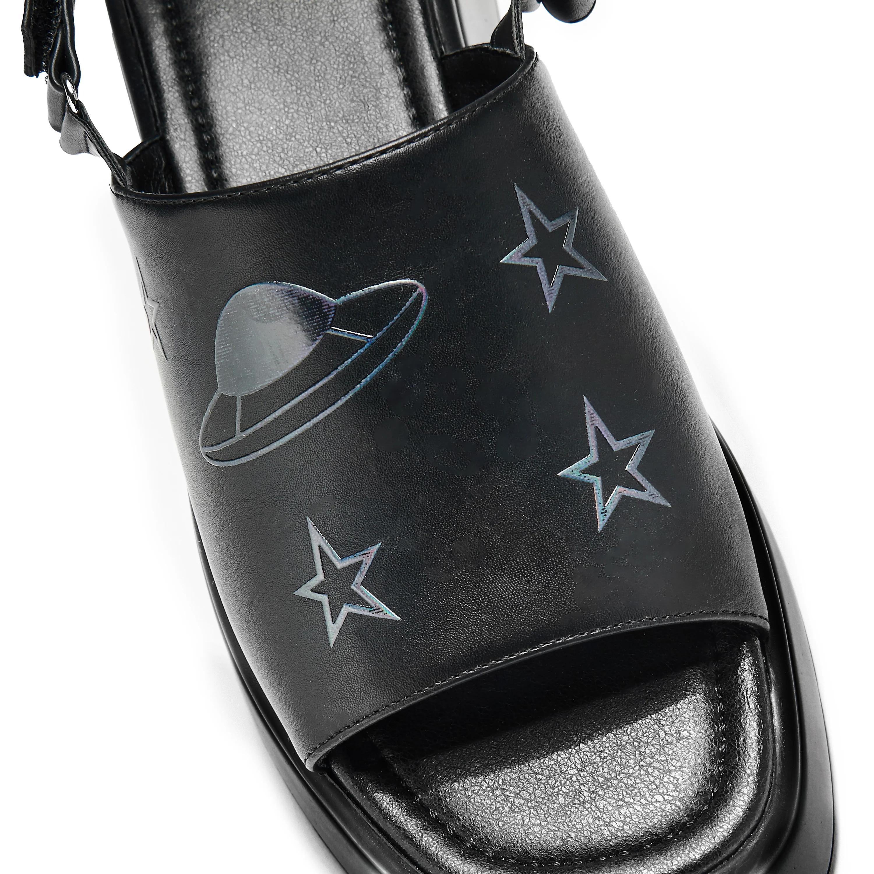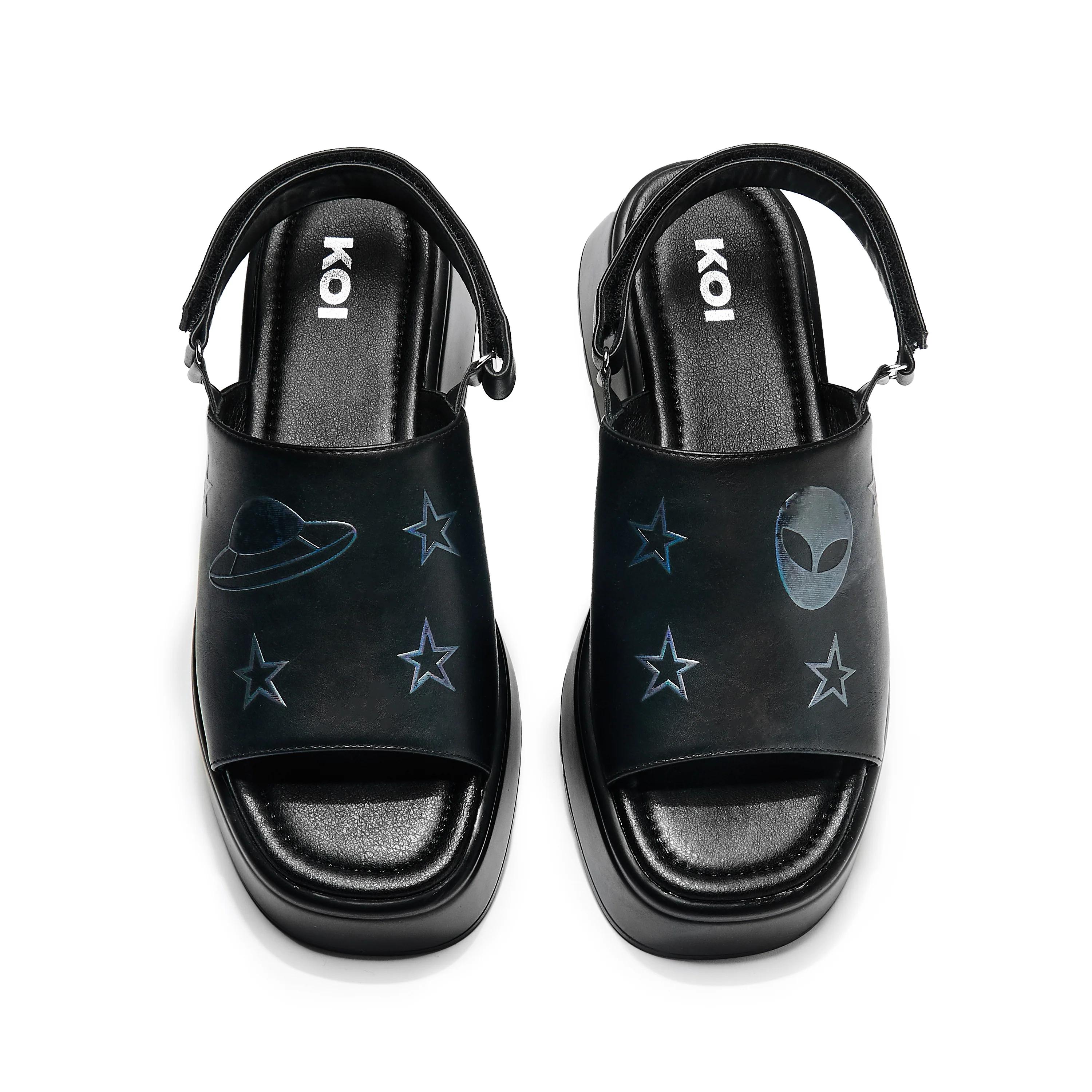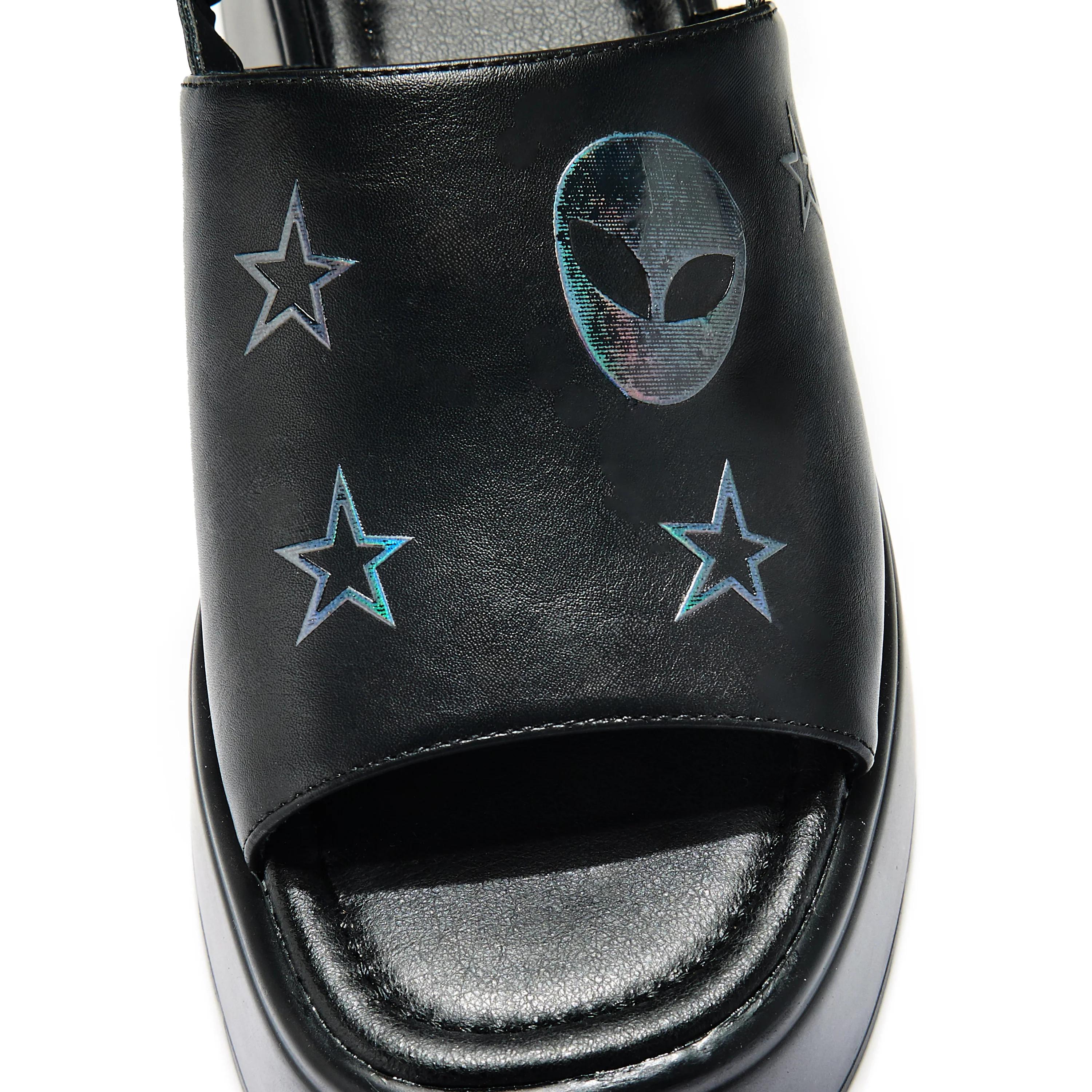 Conquer the unknown with the bold Departed Aliens Slingback Sandals! These black sandals feature an adjustable strap for a secure fit and are adorned with an otherworldly alien print. With a chunky platform, these sandals are perfect for taking on any challenge with style.