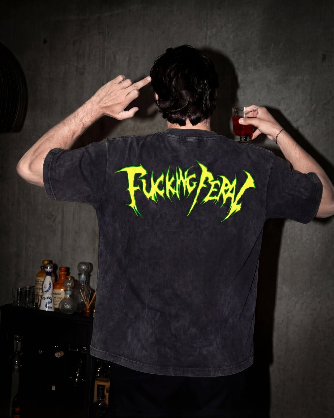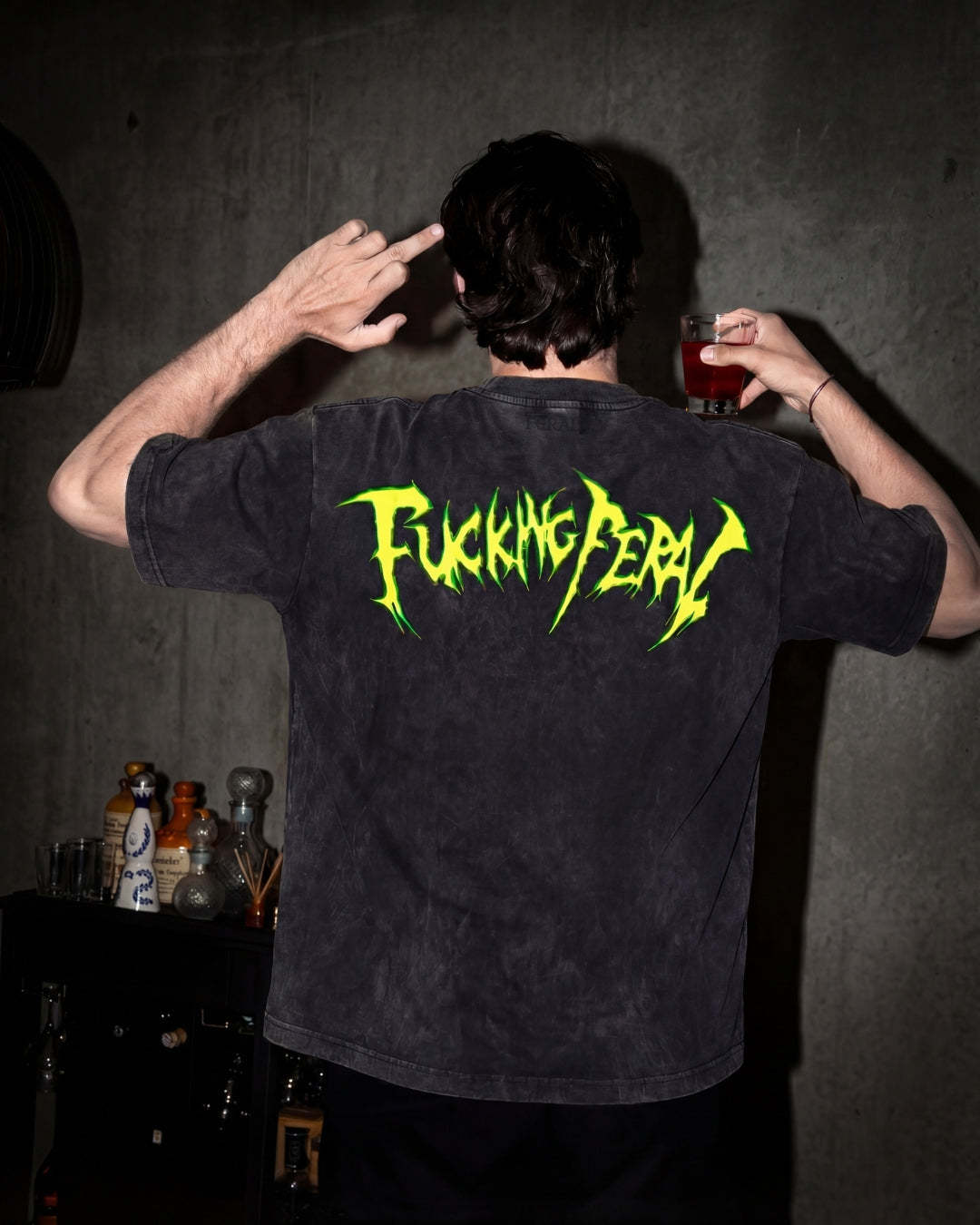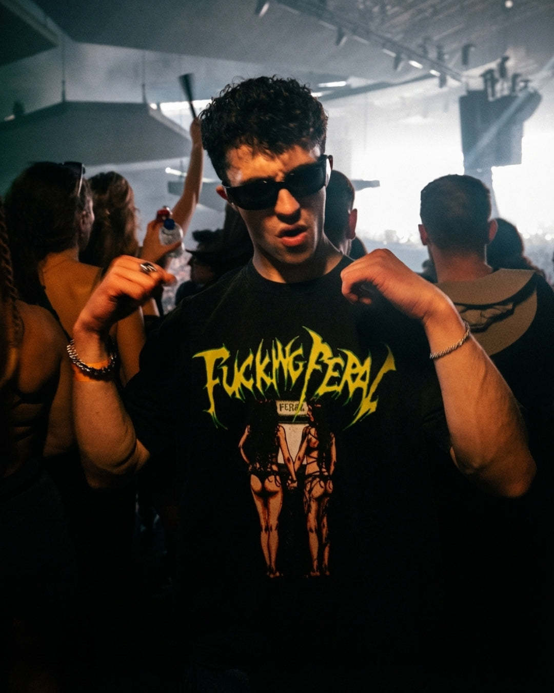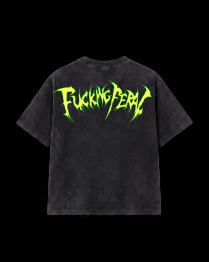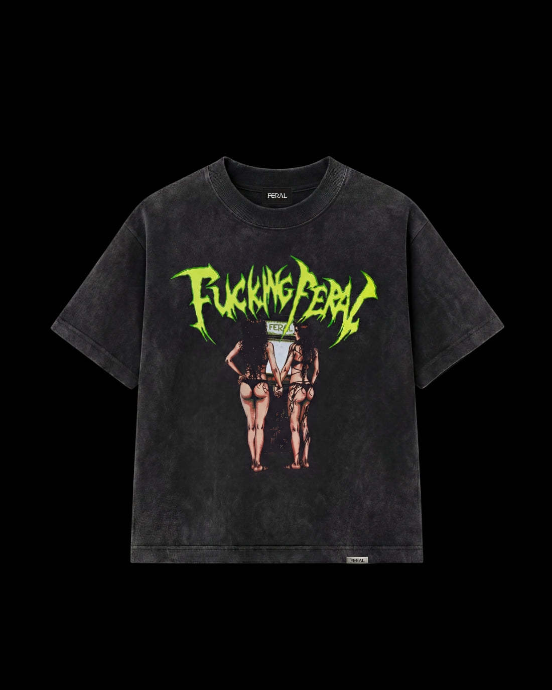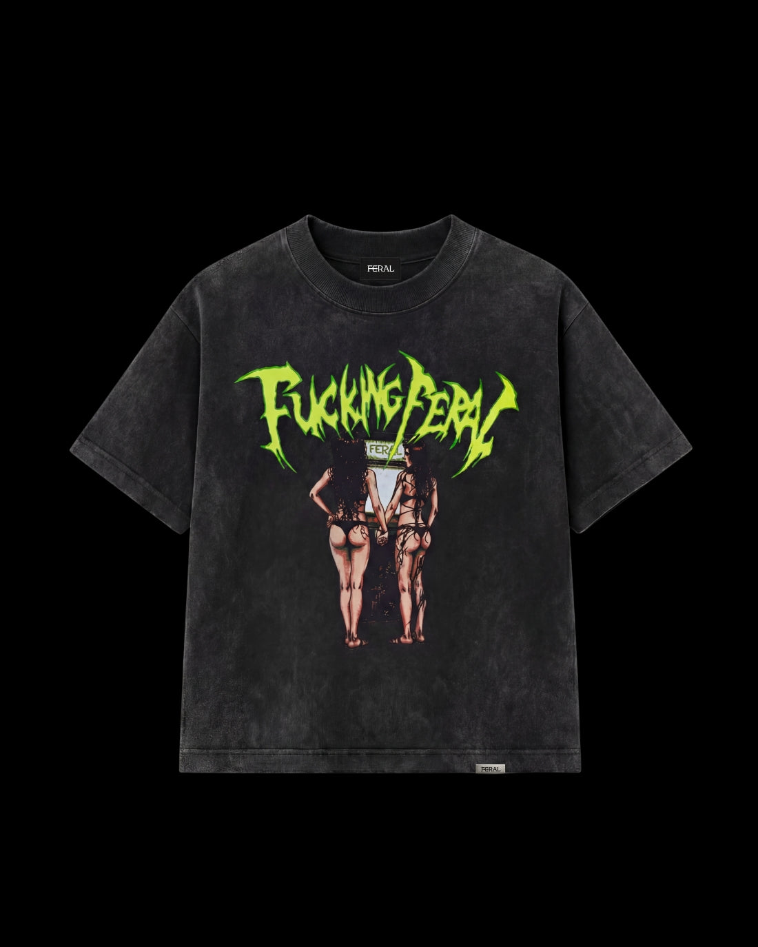 Premium 240gsm luxury stone wash cotton tee featuring the vintage effect Feral Arcade Girls on the front, with matching typographic "Fucking Feral" slogan on the back. Unisex fit, rave-ready.