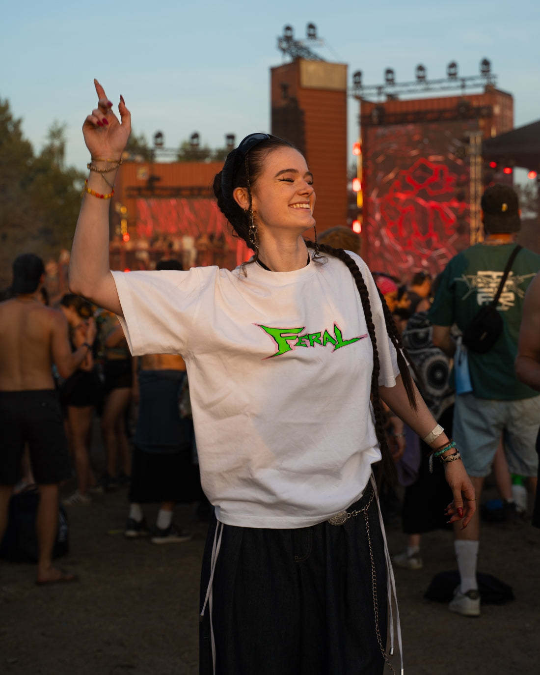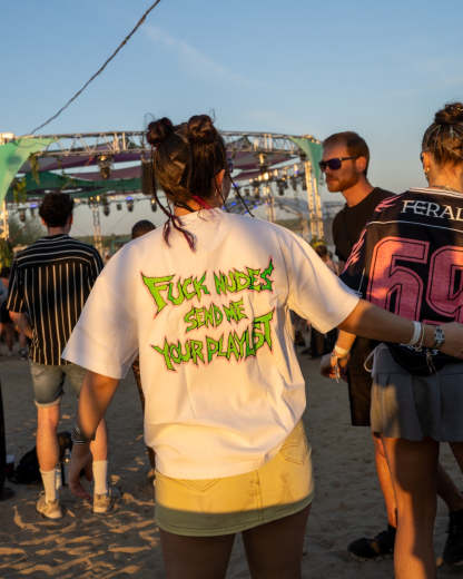 Premium 240gsm luxury white cotton tee featuring the original viral slogan "FUCK NUDES SEND ME YOUR PLAYLIST" on the back and matching FERAL logo on front. Unisex fit, rave-ready.