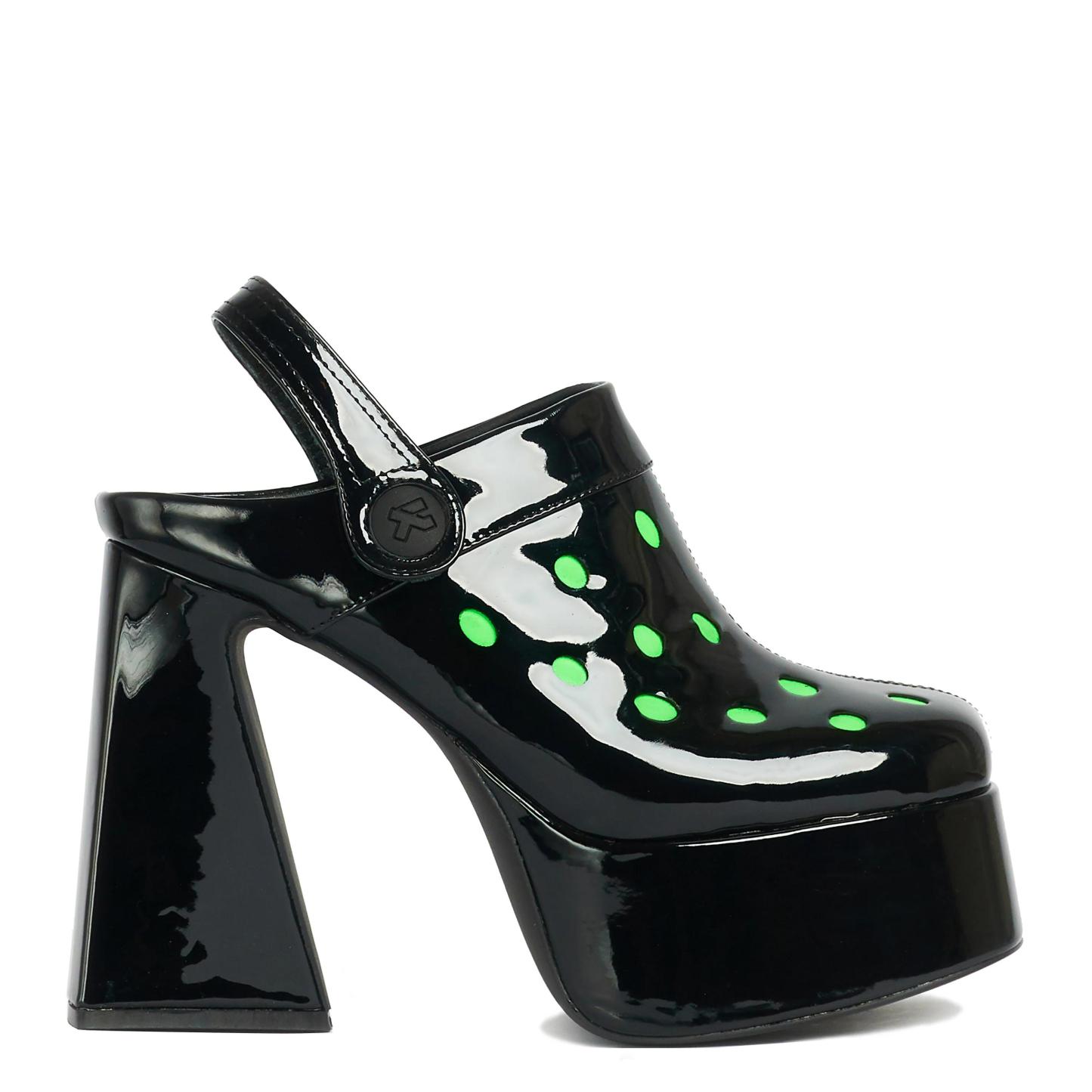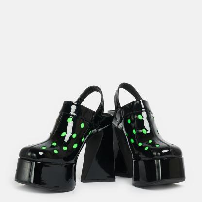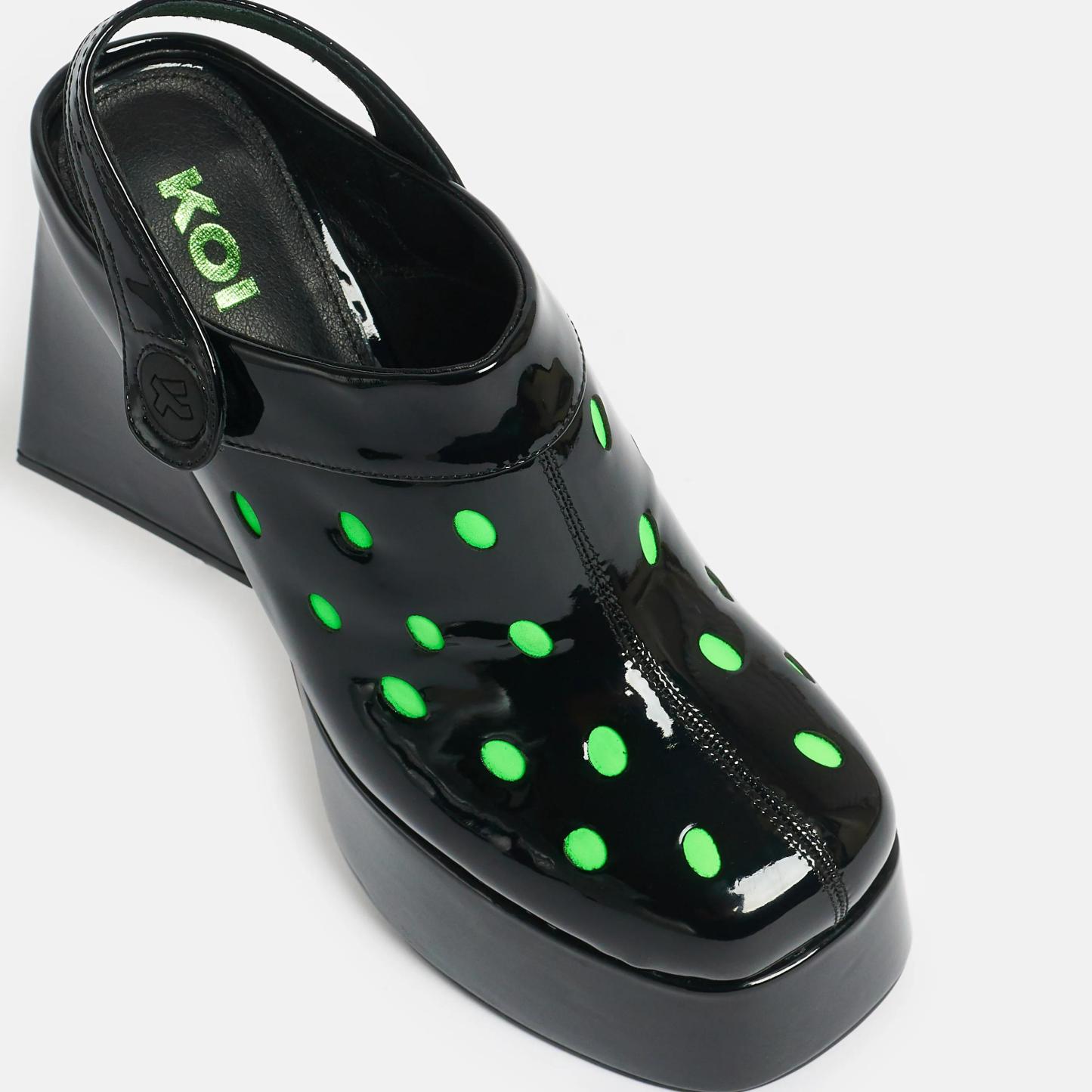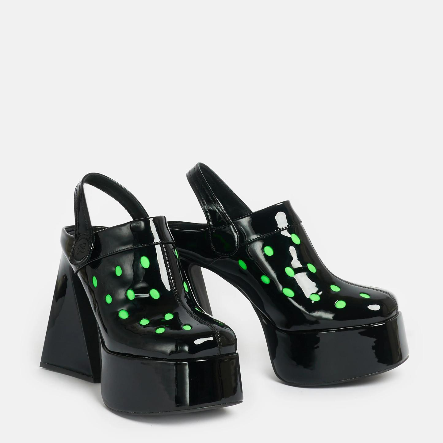 The Galactic Boom Neon Alien Heels feature a black patent platform and neon green cut outs for a fun, futuristic look. Perfect for every occasion, these heels are sure to make a statement and stand out from the crowd.