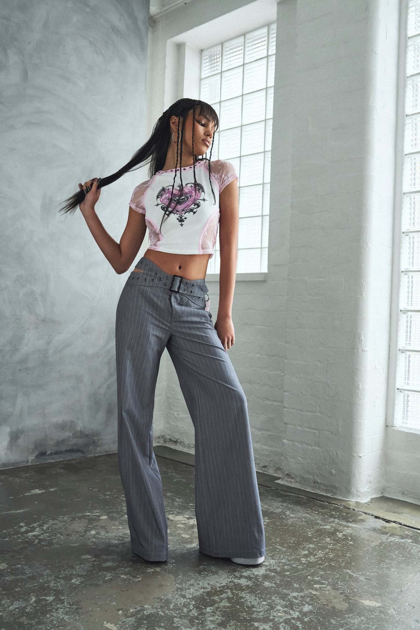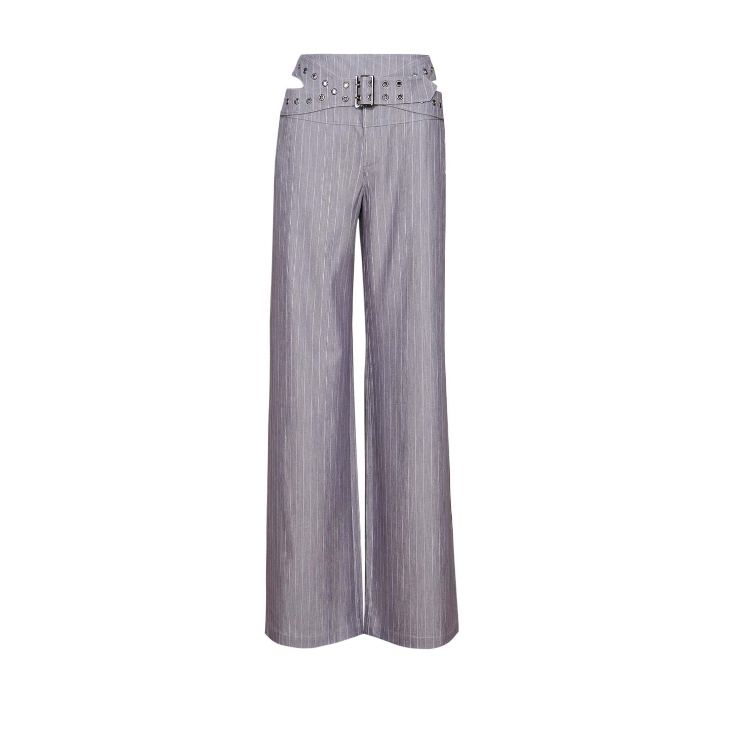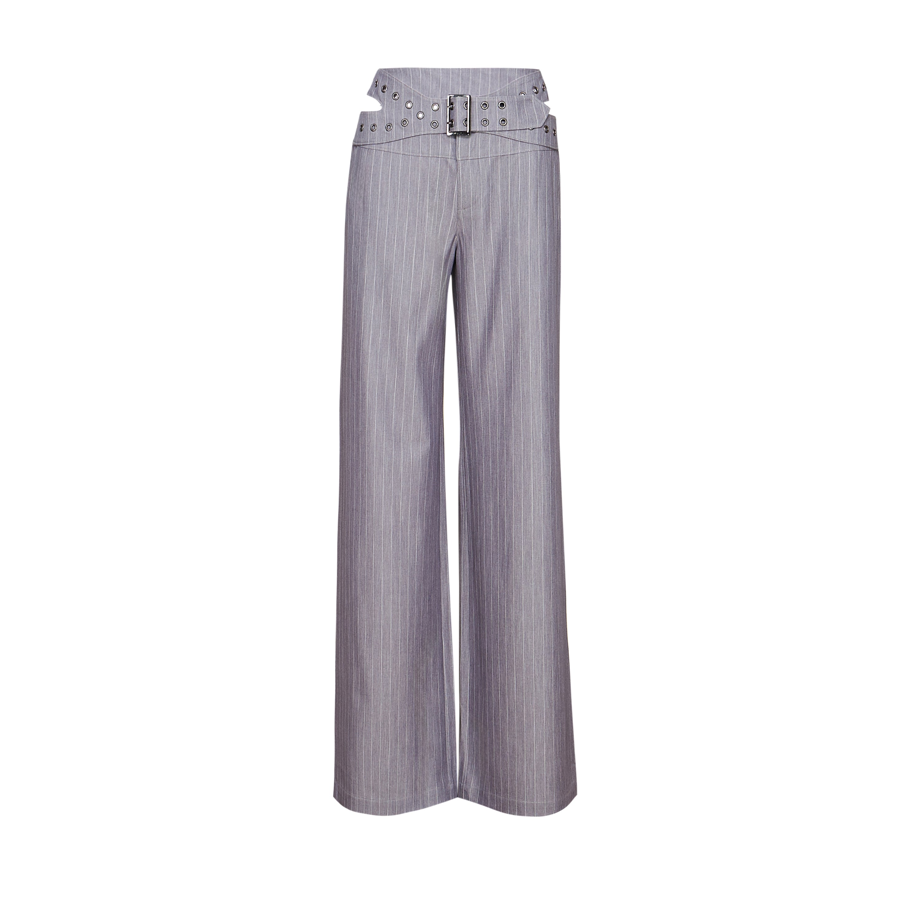 Wide leg pinstripe trousers with an eyelet belt waistband, because we wanted tailoring that didn’t play by the rules.