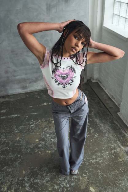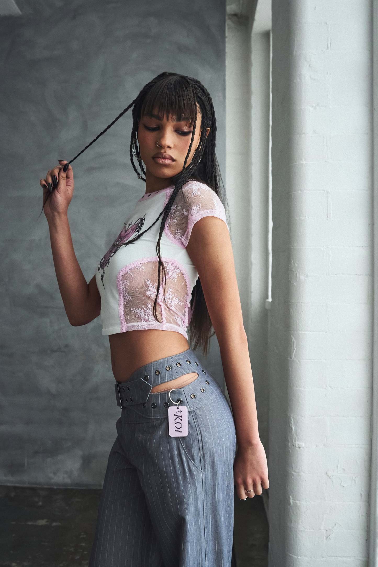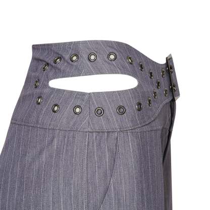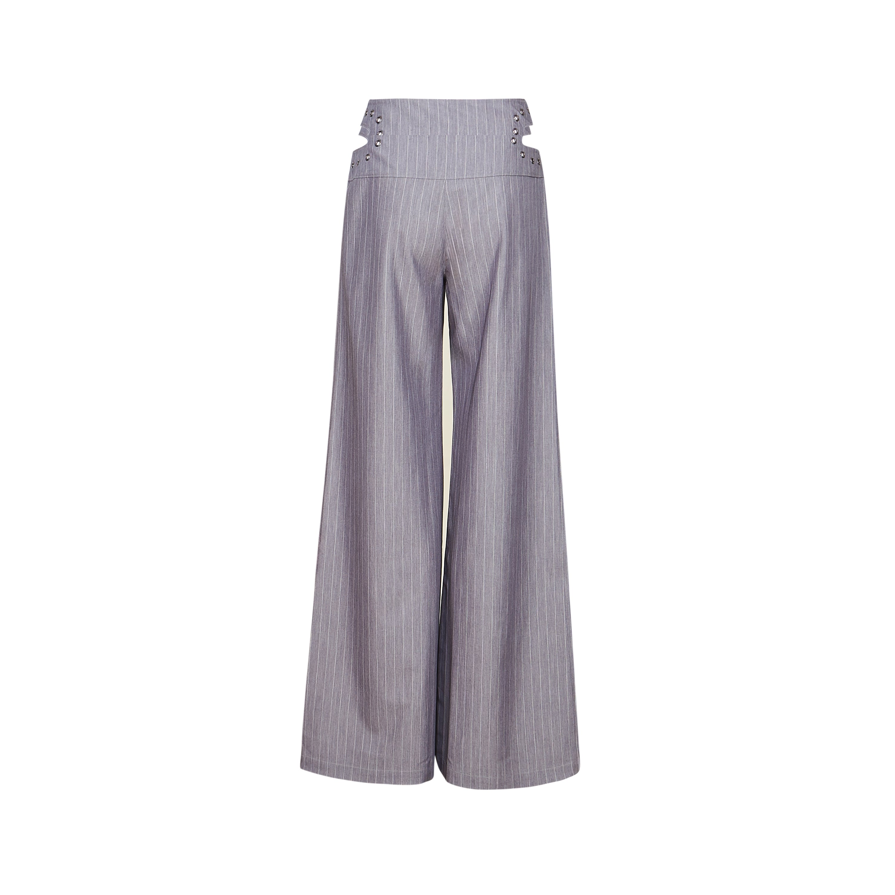 Wide leg pinstripe trousers with an eyelet belt waistband, because we wanted tailoring that didn’t play by the rules.