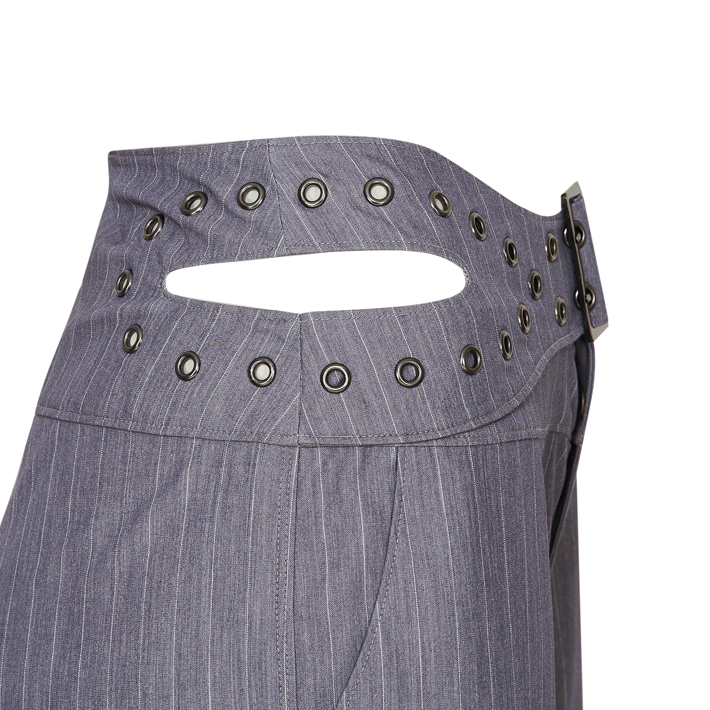 An integrated eyelet belt wraps the high waist with a metal buckle fastening, adding hardware to what would otherwise read as straightforward tailoring. Cut out sections sit at each hip, breaking the waistline and tying the piece back to the collection’s signature detailing.