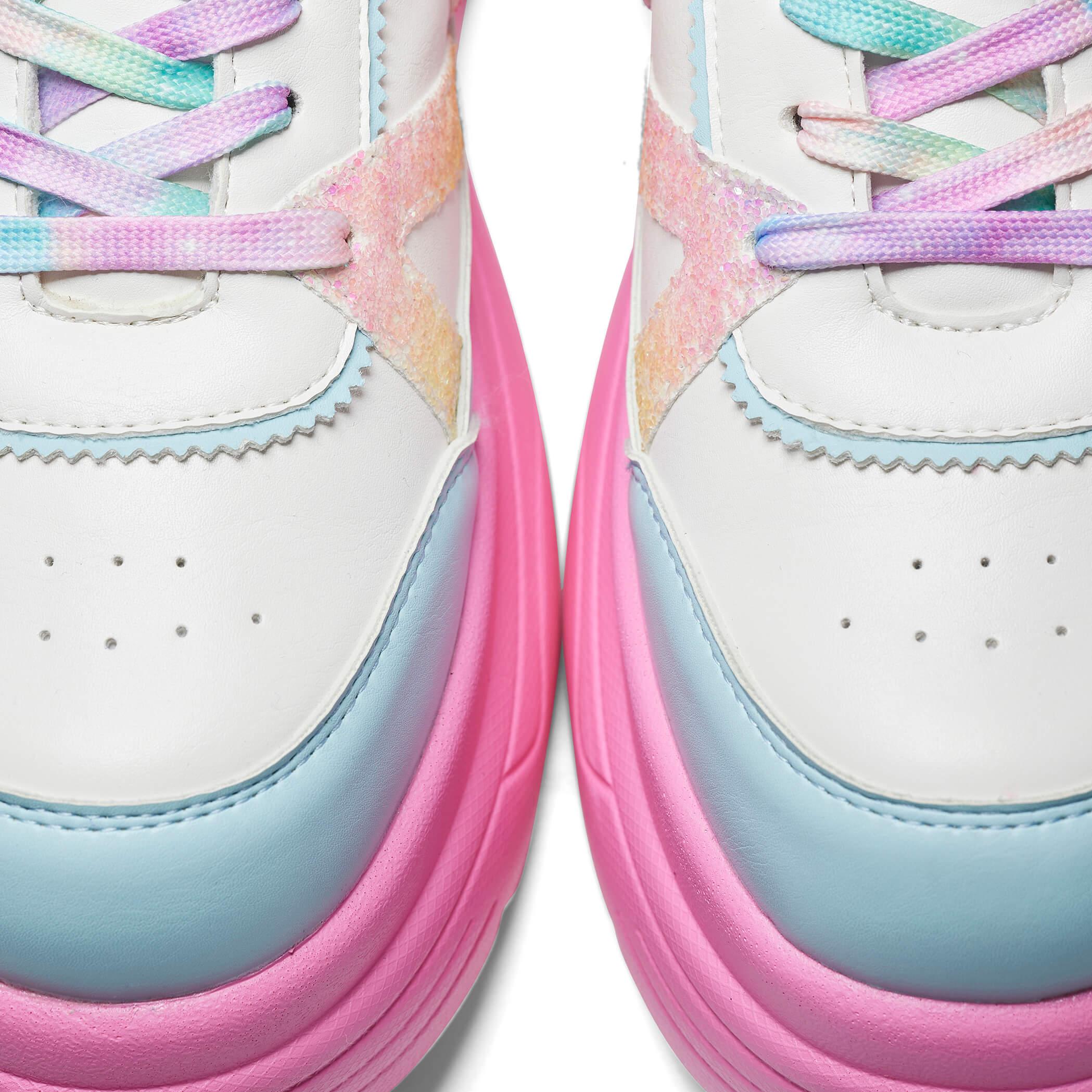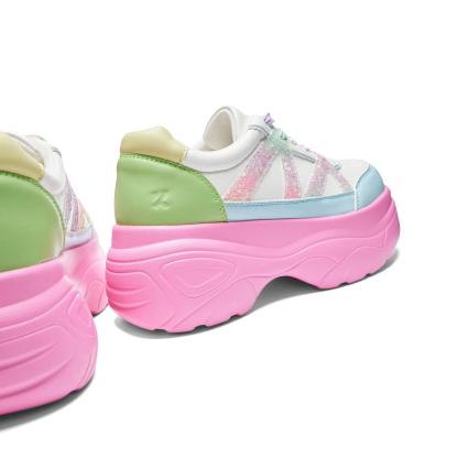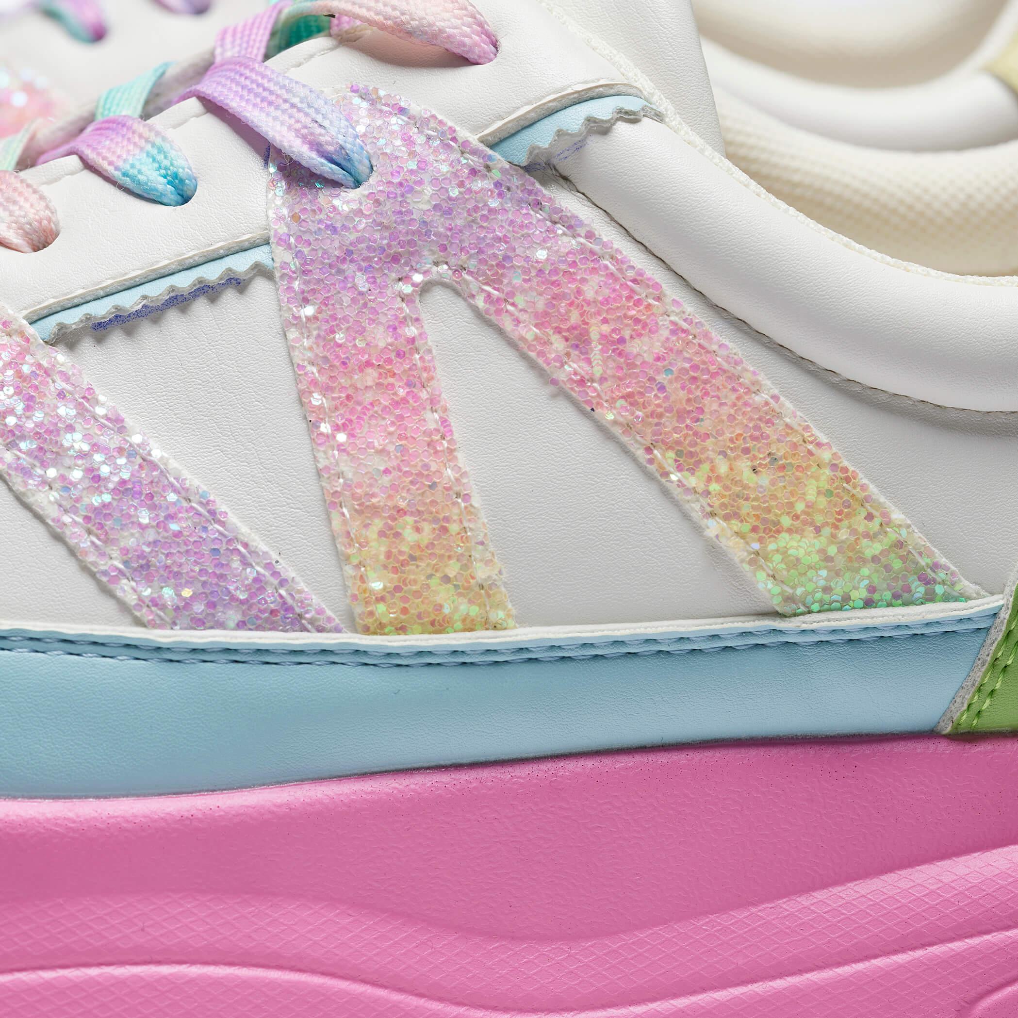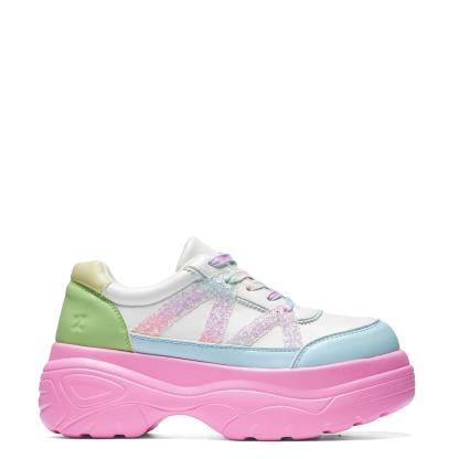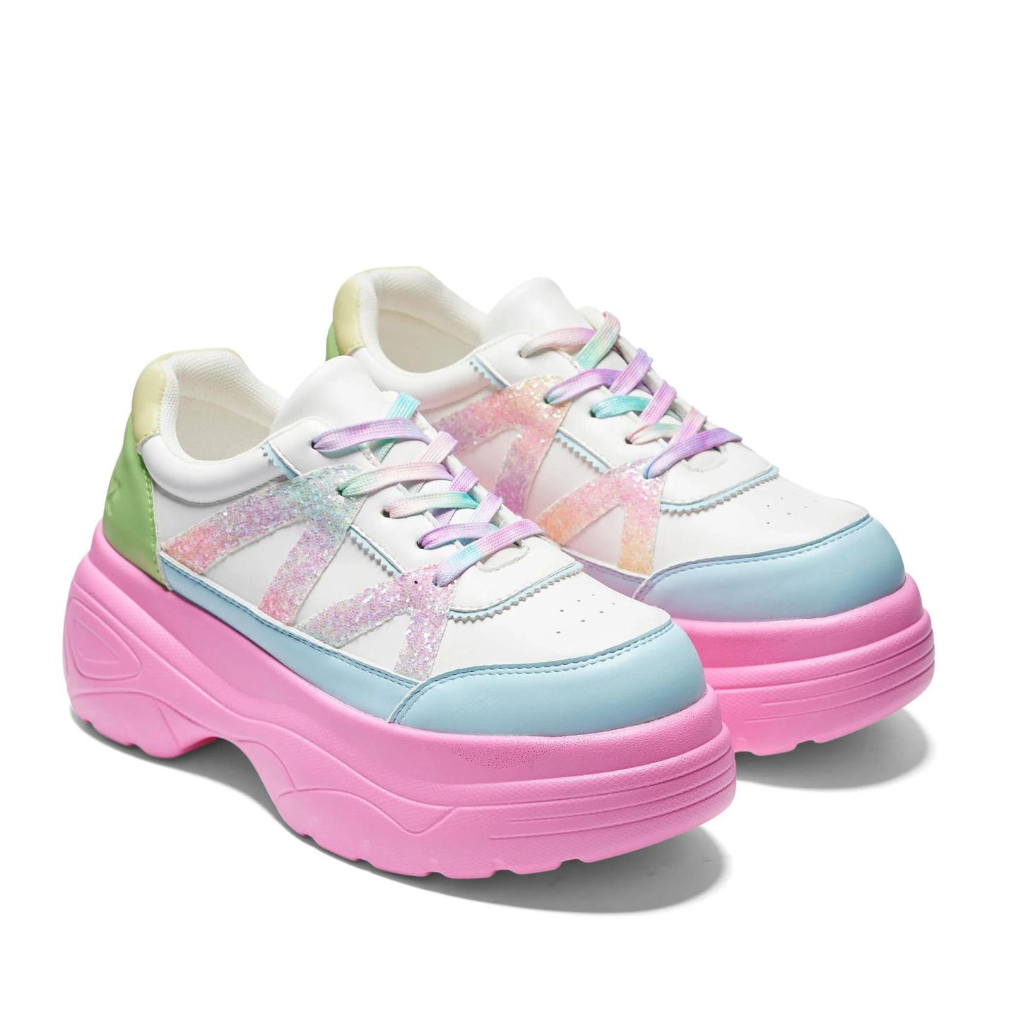 Add a pop of color to your shoe collection with our Gummy Glow Worm Chunky Trainers. The chunky platform not only adds a trendy touch, but also provides extra height and comfort. Featuring a playful combination of white, green, blue, and pink, these trainers are sure to make a statement. (Trust us, they'll be the talk of the town!)