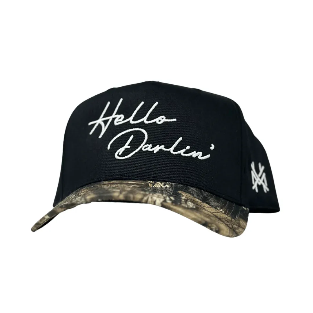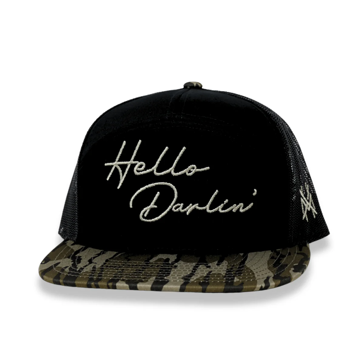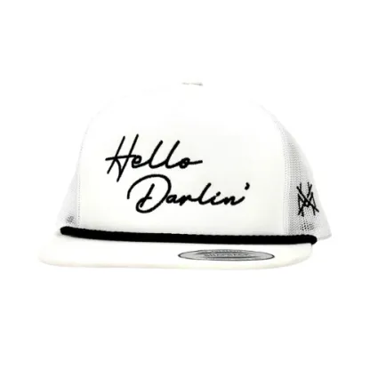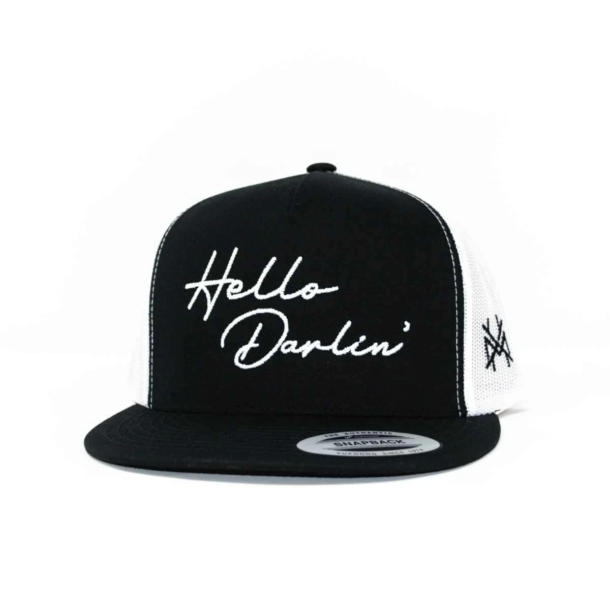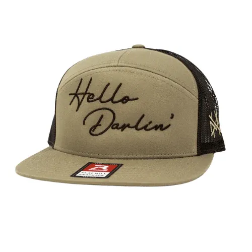 Hello Darlin�?Snapback Hat This snapback says Hello Darlin�?�?smooth, confident, and a little Southern charm. Built for easy conversations and laid-back style. Stitched in Georgia, the Hello Darlin�?Snapback blends classic design with everyday comfort. Whether you’re starting something or just saying hi, this hat fits right in. Featuring a structured front and offered in Trucker, 7 Panel, Retro, and Flat Bill styles, it delivers a consistent fit and durable build. The adjustable snapback closure ensures all-day wear. Key Features: “Hello Darlin’�?embroidery with premium stitching Structured front for a classic snapback fit Available in Trucker, 7 Panel, Retro, and Flat Bill styles Adjustable snapback closure for a customized fit Stitched in Georgia for long-lasting quality Say it slow.
