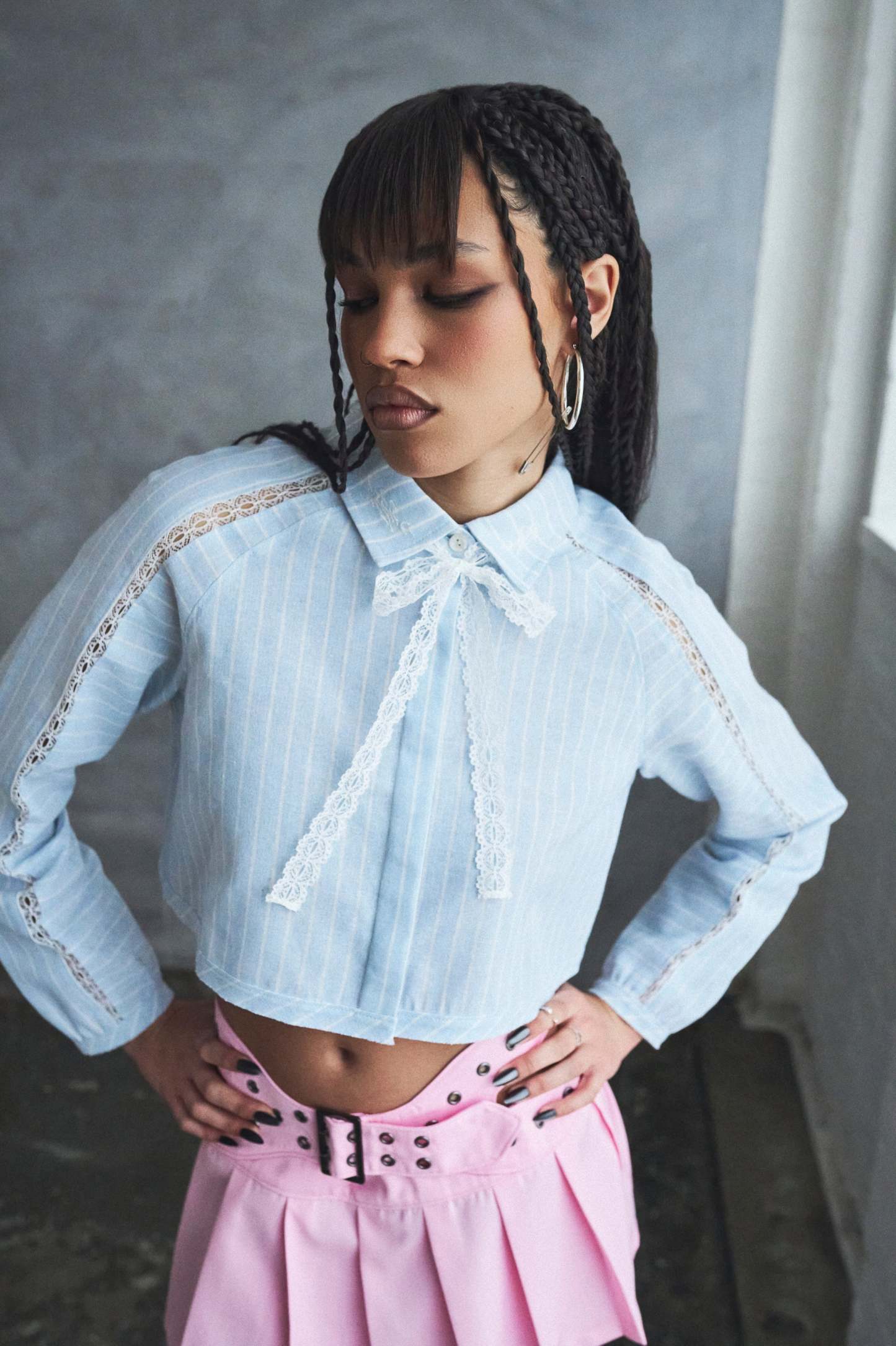 A cropped pinstripe shirt with lace insets, because we wanted to make something that felt polished and undone at the same time.