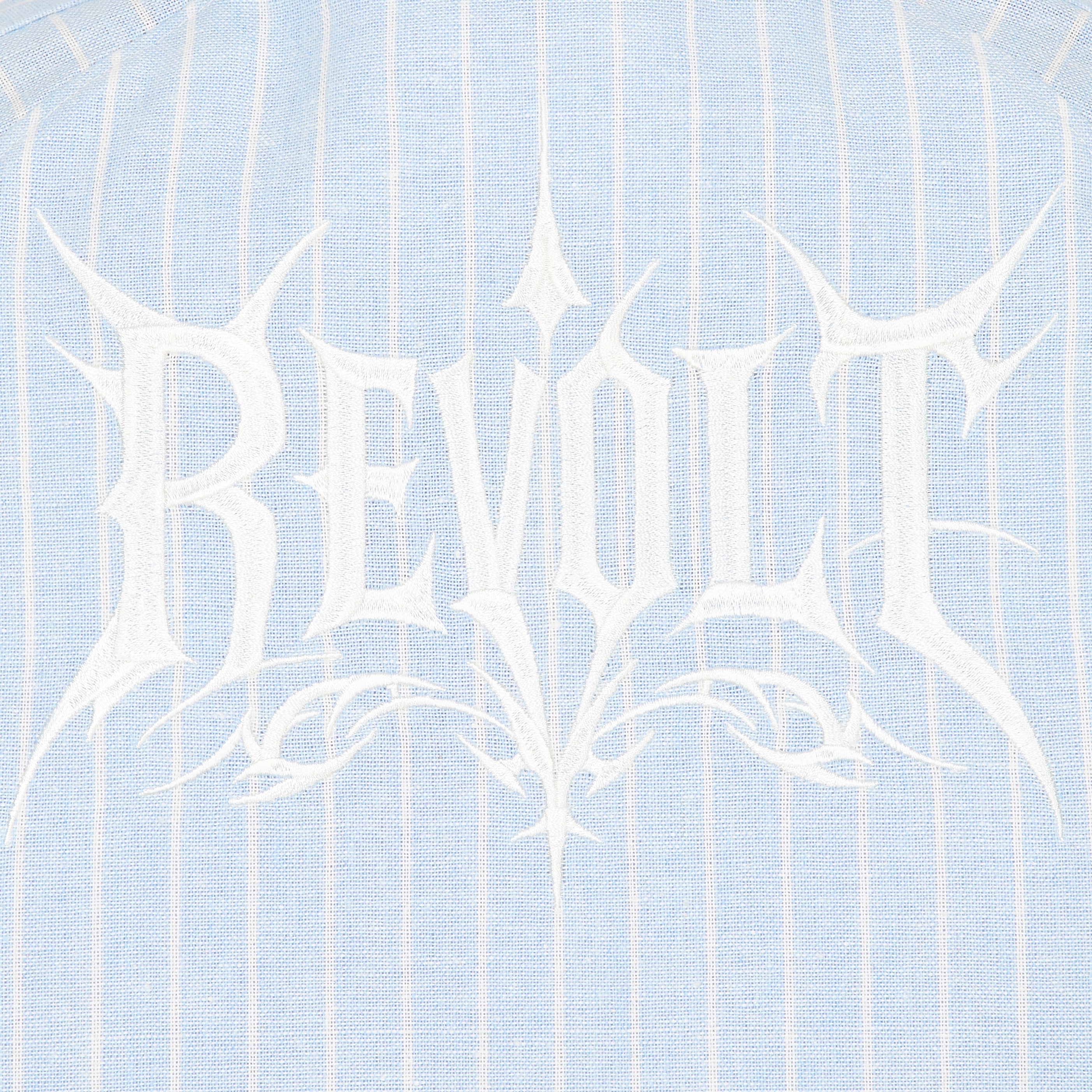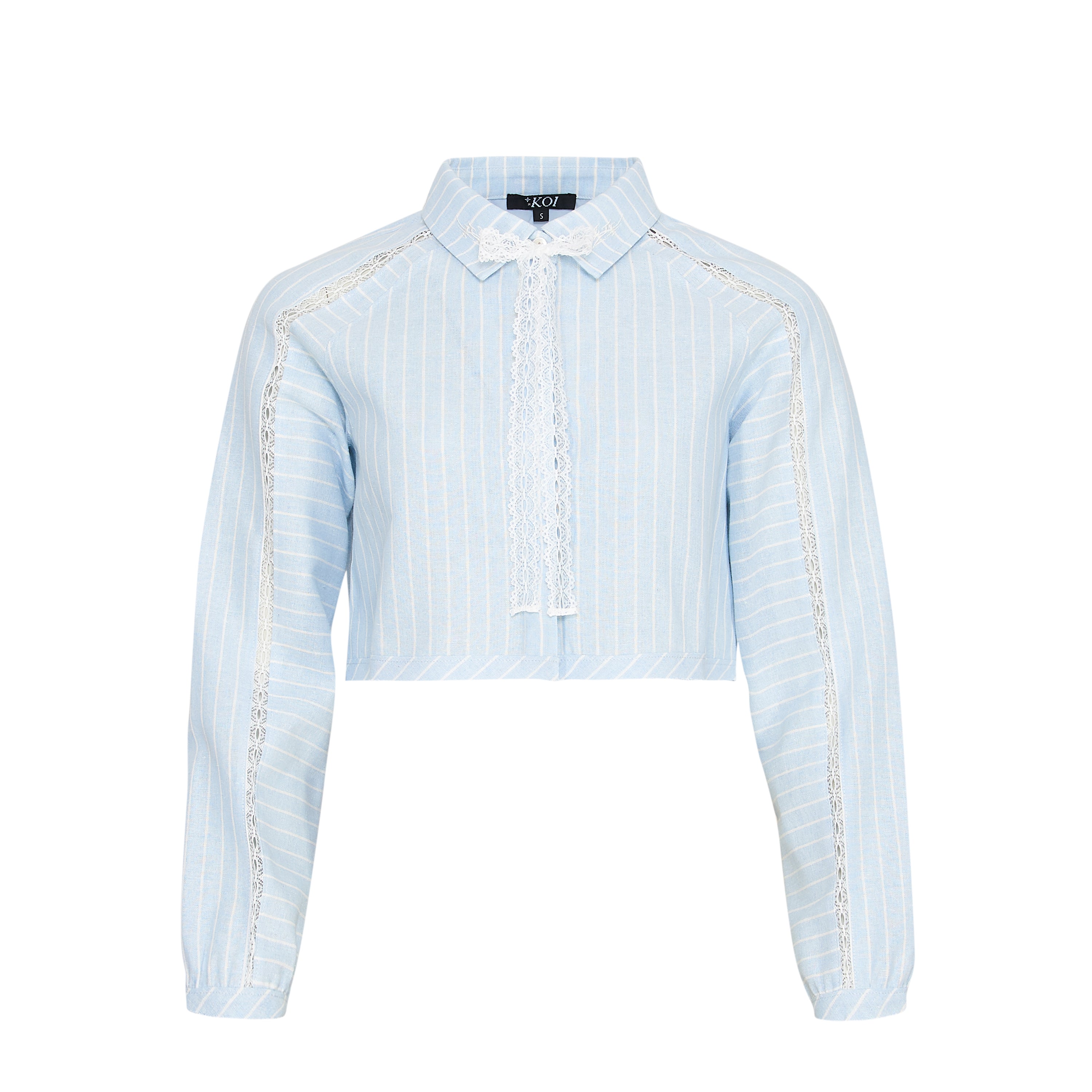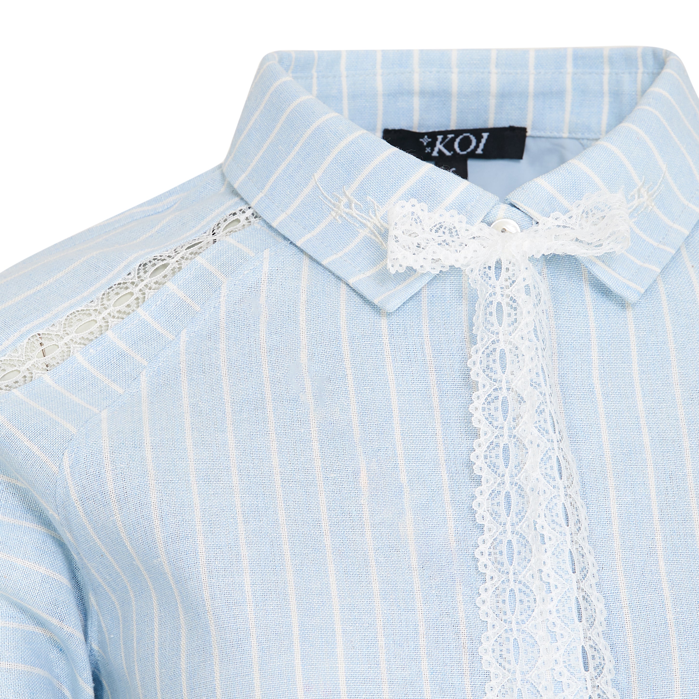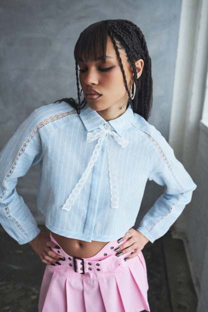 The Honeydrop takes a classic shirting shape and crops it short. Baby blue and white pinstripes run the full length, giving it a clean, almost preppy base. Then the lace comes in. Delicate lace trim runs vertically down the front placket and along the shoulder seams, breaking up the structure with something softer and more feminine.