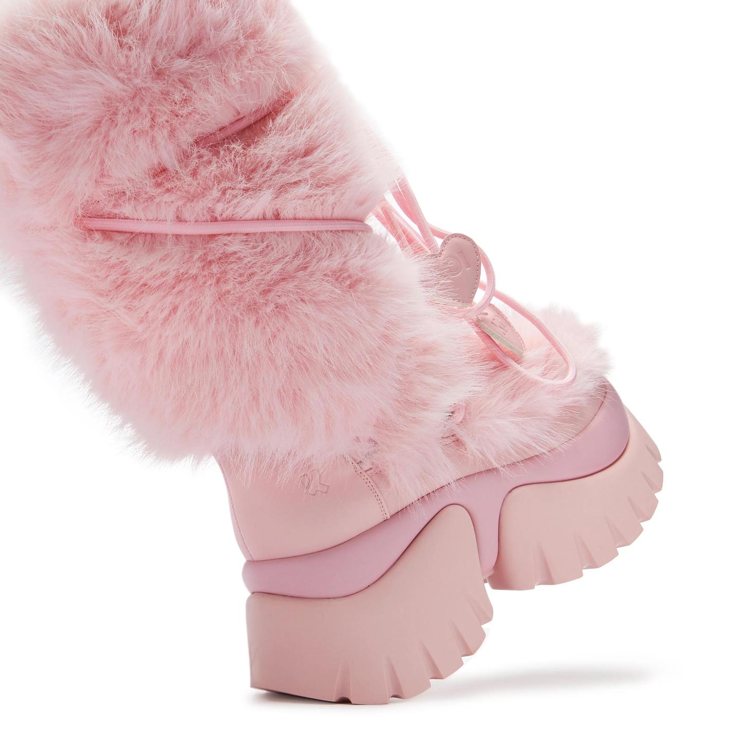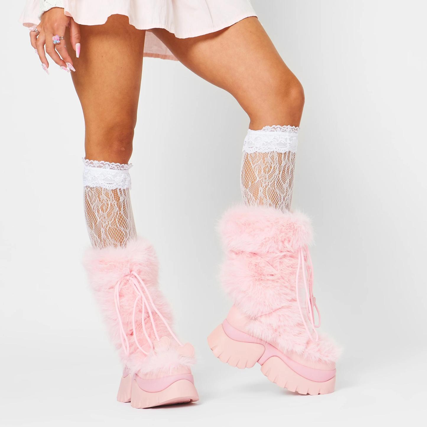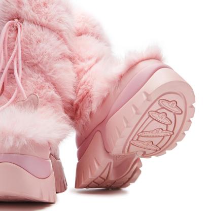 The most kawaii snow boot in all the land. This one is fluffy and, of course, pastel pink. The boot oozes cosiness and is bound to fend off any cold weather that comes your way. The fur was chosen for as much impact as possible, while still being feather soft and 100% animal free. Just to top of the cutesy vibe, the laces feature heart shaped accent ends just to add that extra sprinkle of sweet. All on our unique monster outsole, you can stand a little taller and be like bigfoot��s pink kawaii sasquatch cousin.
