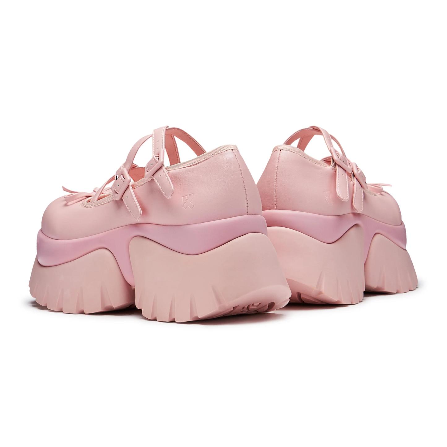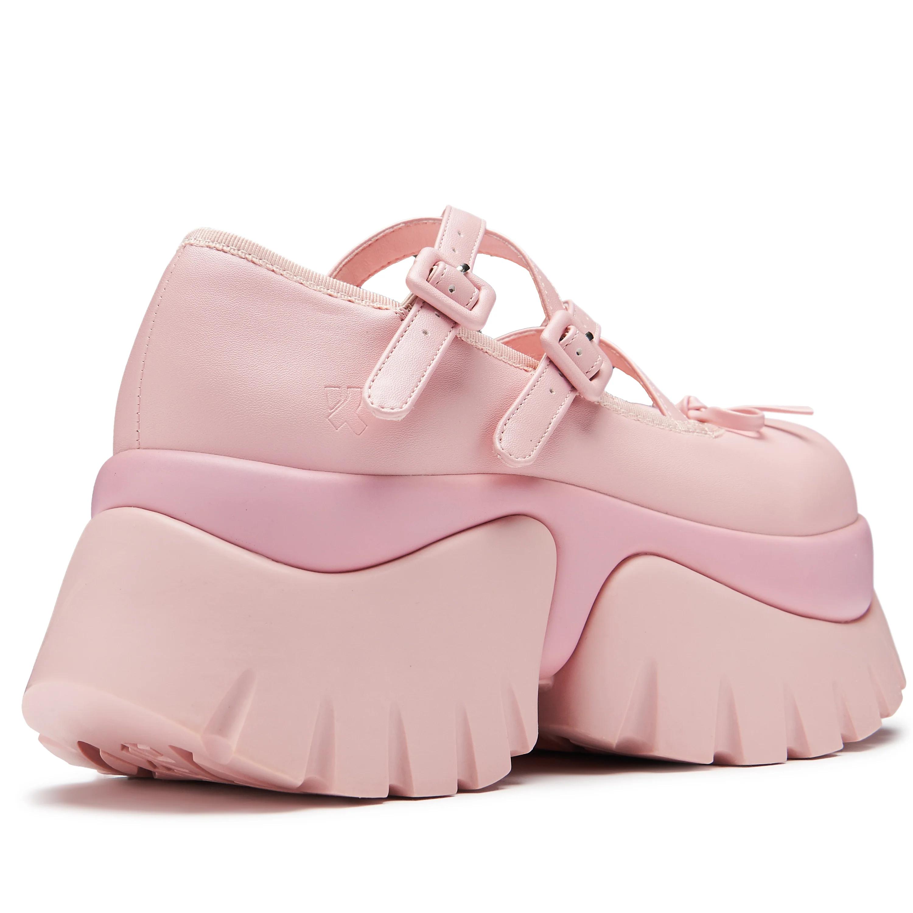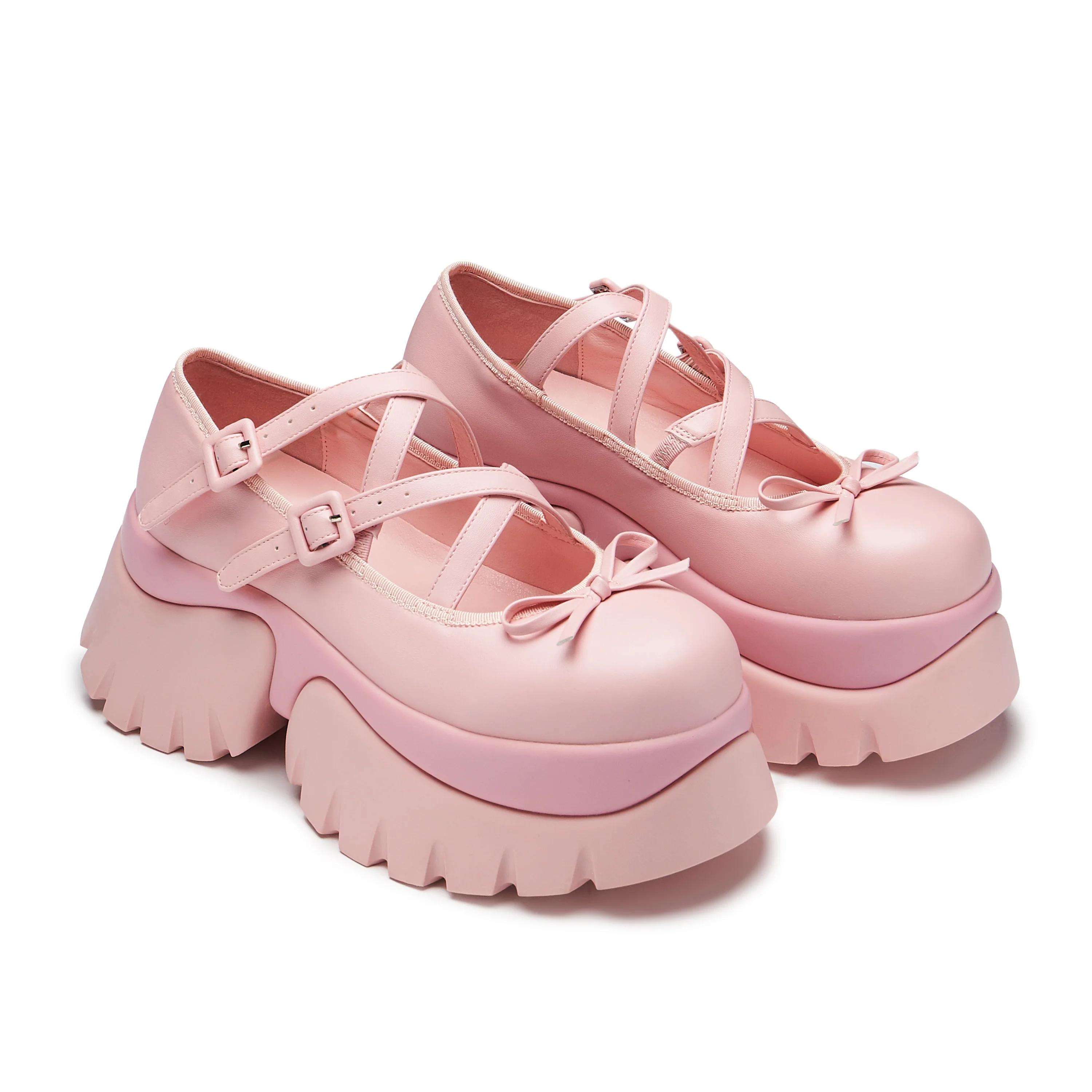 Ballet shoes with a sporty twist. Featuring a classic ballet upper with supporting details, such as criss-cross straps that offer both style and security, paired with our "monster" platform it creates for a cute but chunky aura. The straps are specifically designed to snugly hold the foot in place, ensuring comfort for hours of wear. Initially, we were concerned that the size of the platform might make them feel clunky, but after extensive internal testing, we��re proud to say this is one of our most comfortable styles yet. The "monster" outsole provides just the right amount of weight and support, all while maximizing coziness. And, of course, these elements don��t just feel great, they look incredible too! Finished in pastel pink, this style strikes the perfect balance between sporty, practical, and modern. Can be dressed super cute, or more casual.