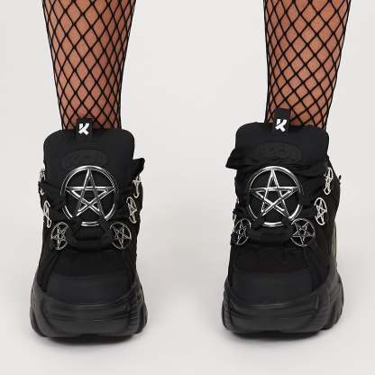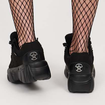Inspired by chunky skater trainers, we set out to create a style that captures that aesthetic but twists it with a gothic vibe—two subcultures that don't typically come face to face, but we wanted to blur that boundary. Featuring custom-molded metal pentagram Details in all the right places, these trainers are unapologetically bold. The oversized, chunky laces not only give a statement look but also add to the customizable feel, there are multiple ways to replace them, but we think our way looks pretty slick. If you find a better way, let us know! The padded tongue, combined with thick padding around the collar and a cushioned insole, makes these trainers super comfortable for all-day wear.