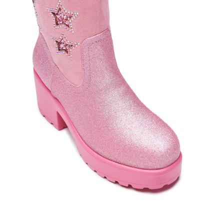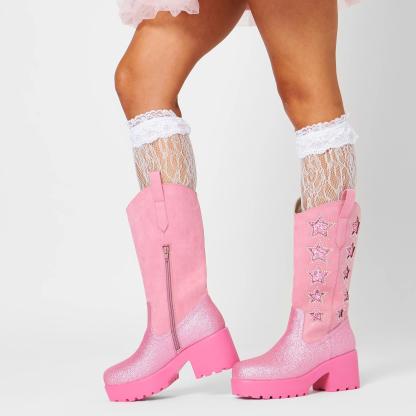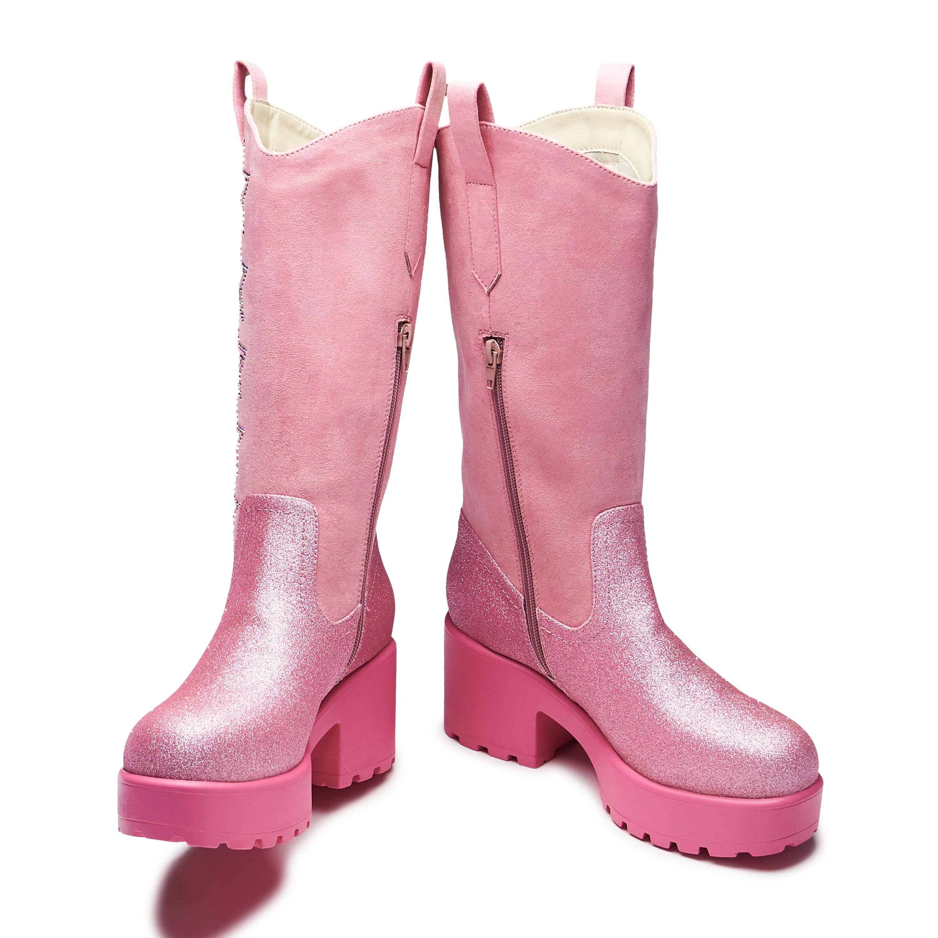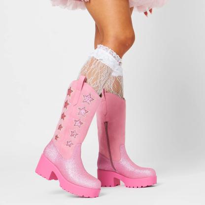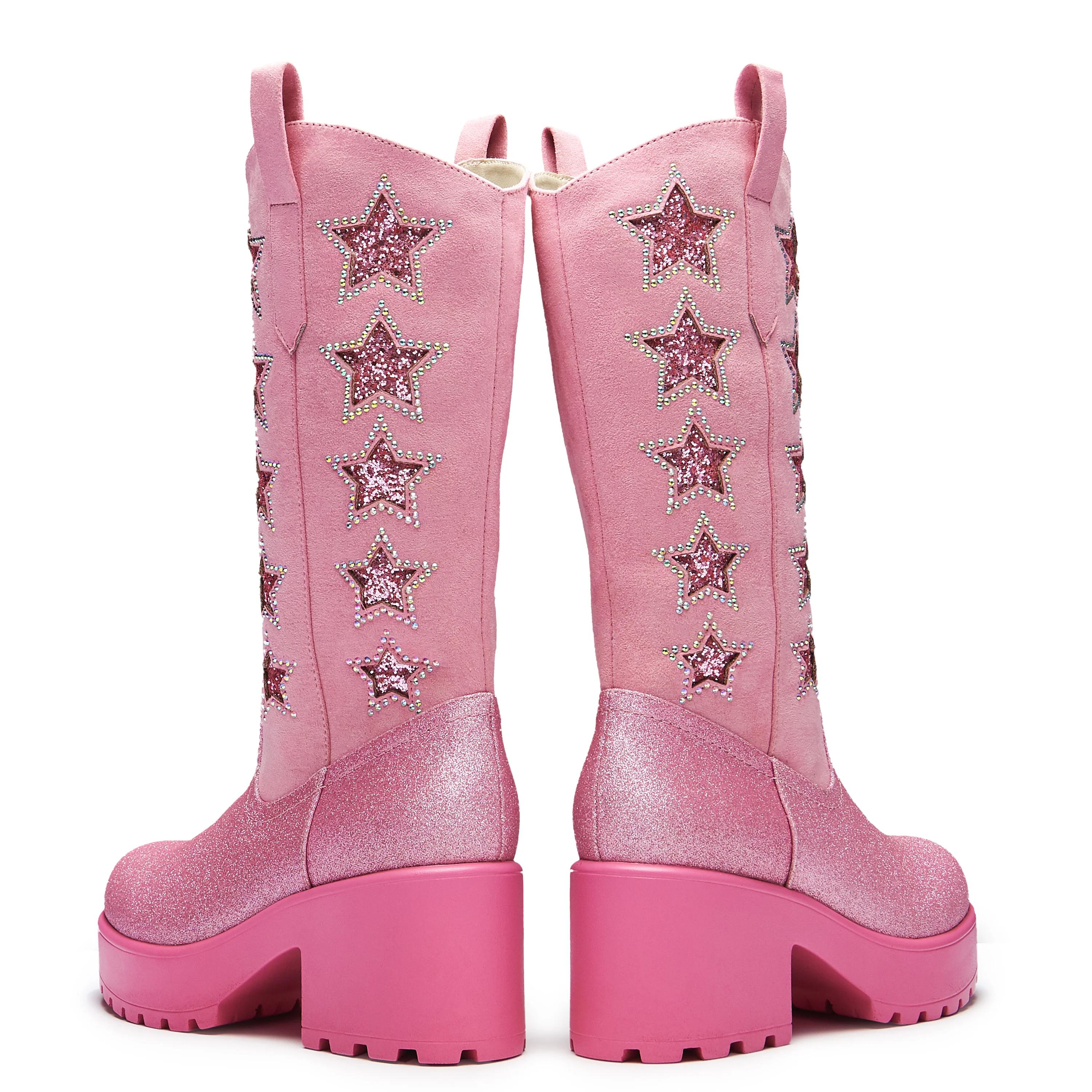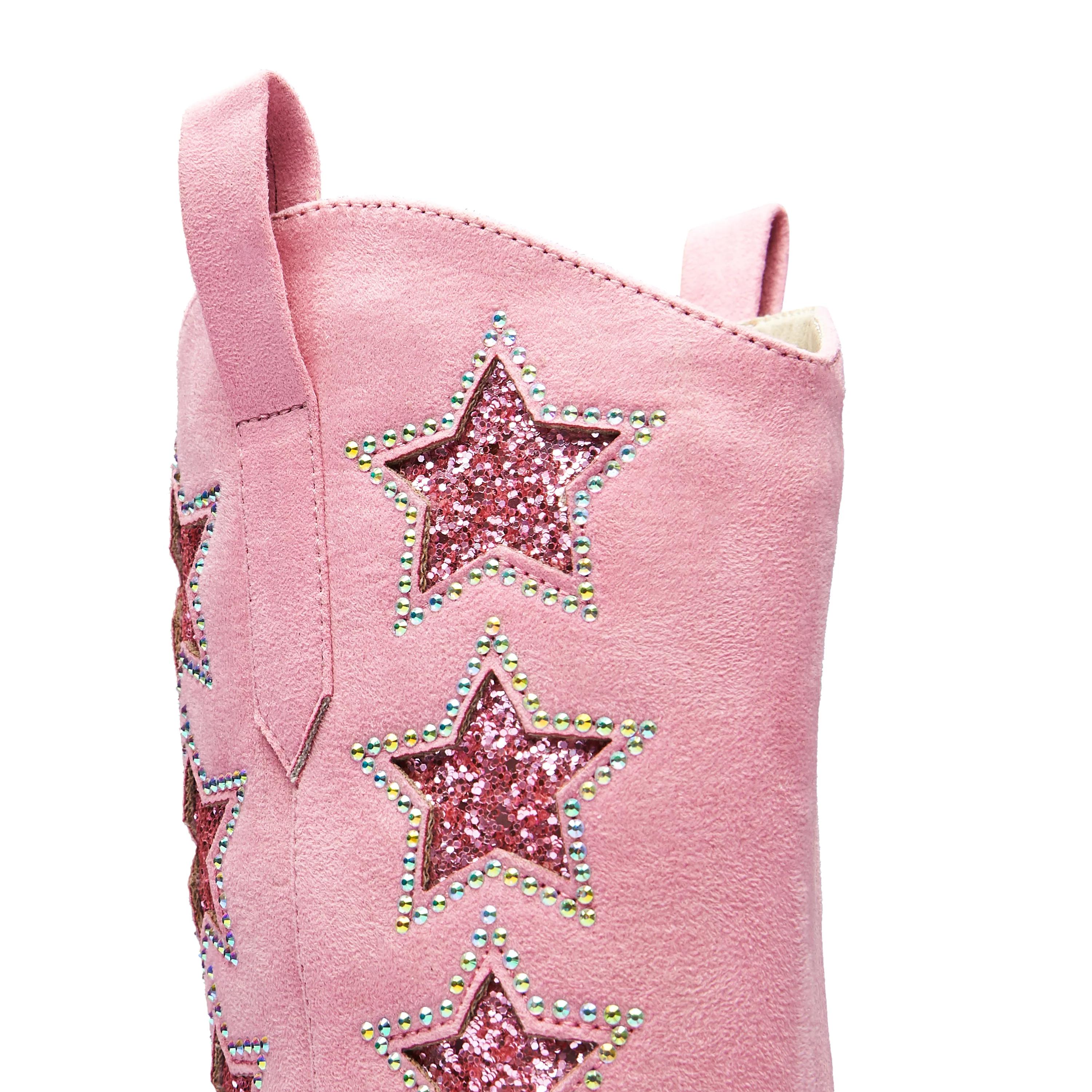 Glitter, glitter and more glitter! A classic cowboy silhouette in a not-so classic finish. Live your party cowgirl life in these pink cowgirl boots bejewelled to perfection. Star cutout shapes with sparkling glitter layer shining through, the stars are lined with iridescent diamantes that catch the light from every angle. Finally, a buttery soft faux suede leg paired with yet more glitter towards the bottom of the outsole providing a contrast between the glistening stars and the plush matte suede. Just simply pull on and shine.?