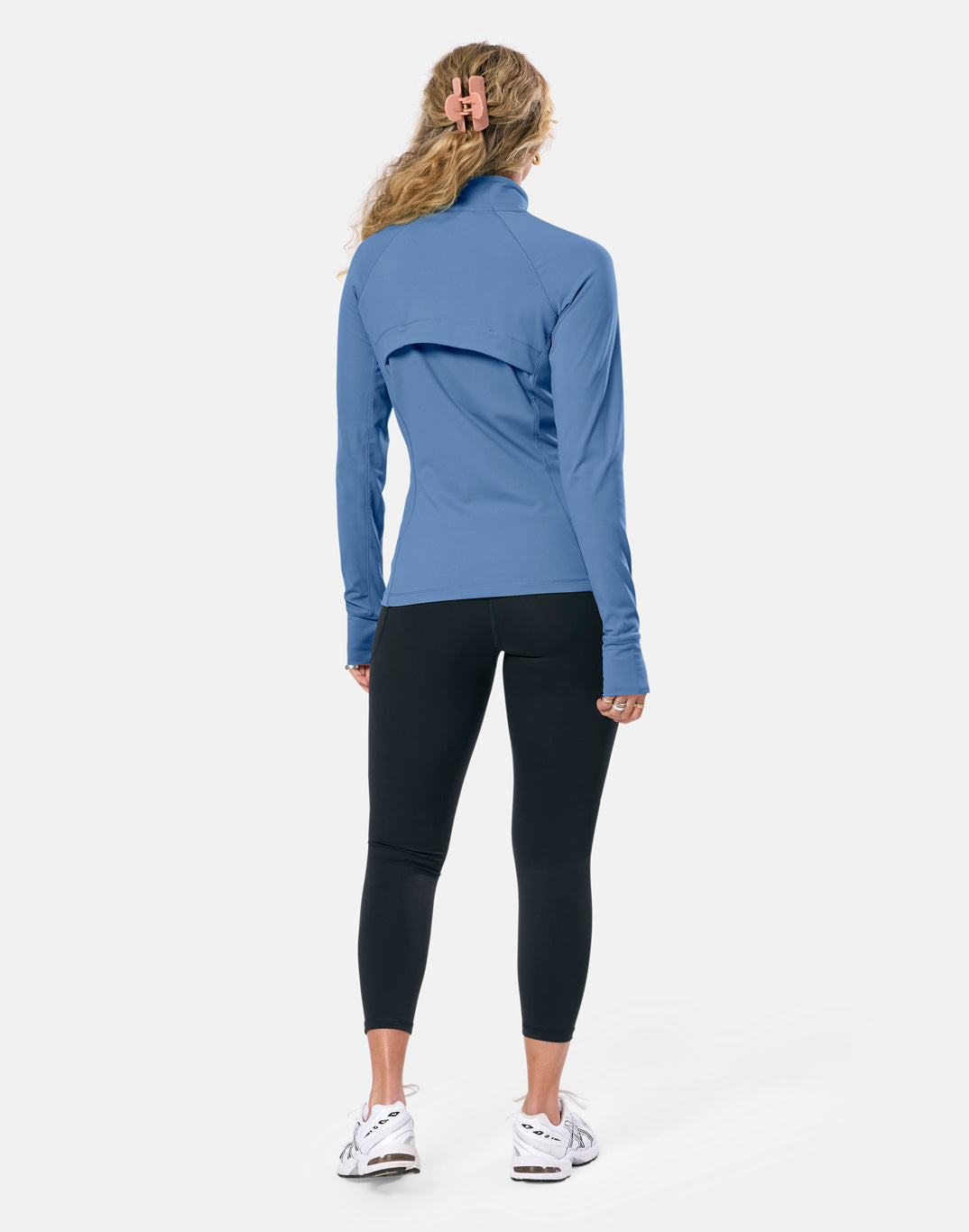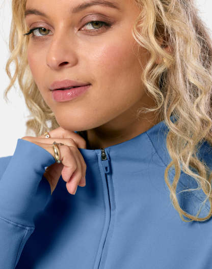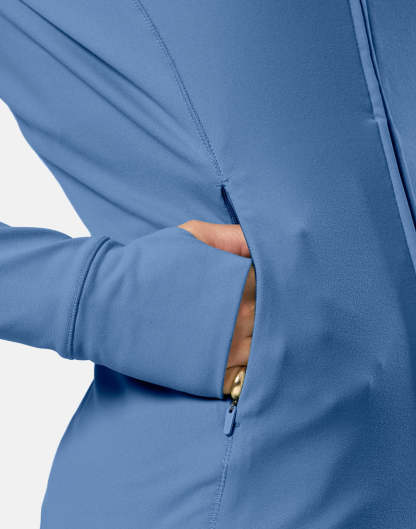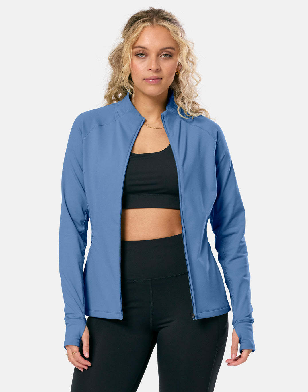 This women’s full zip workout jacket is designed for active layering. Lightweight and breathable, with a fitted silhouette enhancing shape that works from warm-ups to cool-downs.