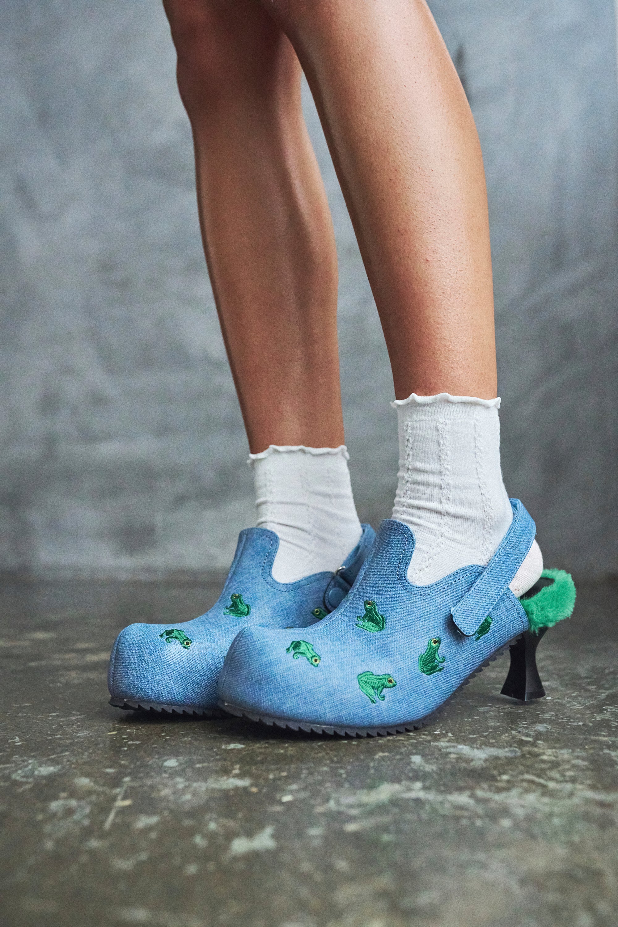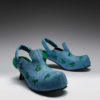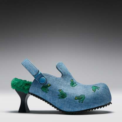The RIBBIT Mules sit somewhere between playful and slightly unhinged, covered in scattered frog embroidery that feels like it shouldn’t work but does. A quiet kind of chaos, stitched into every angle.