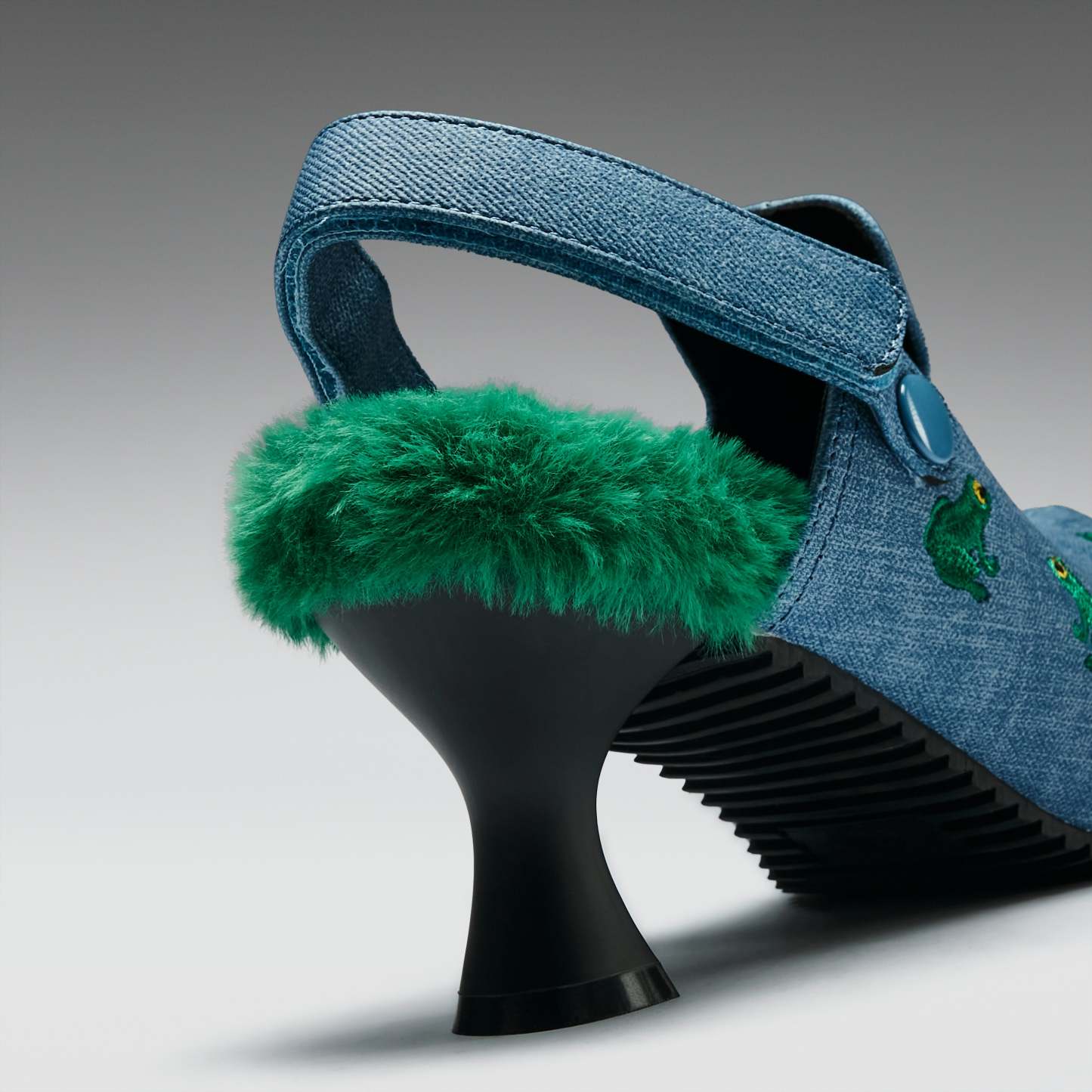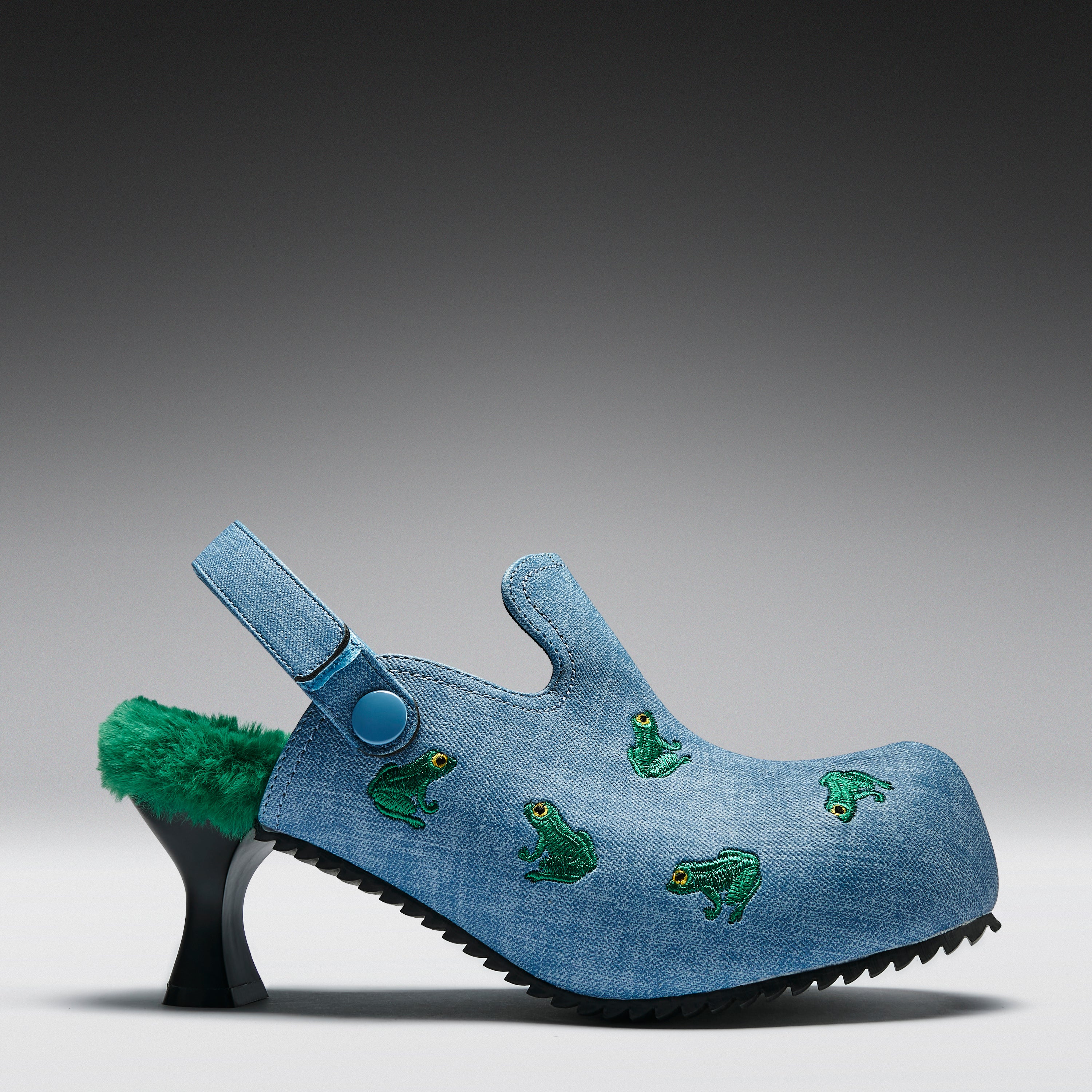 A frog-embroidered mule on a sculpted heel, because we wanted to see if we could make weird feel wearable.