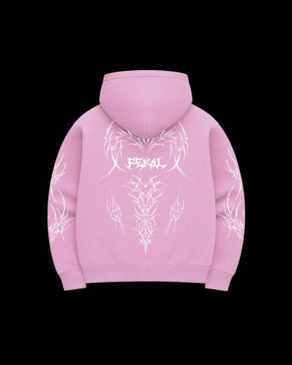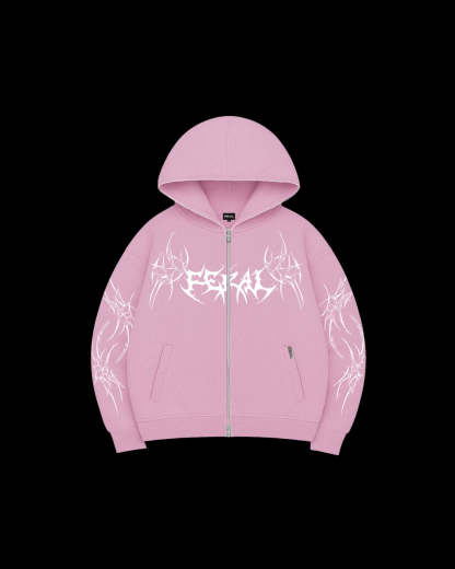 Our signature baby pink Rogue hoodie features an oversized casual fit and is crafted from ultra-soft, French terry cotton. It includes ribbed hems and cuffs, along with bold FERAL ROGUE prints across the back, arms, and front. Finished with a two-way zip around the hood and custom Feral zip hardware.