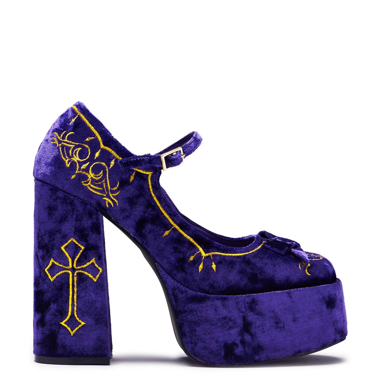 The silhouette is classic KOI, a chunky, sturdy heel and platform elevate the design, both literally and stylistically. The embroidered cross and floral details provide the finishing touches, recalling the splendour of royal crests and heritage.?