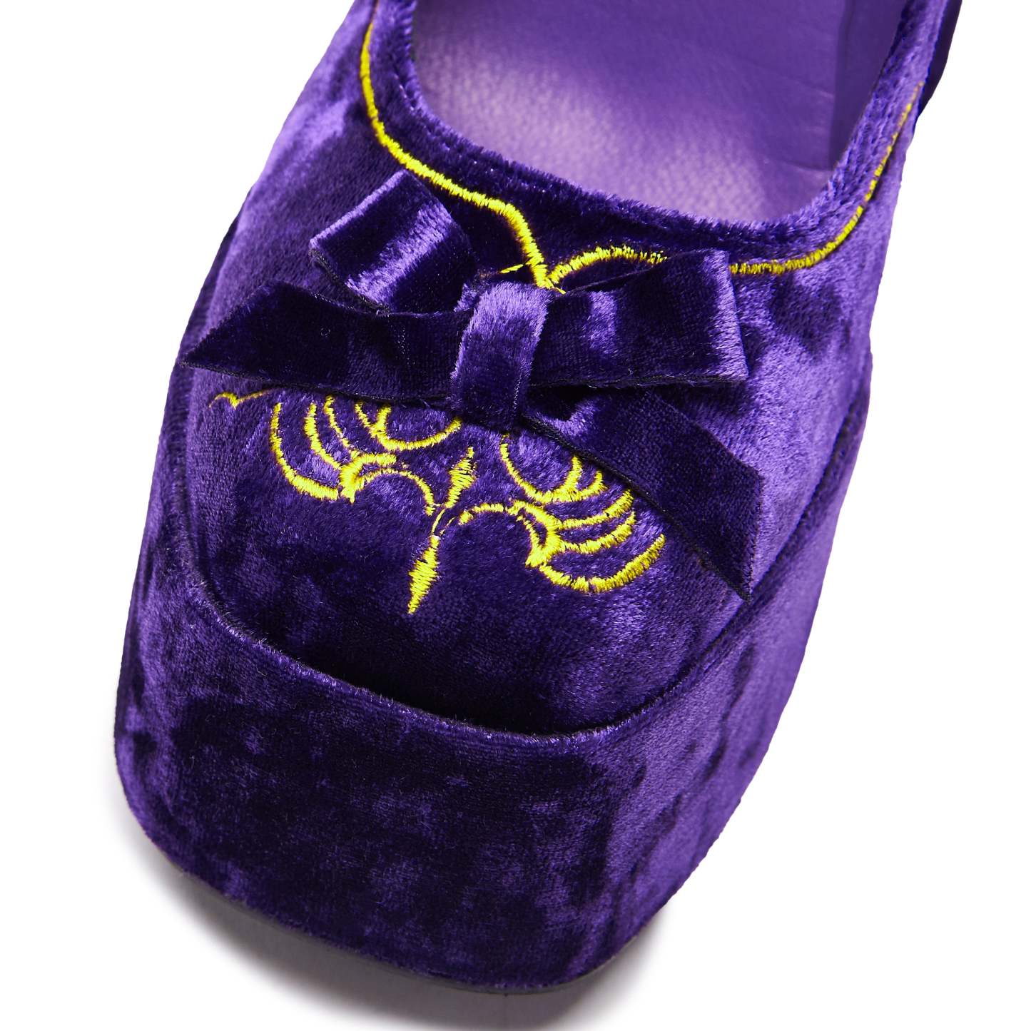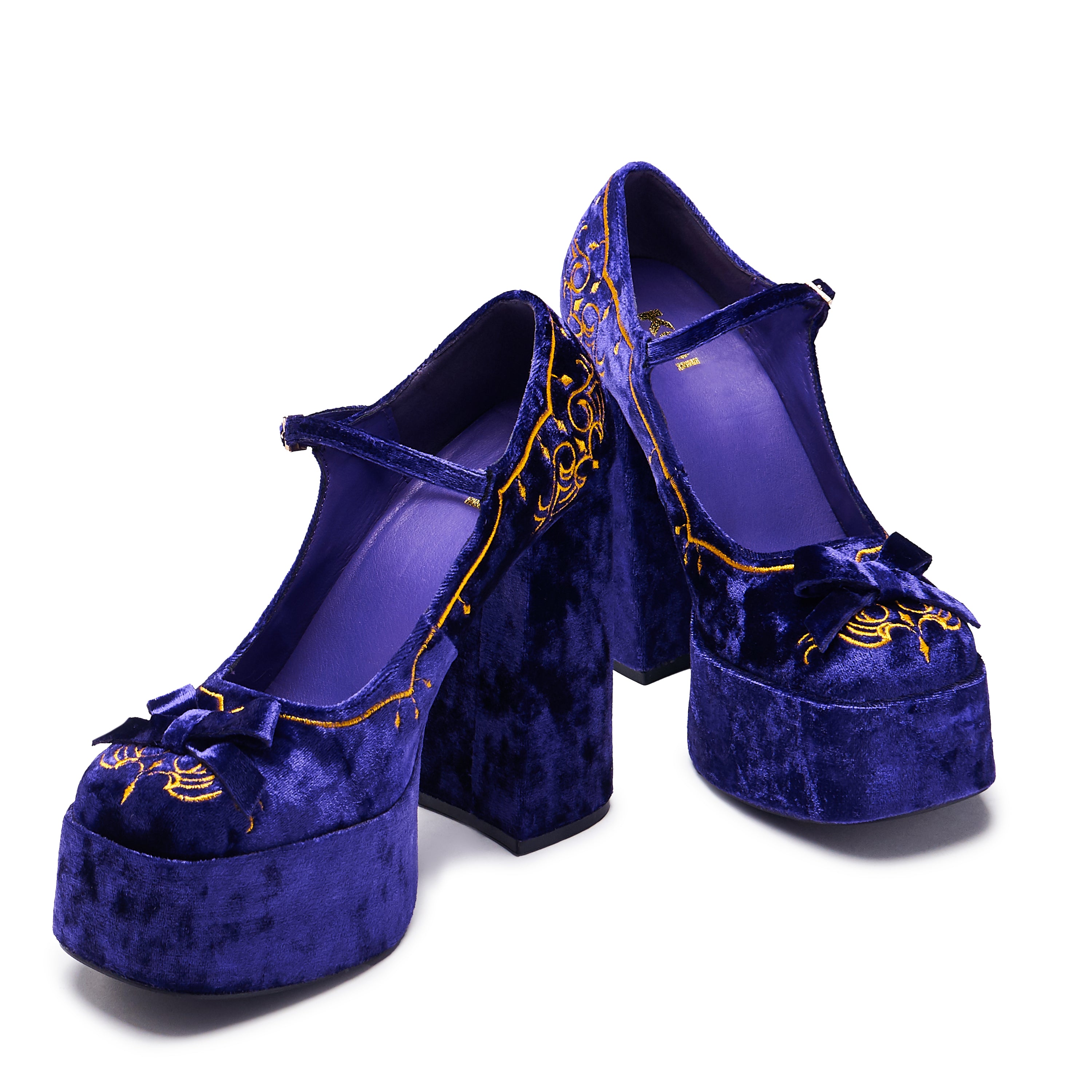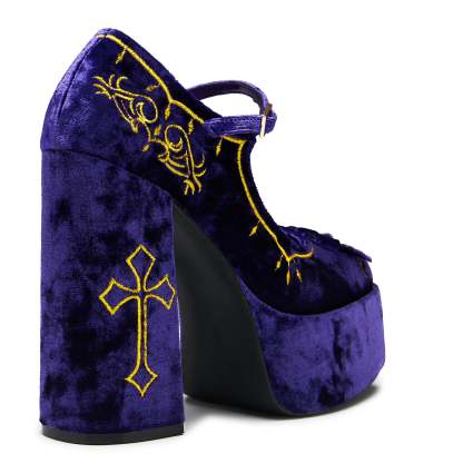 The Royal Manor Velvet Platform Heels are inspired by the grandeur of royalty, materials and looks once reserved for a select few, is now a canvas for which we can create upon. These statement heels bring together the richness of deep purple crushed velvet and the elegance of gold embroidery weaving a narrative of opulence from a forgotten age. The contrast of these colours are delightful indeed.