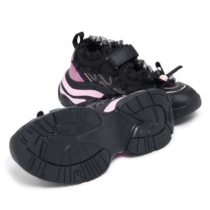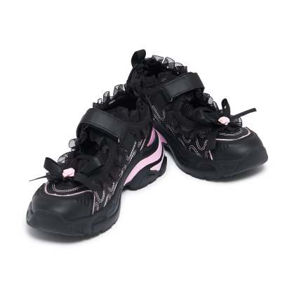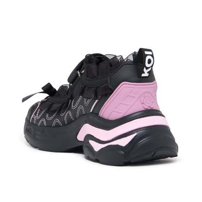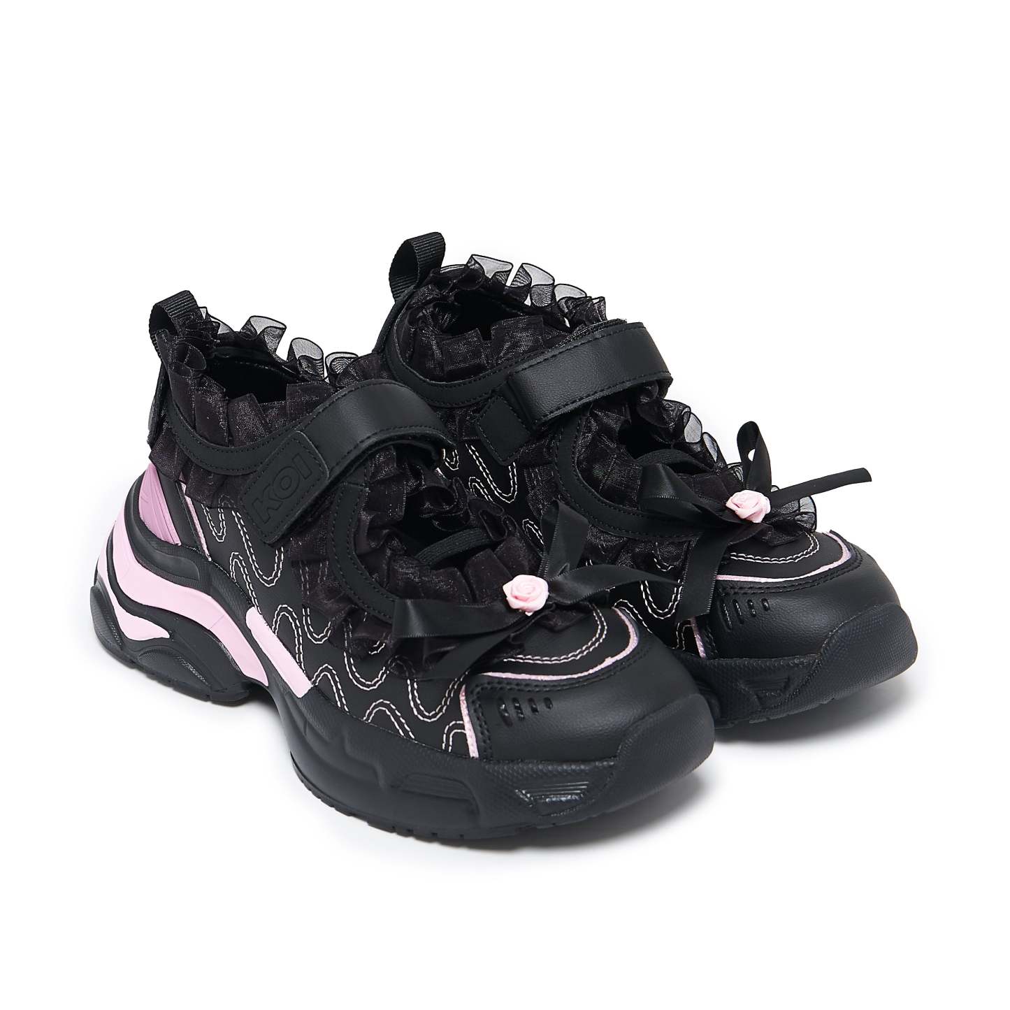 Sweet meets street in the Runa Ruffle Ballet Mary Janes. With their chunky trainer sole, contrast baby pink stitching, and gothic mesh frill, they’re what happens when ballerina dreams get a KOI remix. Finished with a statement ribbon and rose detail, this pair is built for soft girl chaos and stomping the pavement like it’s a runway. Perfect with lace socks, layered skirts, or absolutely anything black.