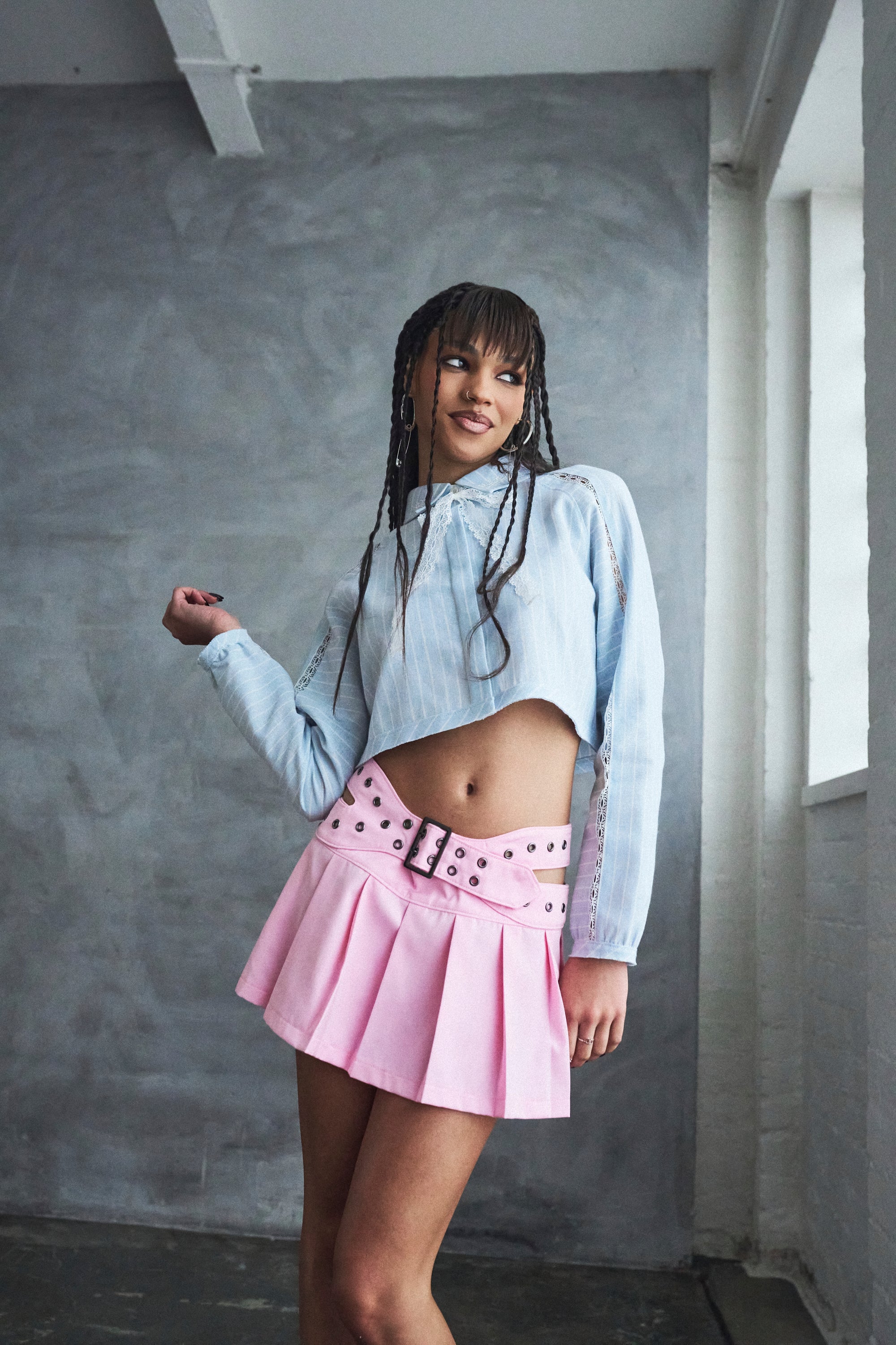 A pleated mini with a belted waist and cut-out detailing, because we wanted to give a classic skirt some edge without overcomplicating it.