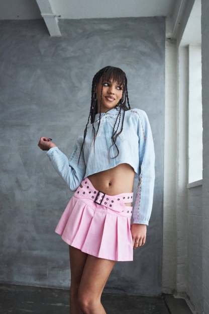 The Sugar Byte starts with a shape everyone knows. Pleated, mini length, clean lines. Then it adds just enough to make it feel like ours. A wide eyelet belt wraps the waist with a centre buckle fastening, sitting slightly asymmetric with cut-out sections at each hip that break up the silhouette and adds the slightest hint of skin.