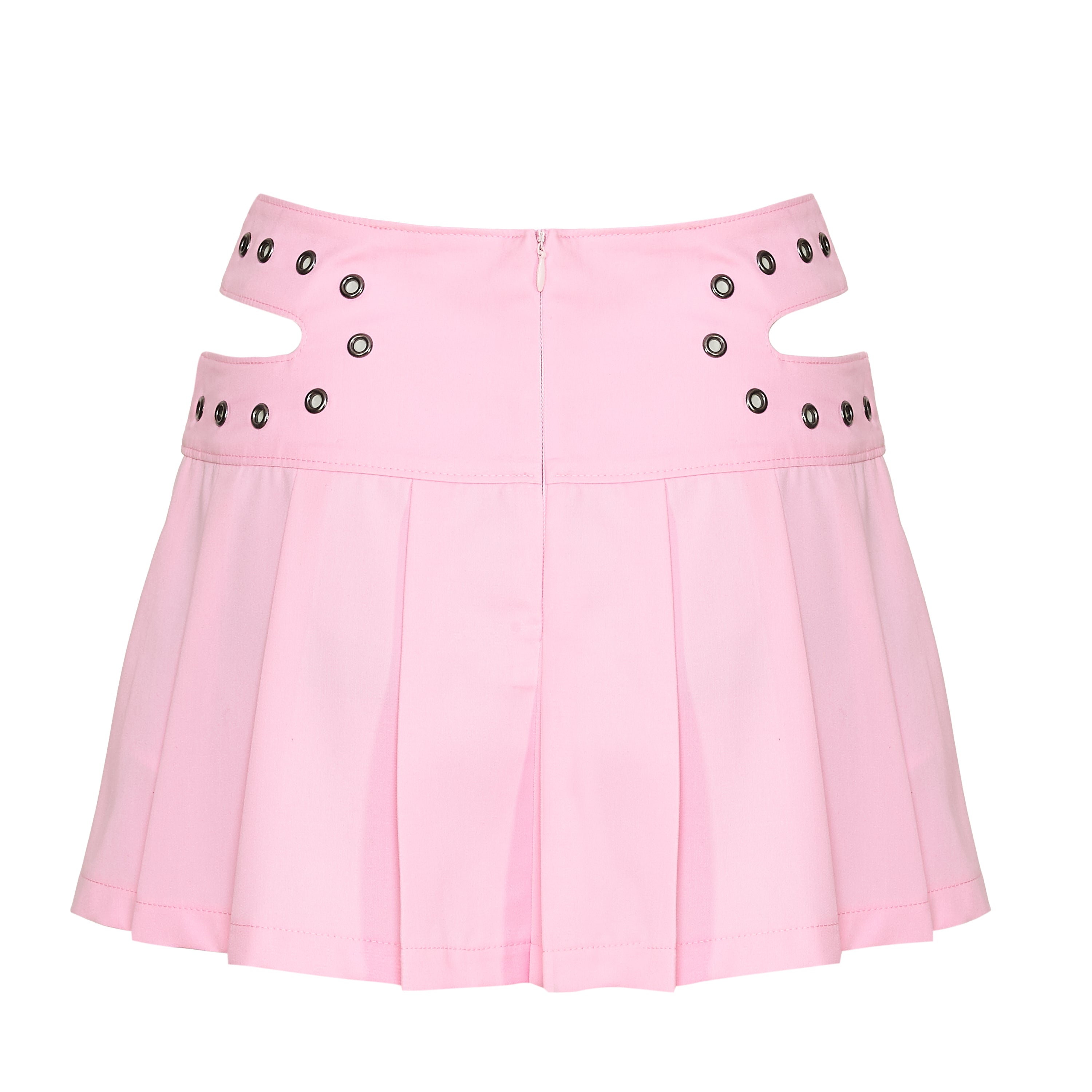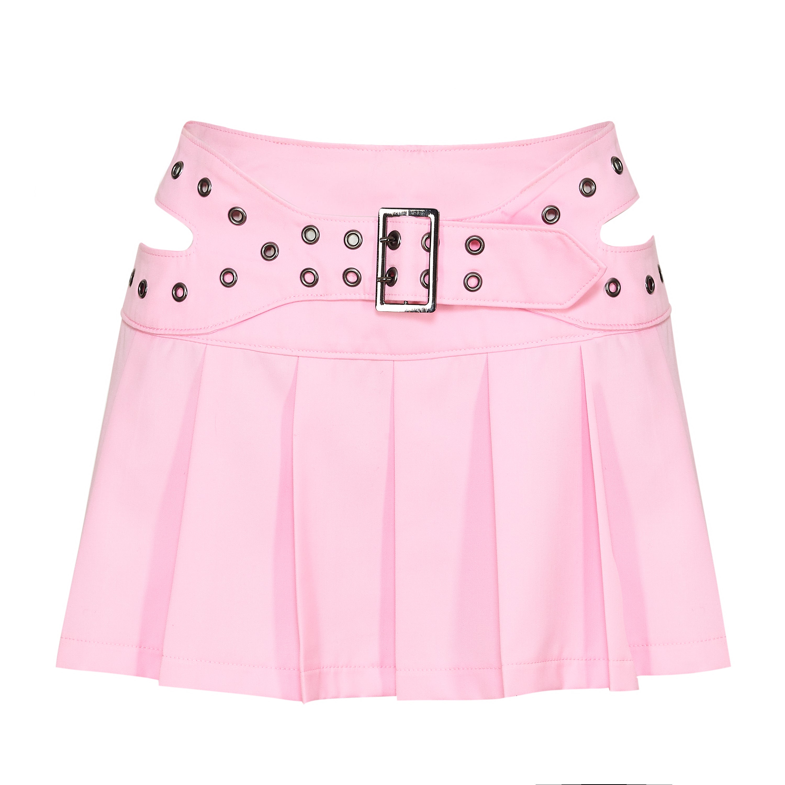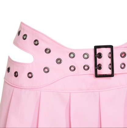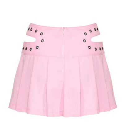 The pleats are sharp and full, giving the skirt movement and structure in equal measure. The baby pink colourway keeps things sweet on the surface, but the hardware and cut-outs pull it somewhere less expected.
