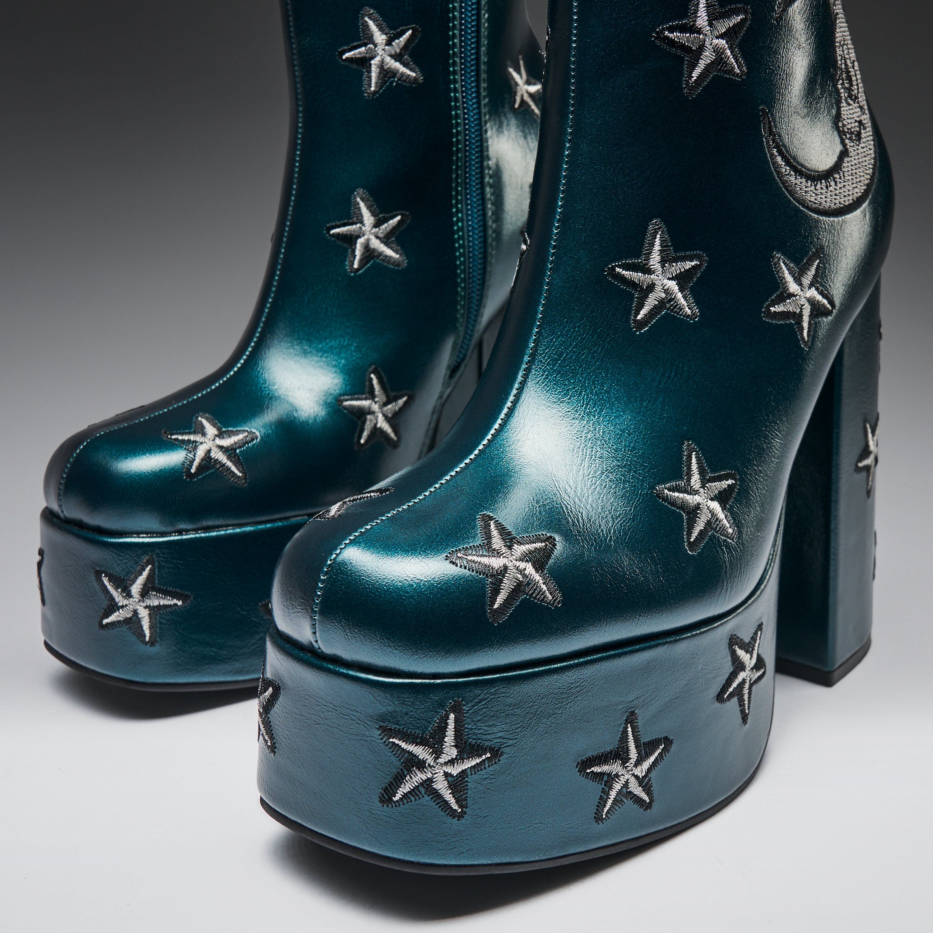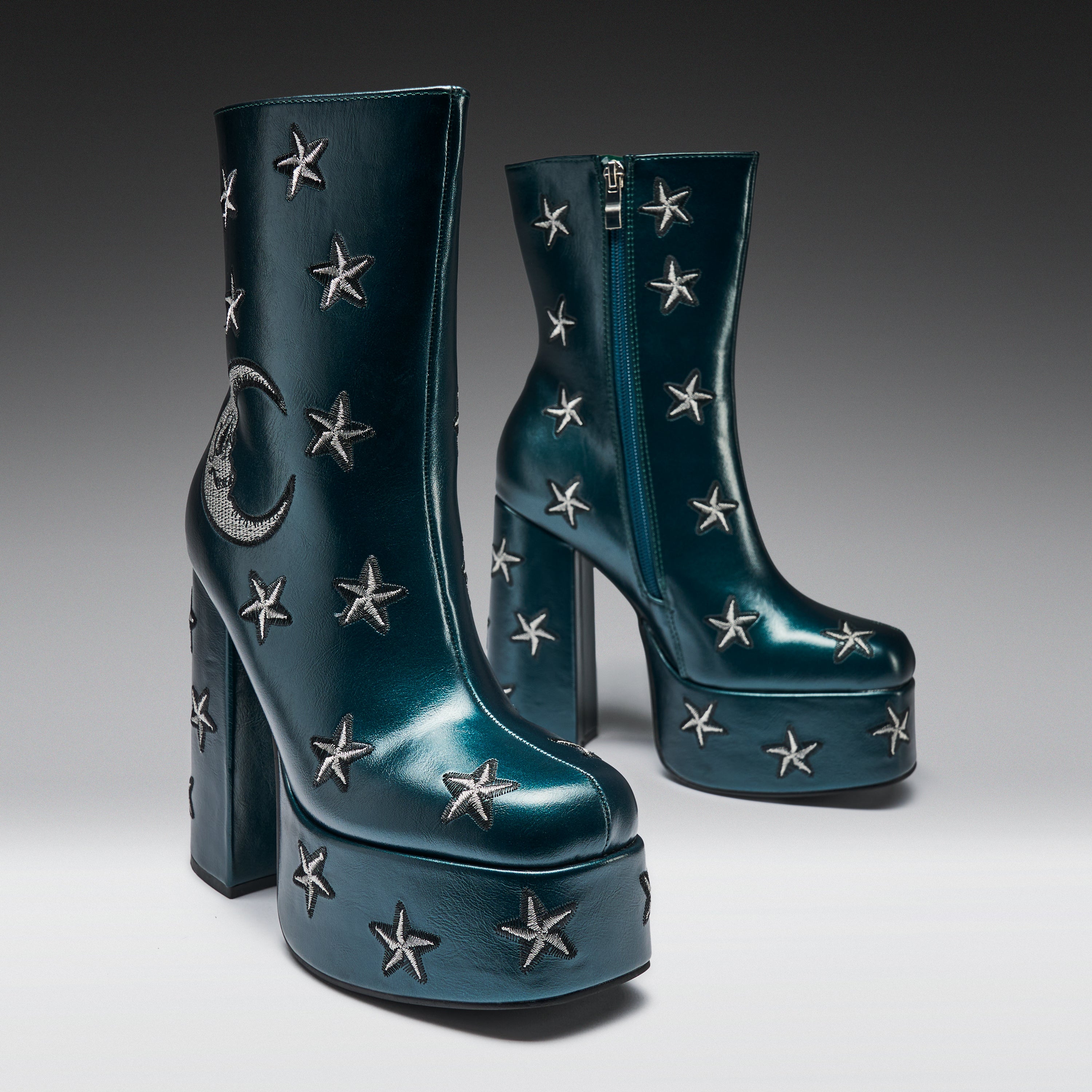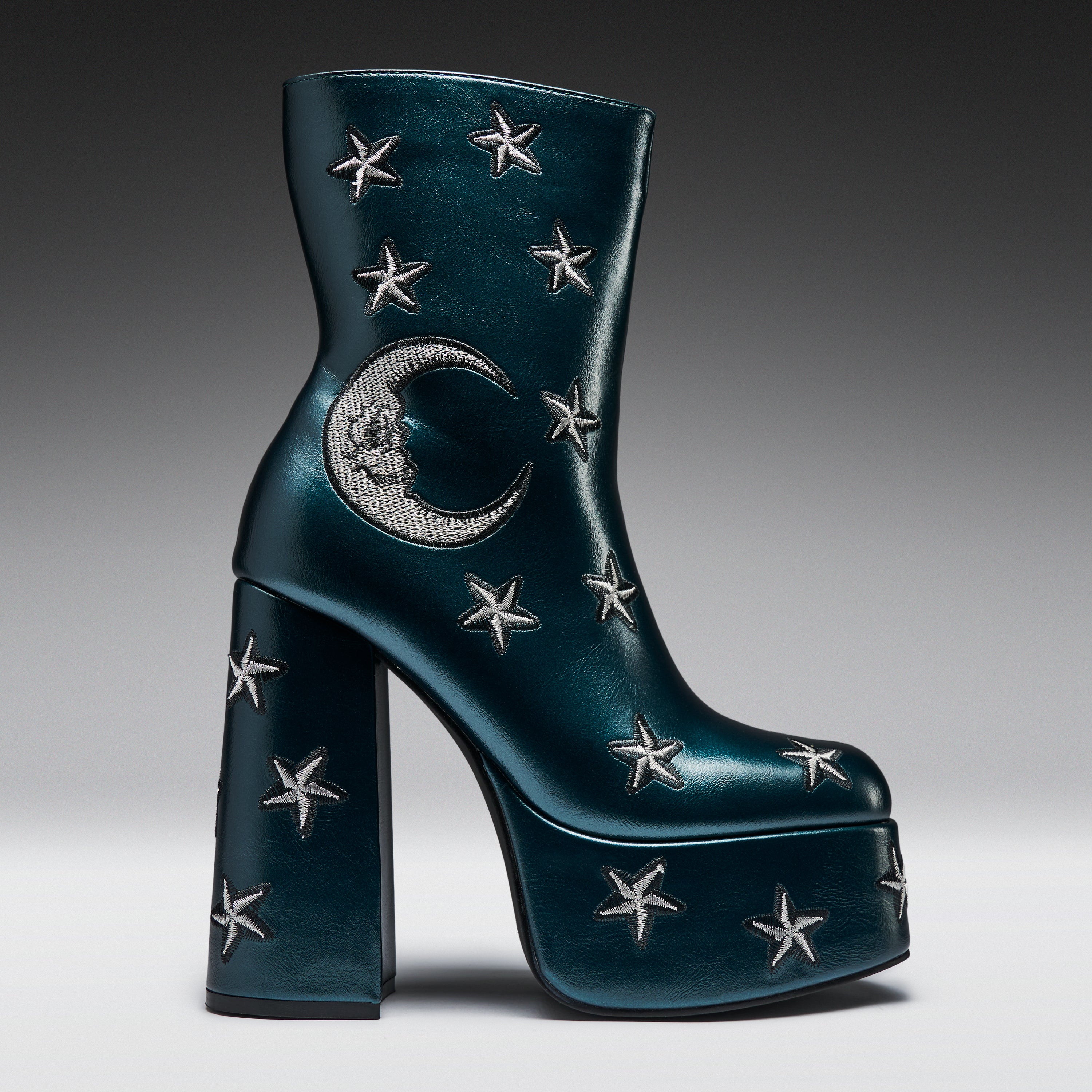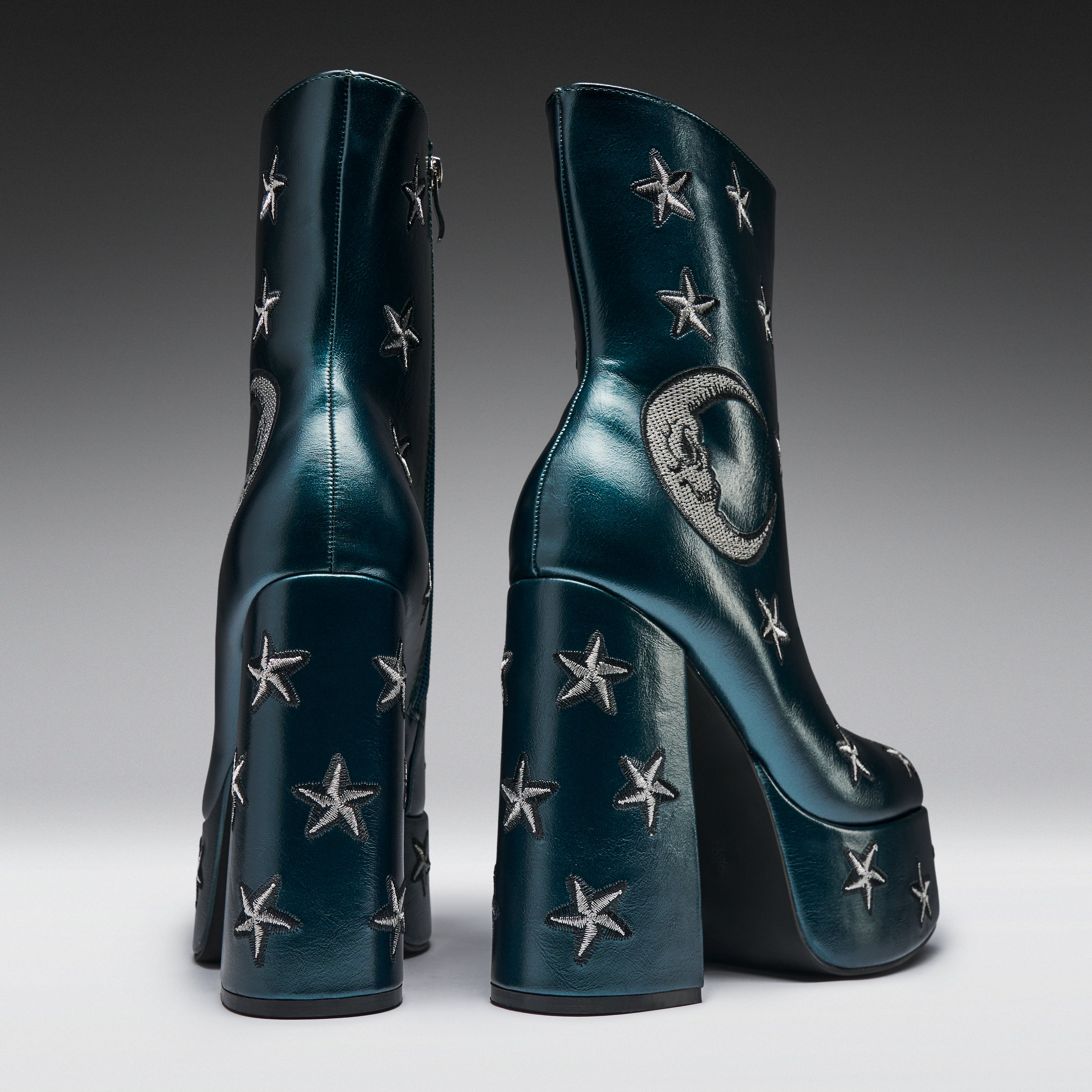 What's up witches? Feel magically creepy in the most glamorous way in these chunky ankle boots for women. With enchanting moon and stars embroidery, these celestial platform heels will have you ready to cast a spell this Halloween. Heeled boots are the perfect way to add height to your look this fall, and these come in a spooky shade of teal green.