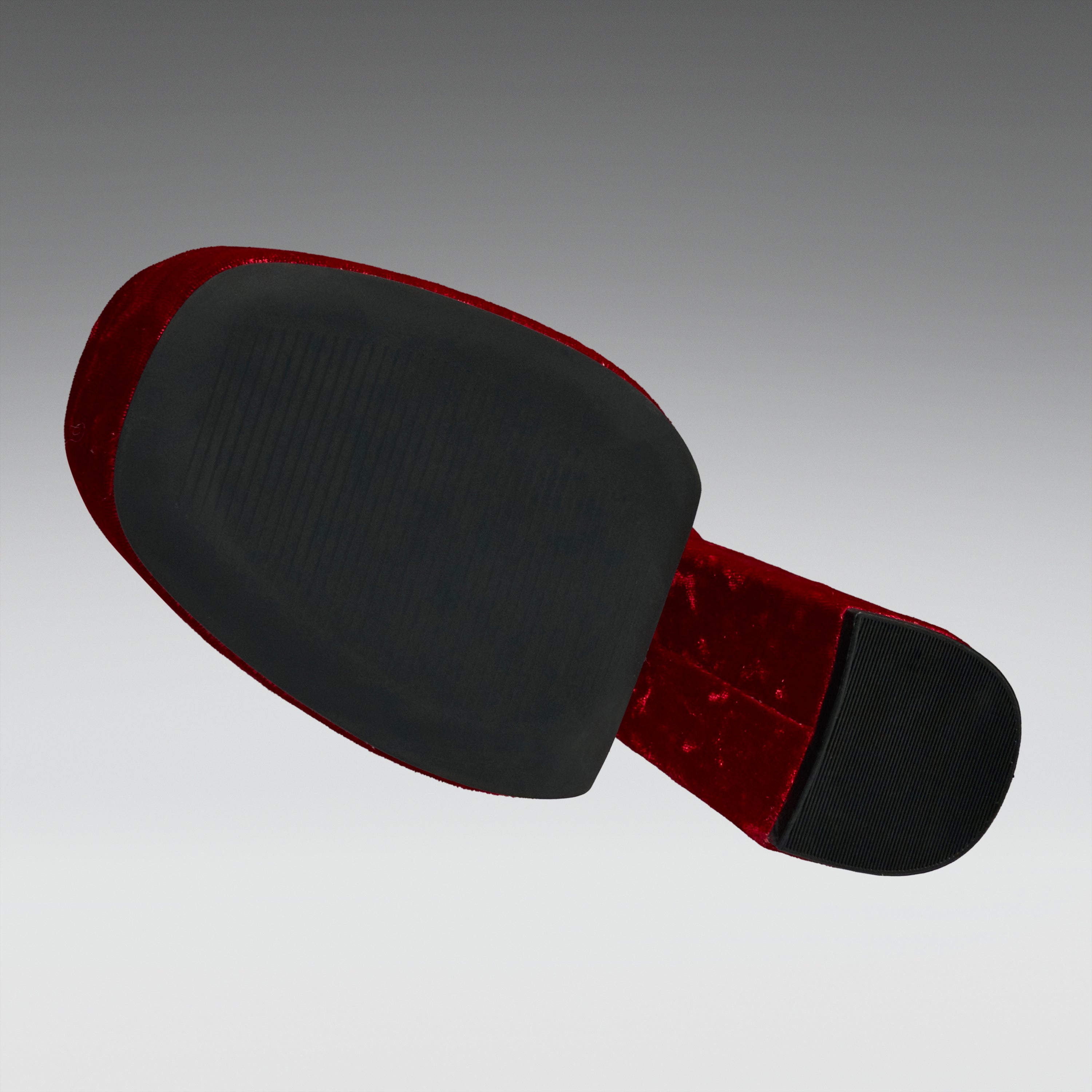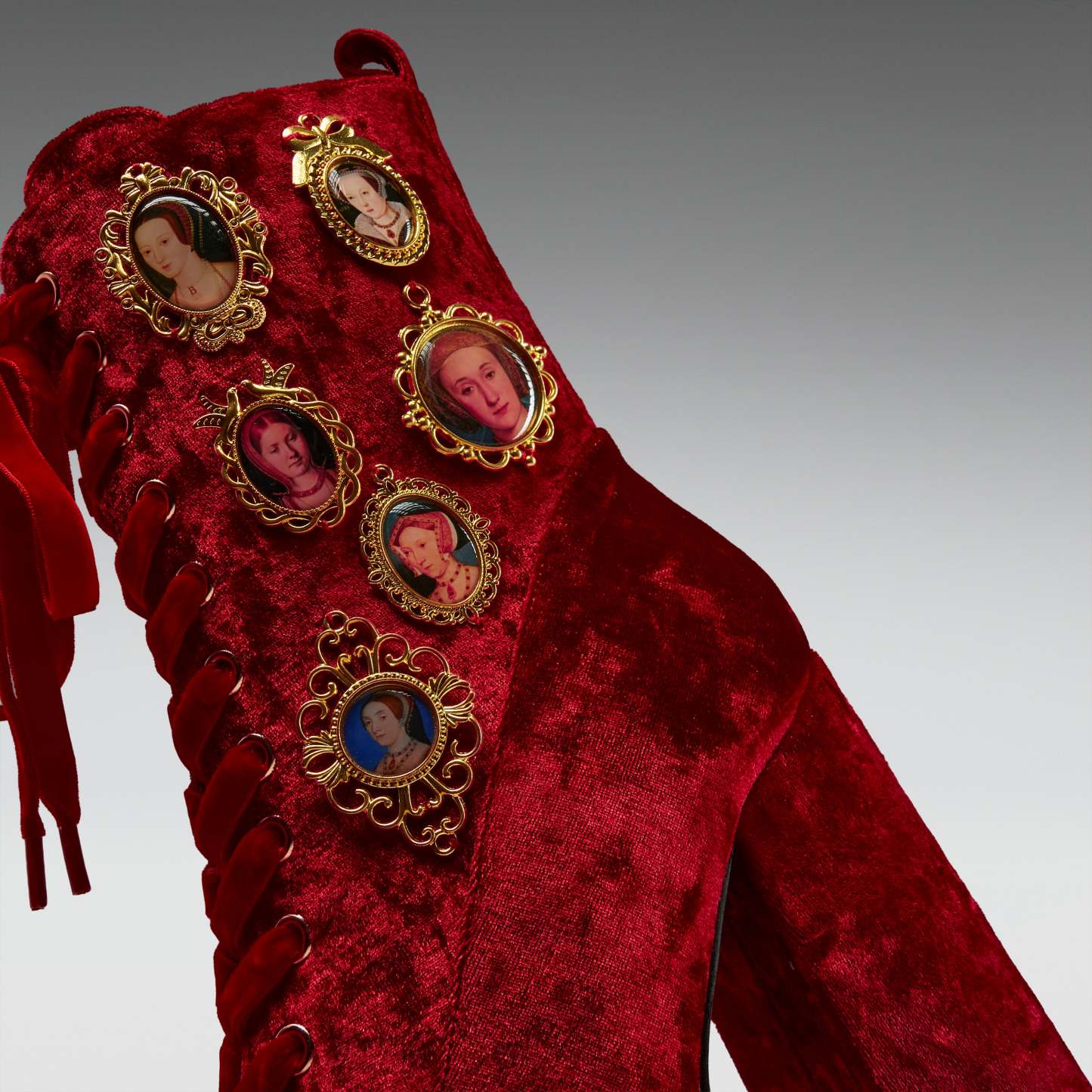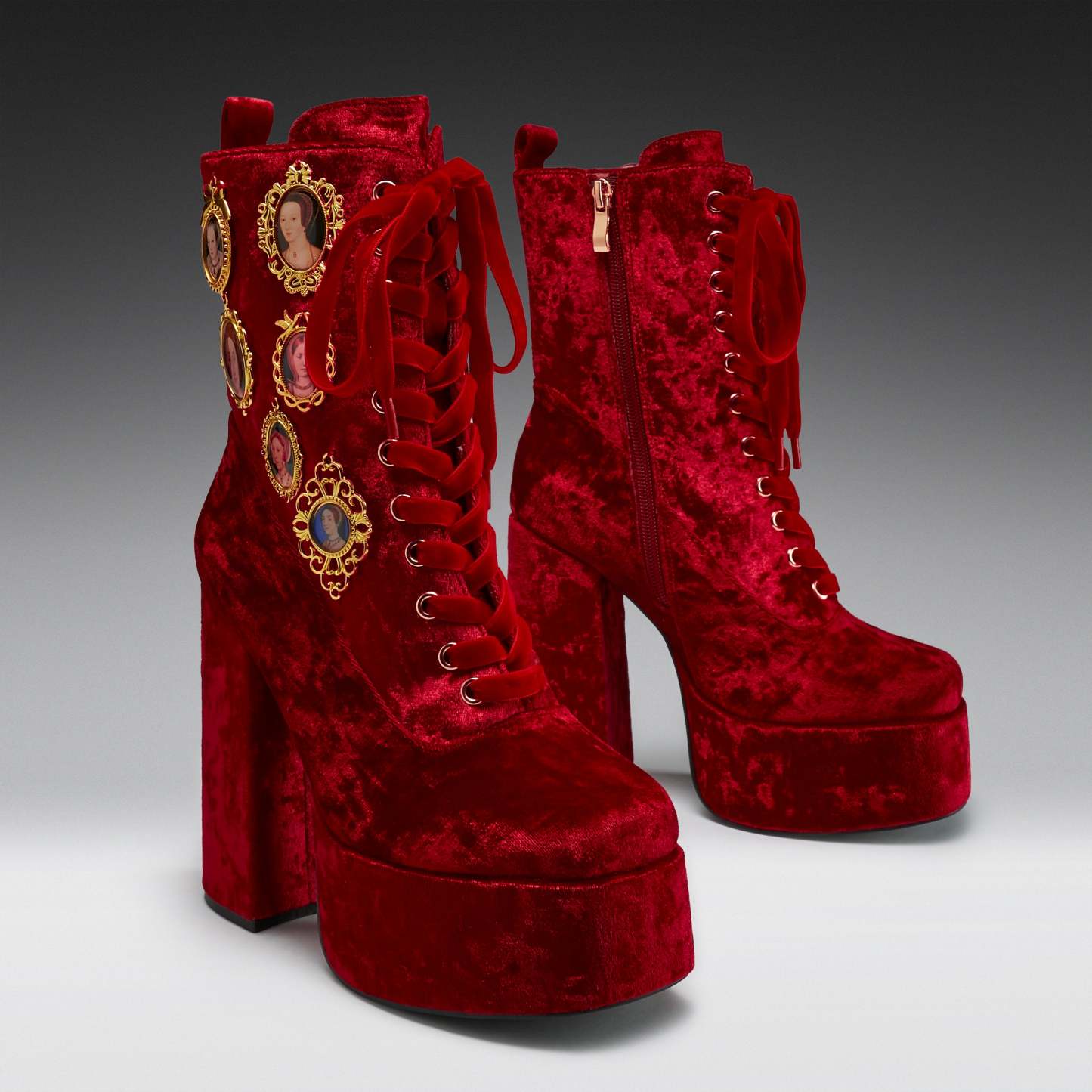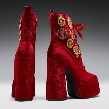 This is storytelling made wearable, stitched into crushed velvet and raised upon a statement heel. Scarlet laces twist through gilded eyelets, tying past to present. History has never looked this powerful.
