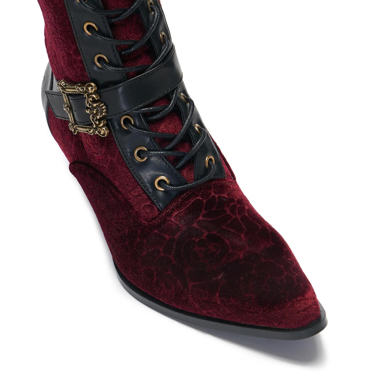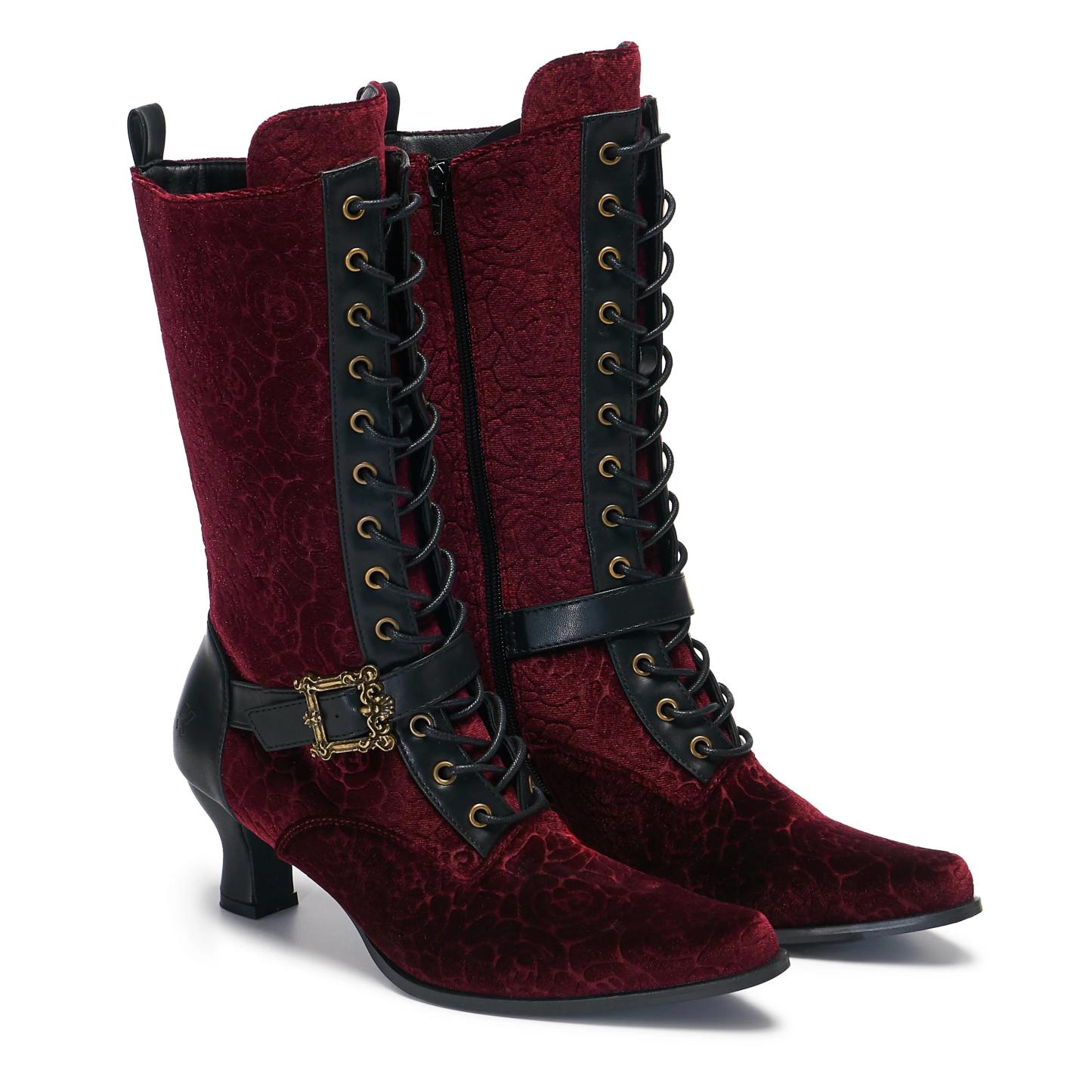 Introducing the Timeless Truths Ornate Victorian Boot, a luxurious blend of vintage elegance and modern craftsmanship. These statement boots are designed to transport you to the charm of the Victorian era, featuring a striking burgundy velvet floral damask upper. A bold, antique-inspired gold buckle enhances the front strap, combining both form and function. The mid-calf design offers a flattering silhouette on a short curved heel and pointed toe for comfort and vintage Victorian poise. A perfect blend of regal sophistication and a touch of gothic refinement.