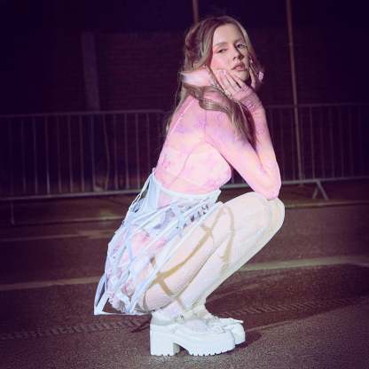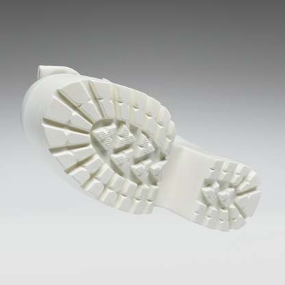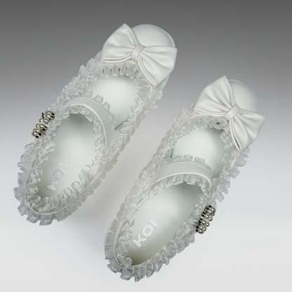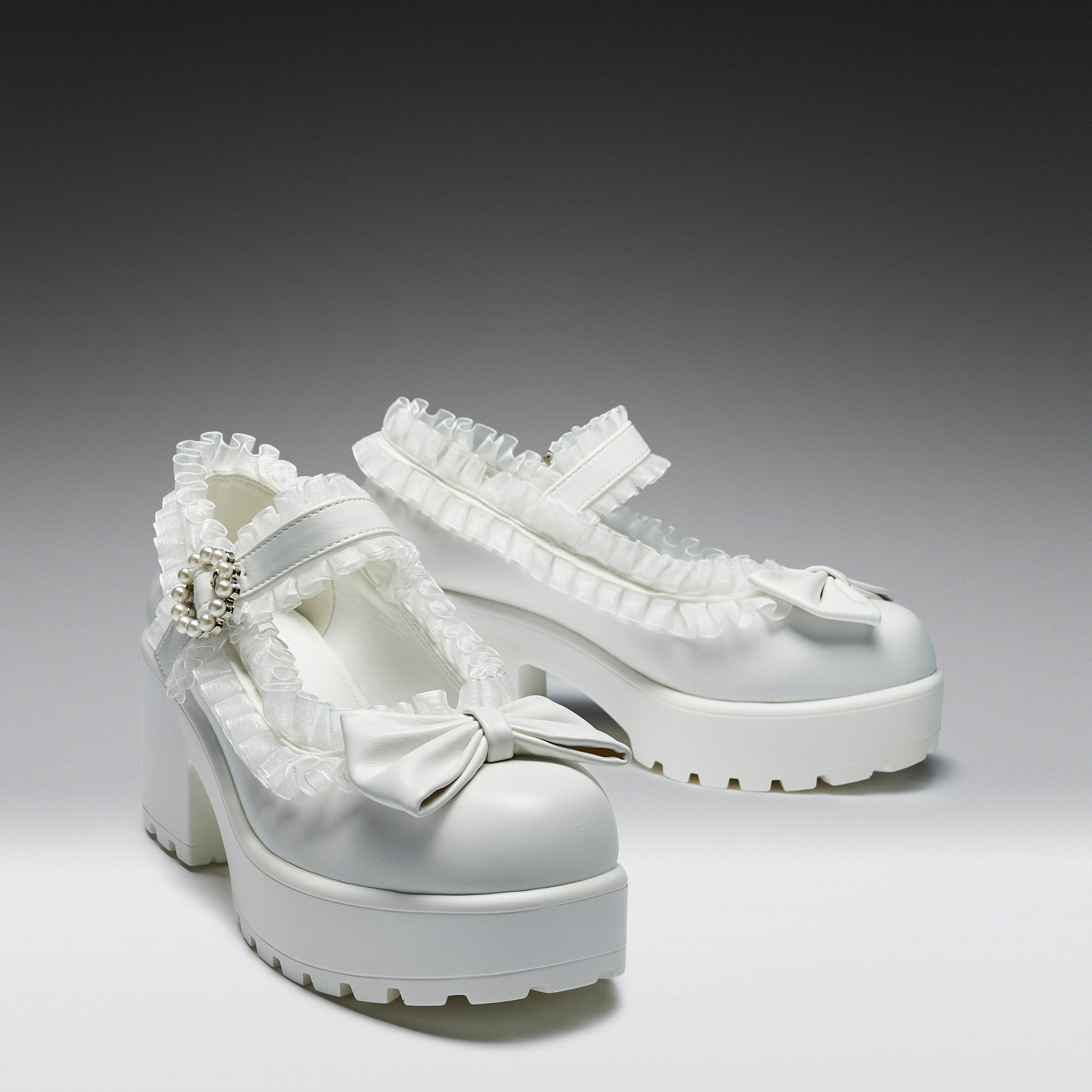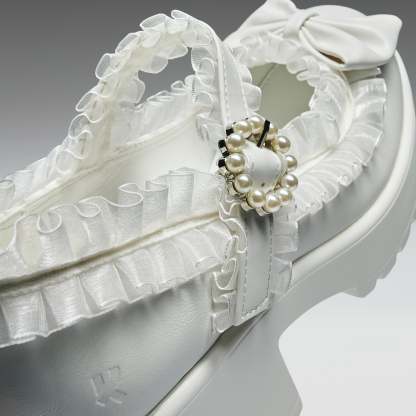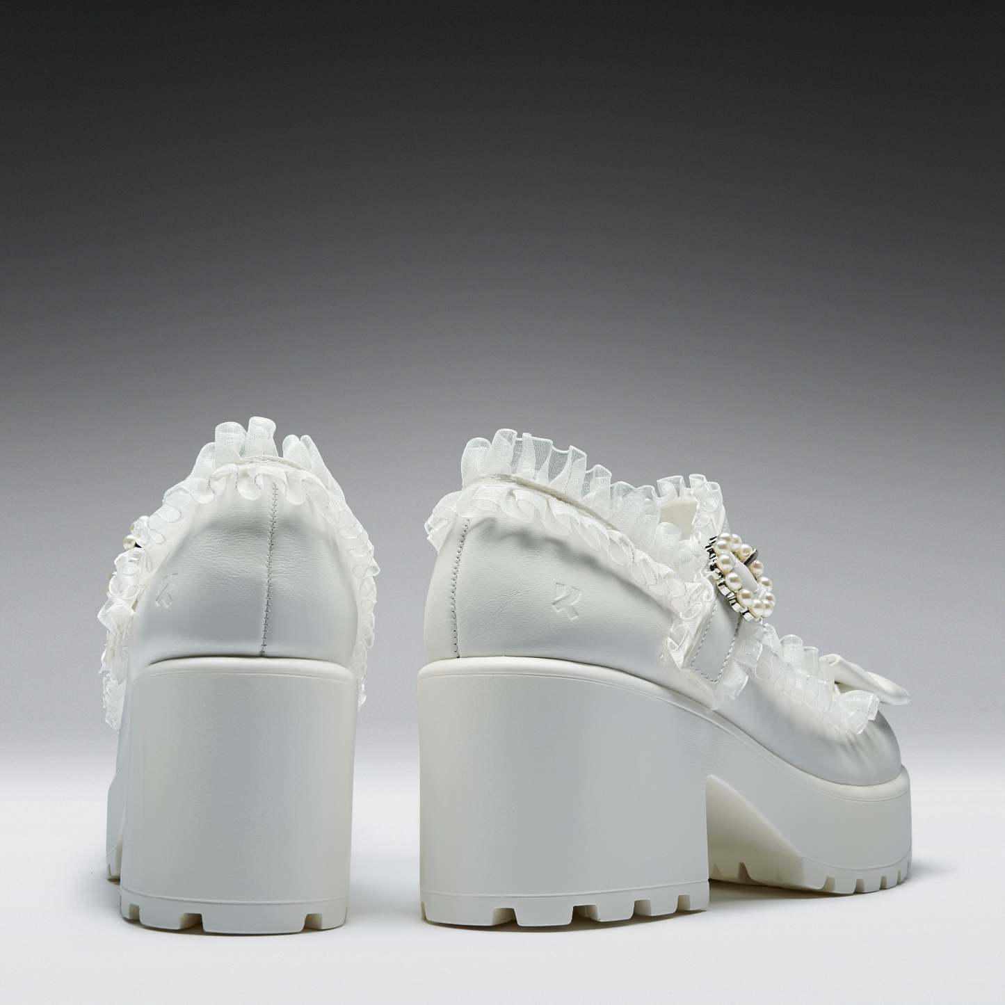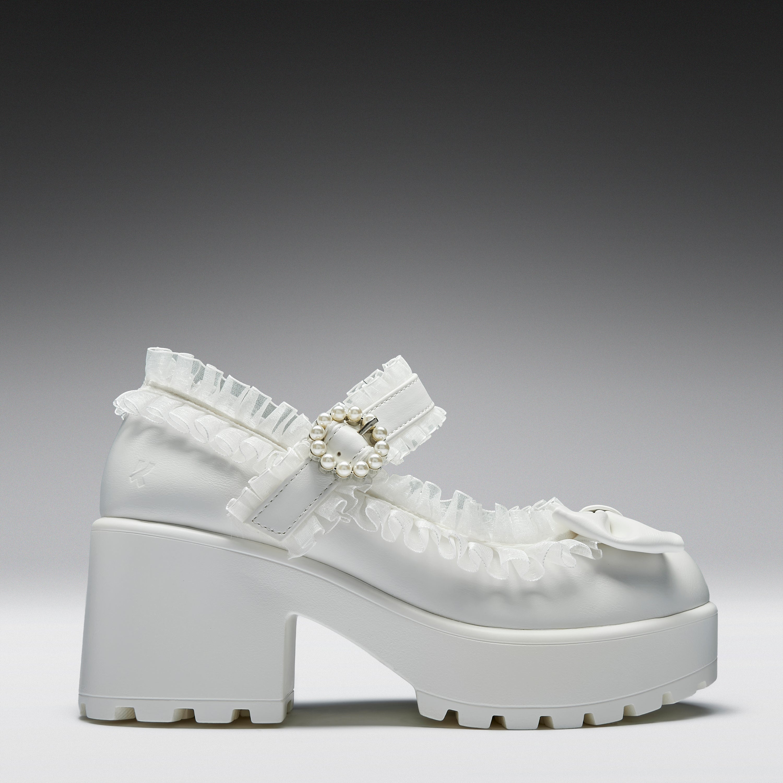 Imagine our iconic Tira Mary Janes, but made into something that resembles what a vintage porcelain doll would wear, featuring hauntingly cute translucent ruffling all around the edges, and across the strap. The white colourway makes this mary jane have a ghostly yet sweet beauty. We tested these internally to ensure the ruffling sits in a comfortable position. The bow on the front is stitched on and in matching faux leather calling back to the vintage inspiration. The circular pearl buckle creates a glistening allure whenever it catches the light just right.
