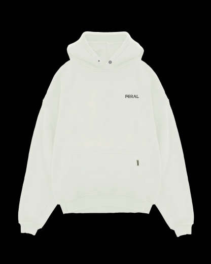 Feral hoodie features an oversized fit and is crafted from ultra-soft, heavyweight french terry cotton for lasting quality. It comes with ribbed hems and cuffs, along with FERAL LOGO on chest and HOT GIRLS LIKE TECHNO on back. The Cobrax snap button adds a unique touch.