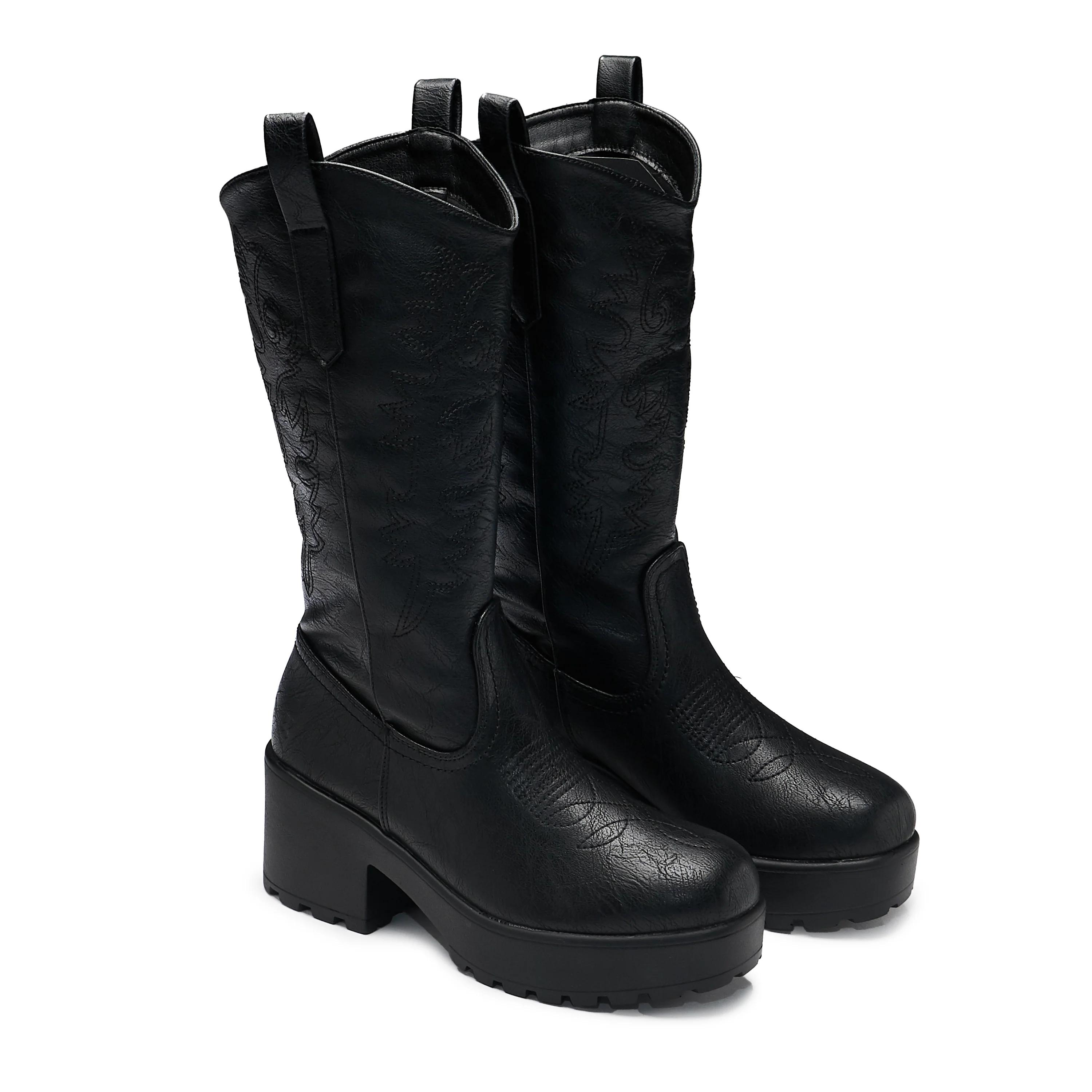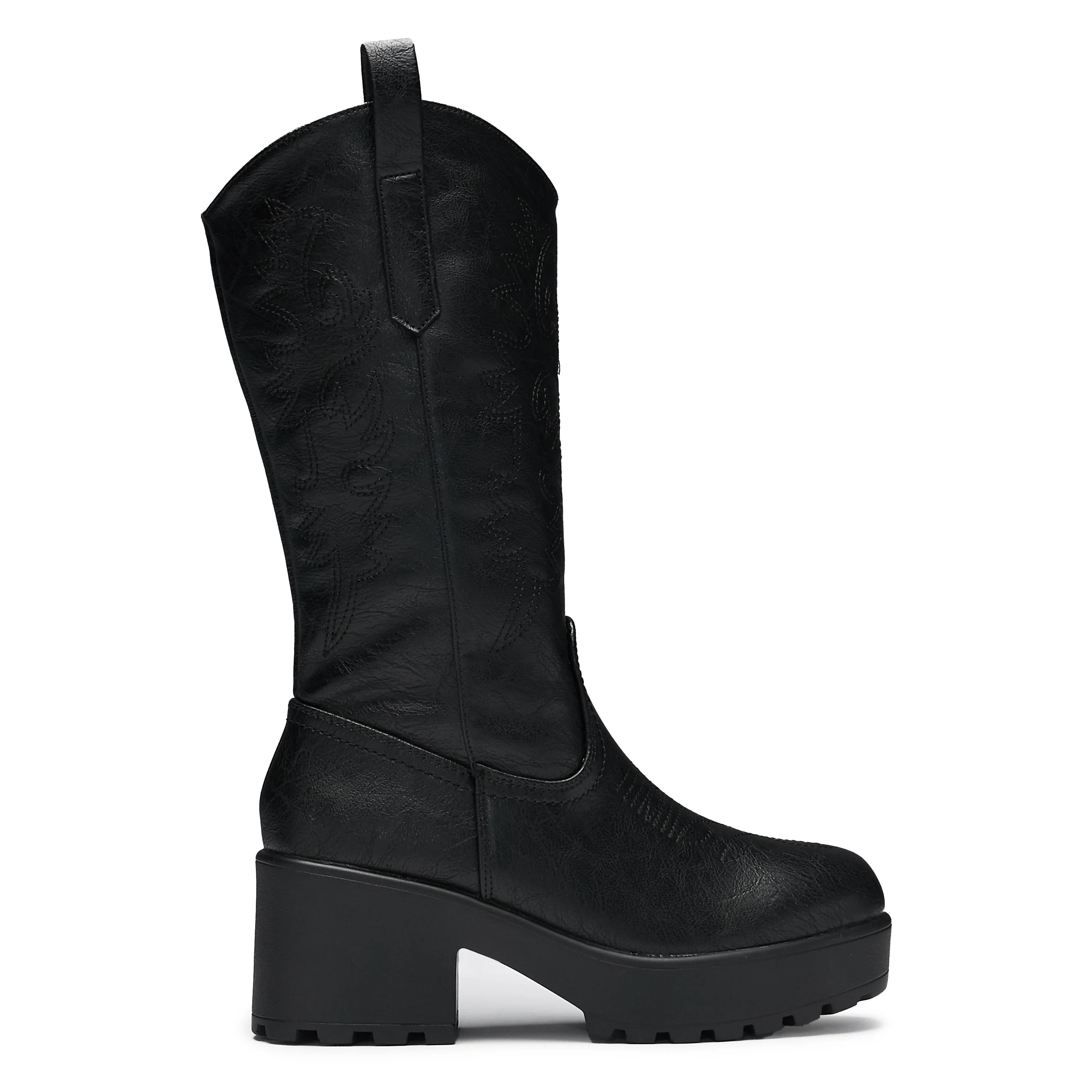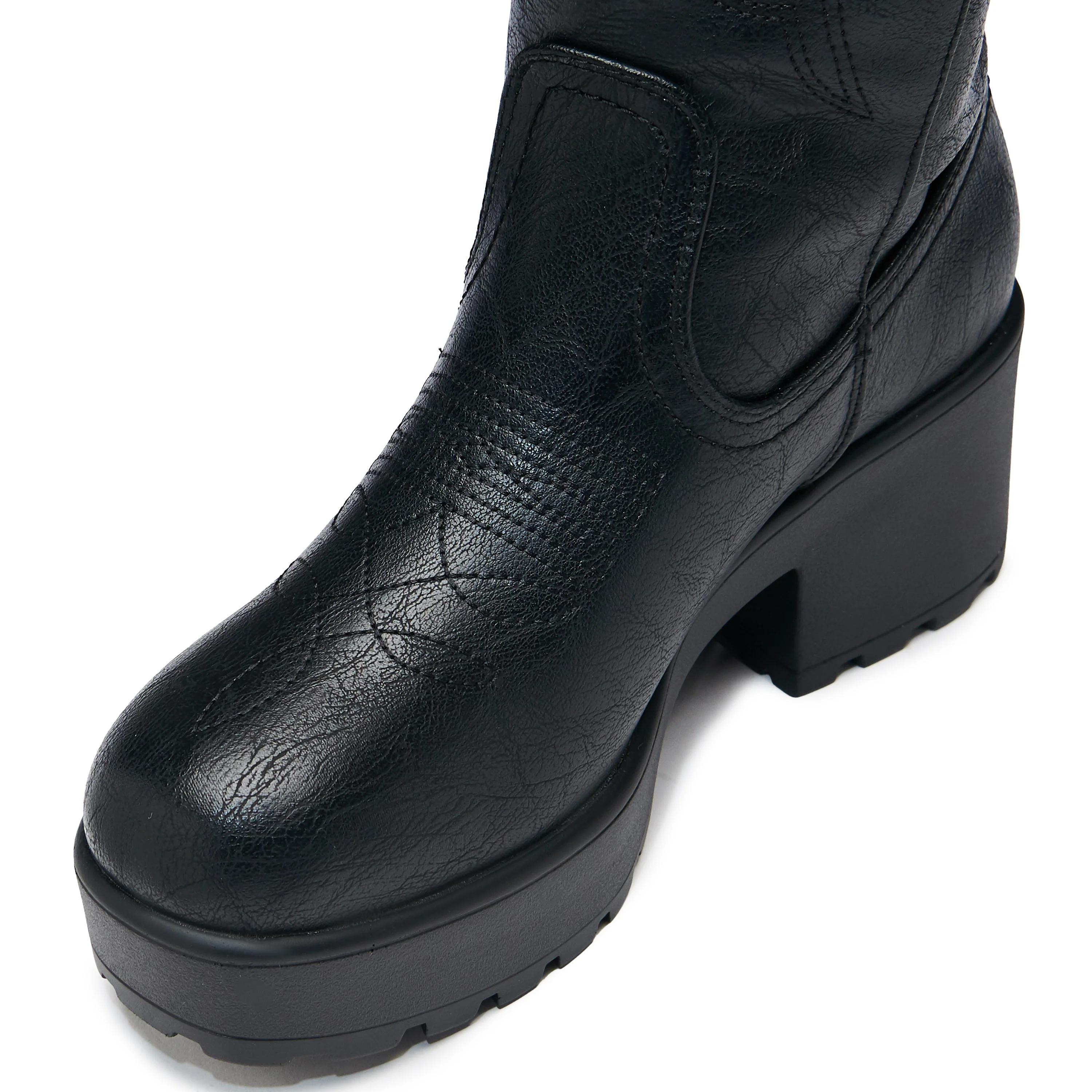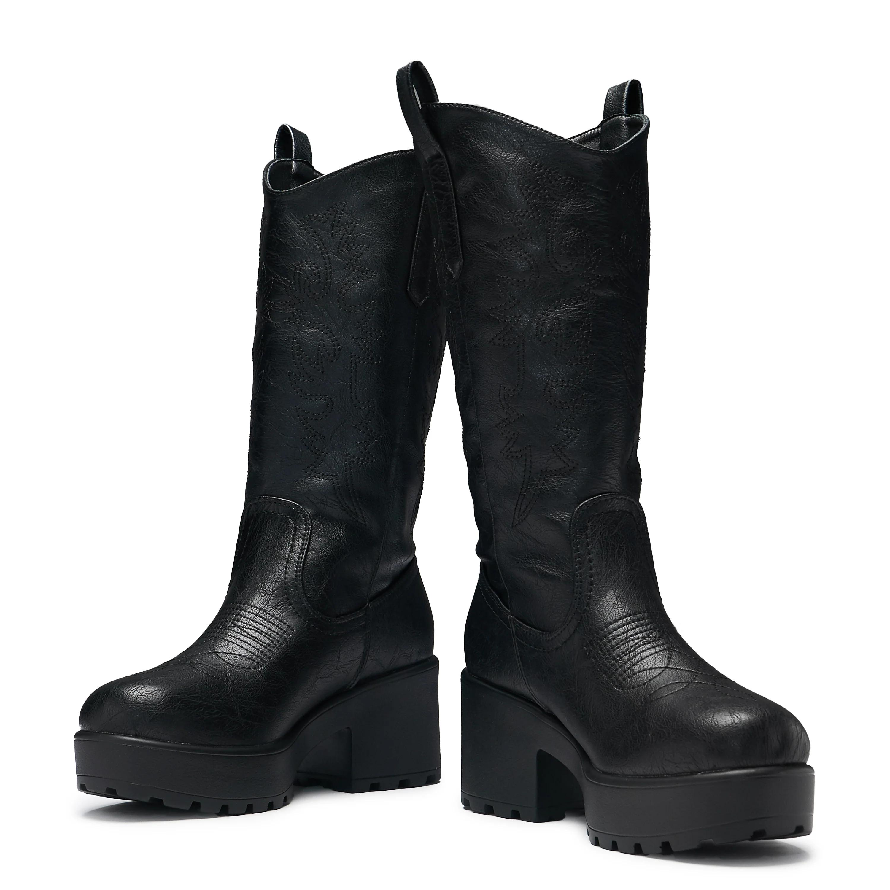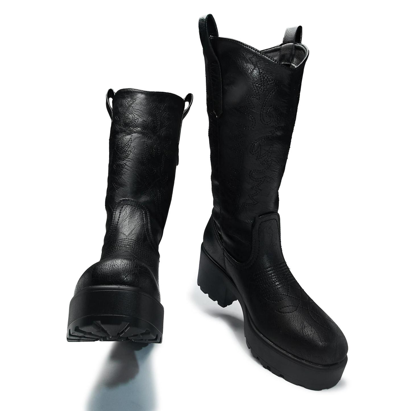 The WINTU boots are KOI��s edgy take on the classic cowboy boot, now available in this sleek, all-black edition. After becoming a sell-out staple in AW23, we knew we had to bring these back as a limited release. Crafted from a durable, vintage-inspired material, these boots have that lived-in, rugged look while staying timeless. The intricate stitched pattern along the sides nods to traditional Western craftsmanship, adding just the right amount of detail without overpowering the sleek design. With KOI��s signature chunky platform, these boots bring the perfect balance of vintage and modern.