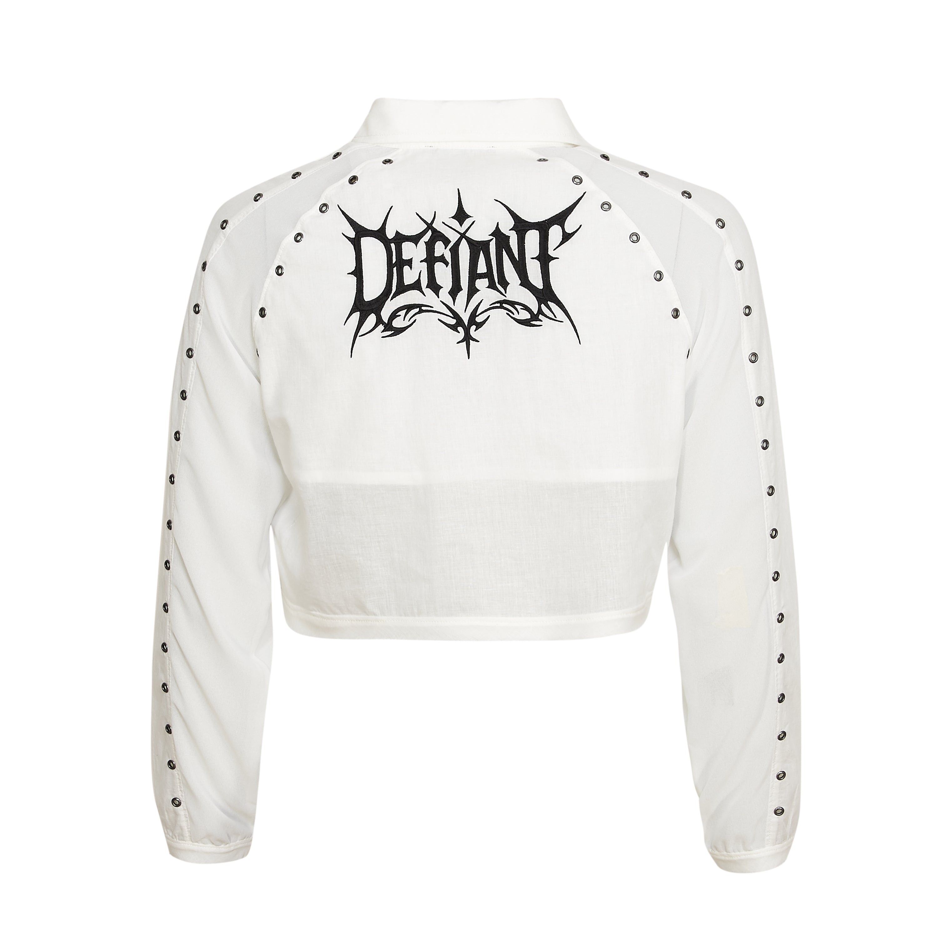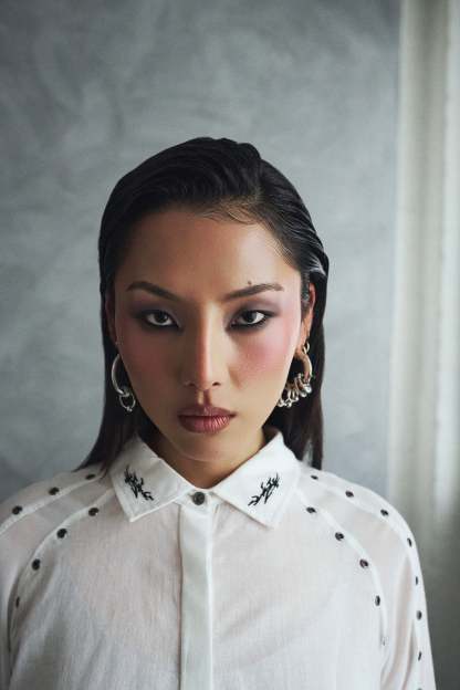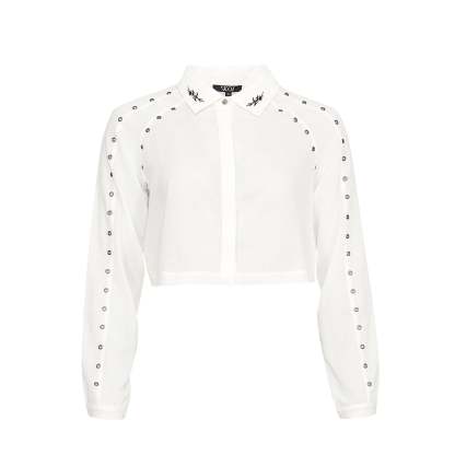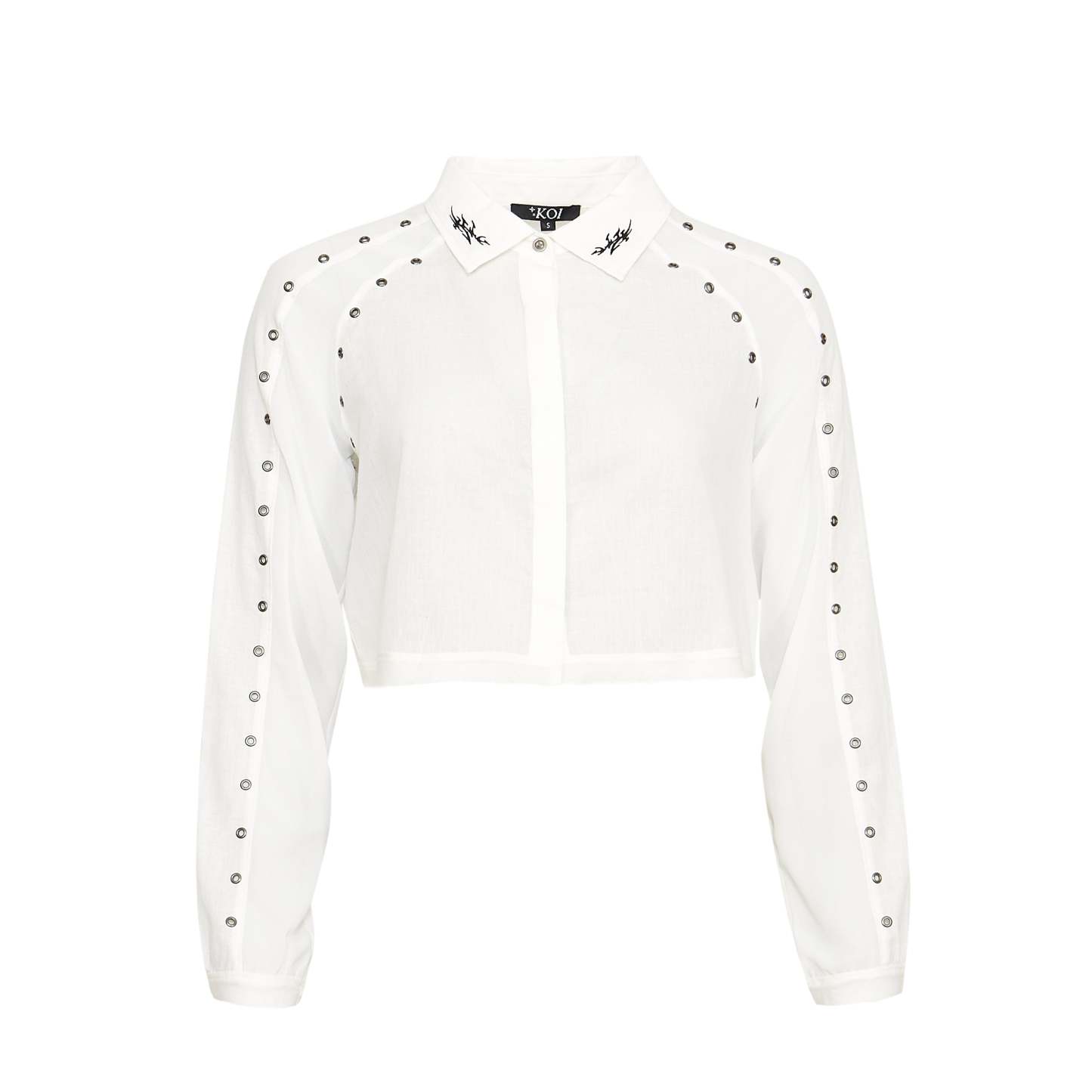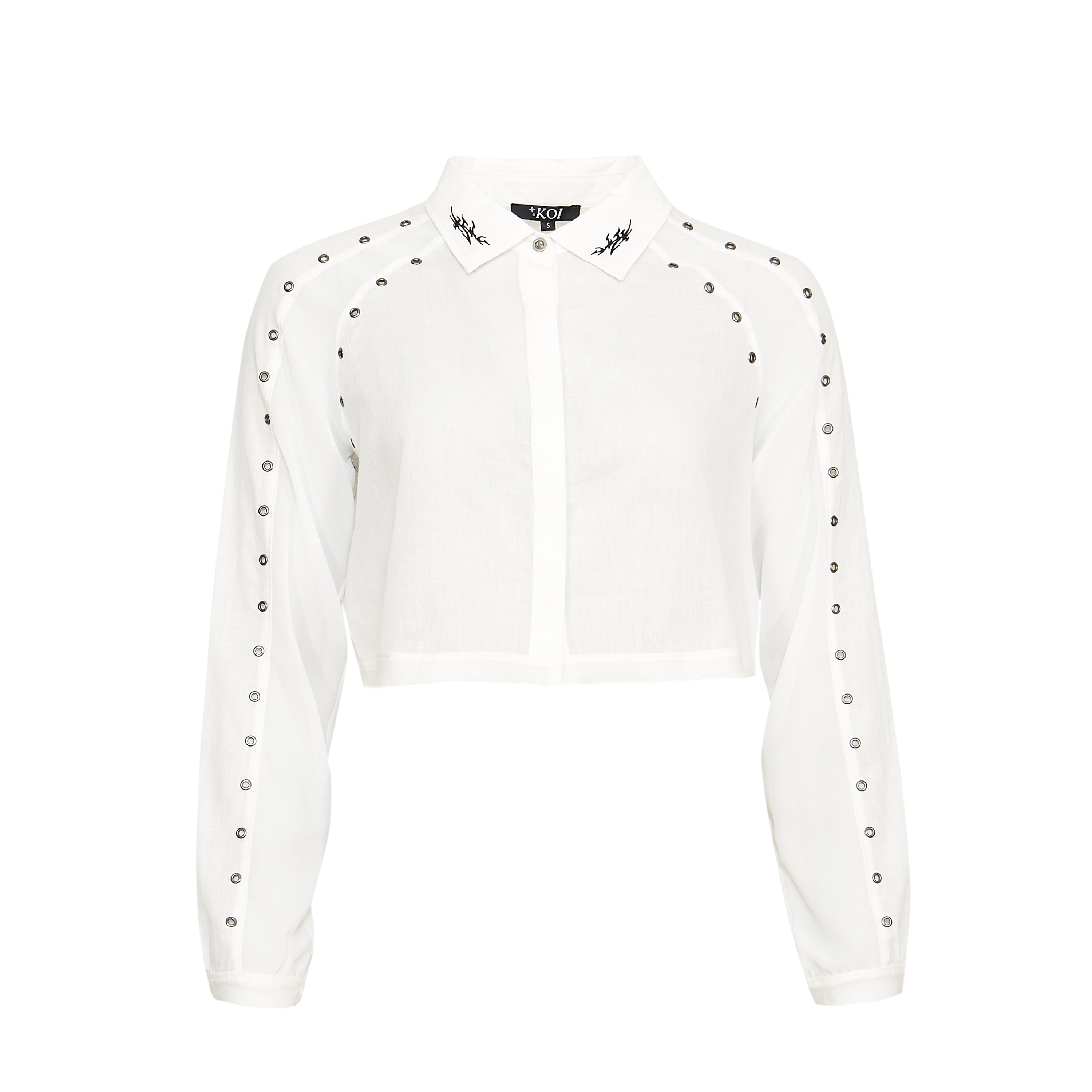A cropped white shirt with eyelet detailing and embroidered collar tips, because we wanted a wardrobe staple that still felt like KOI.