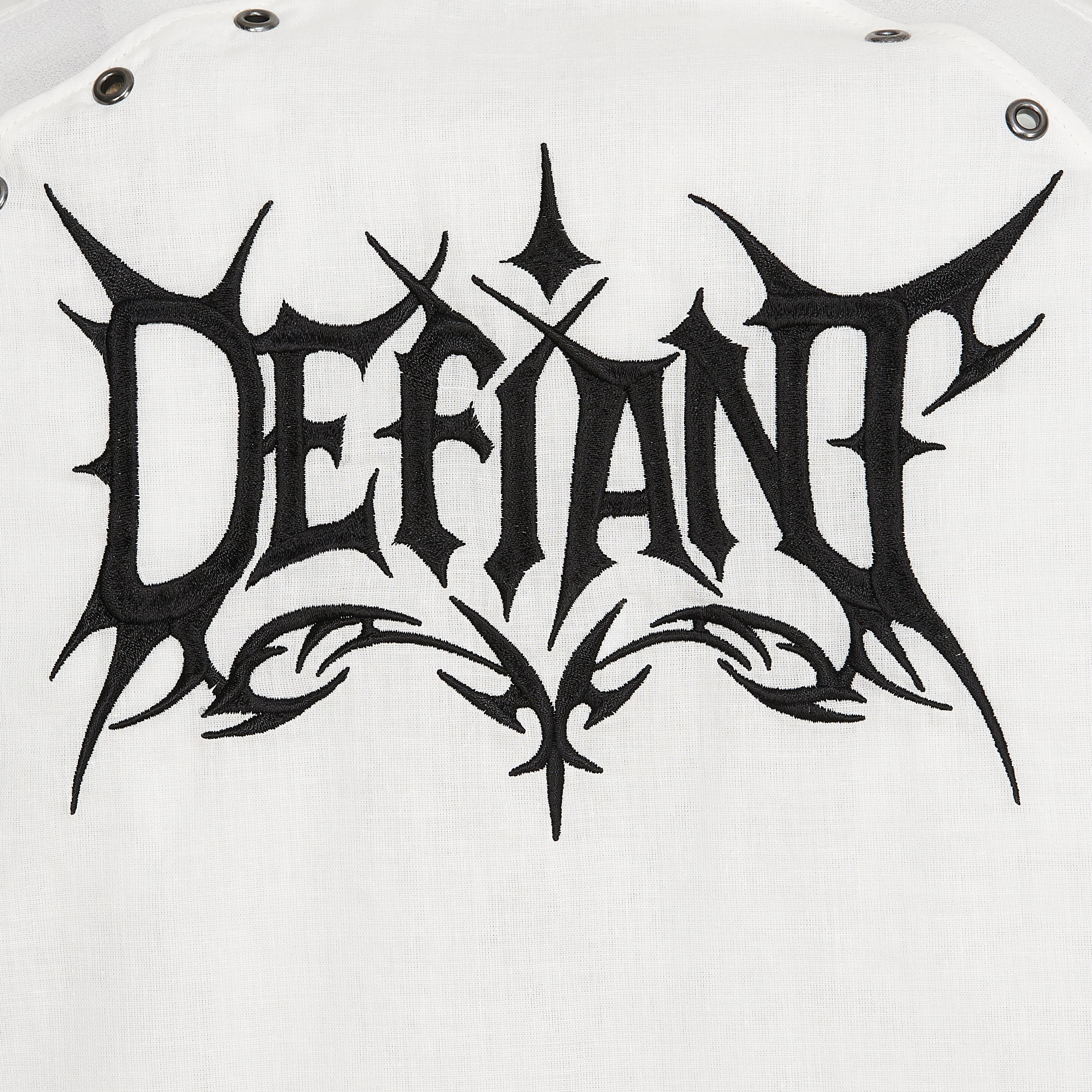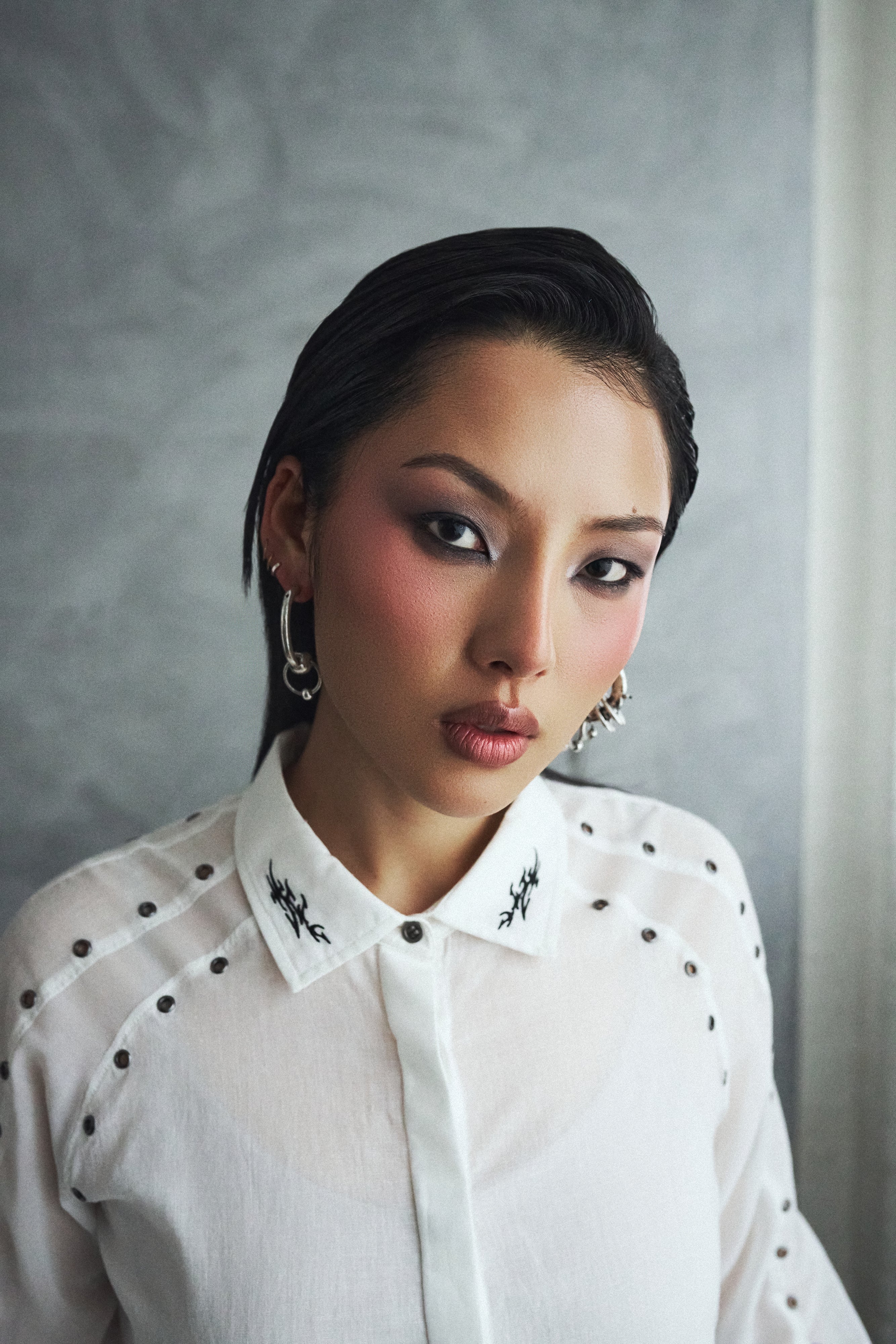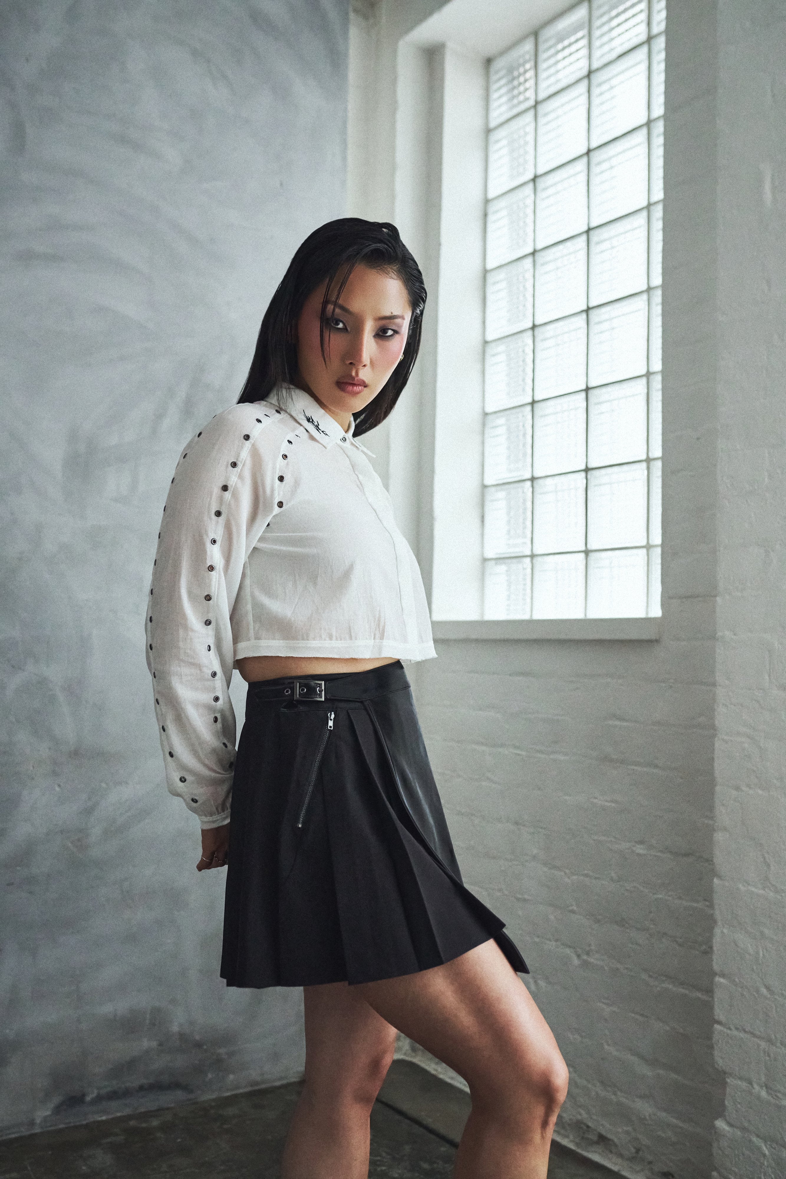 A cropped white shirt with eyelet detailing and embroidered collar tips, because we wanted a wardrobe staple that still felt like KOI.
